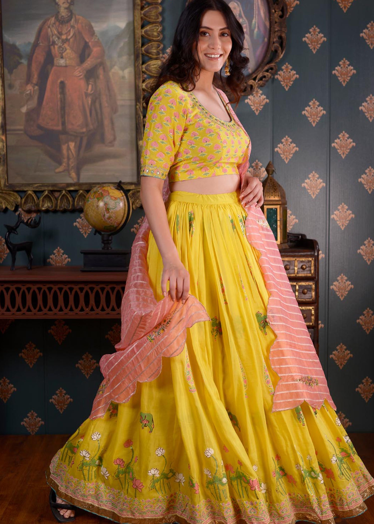 Lemon Yellow Printed Cotton Silk Lehenga Set With Dupatta