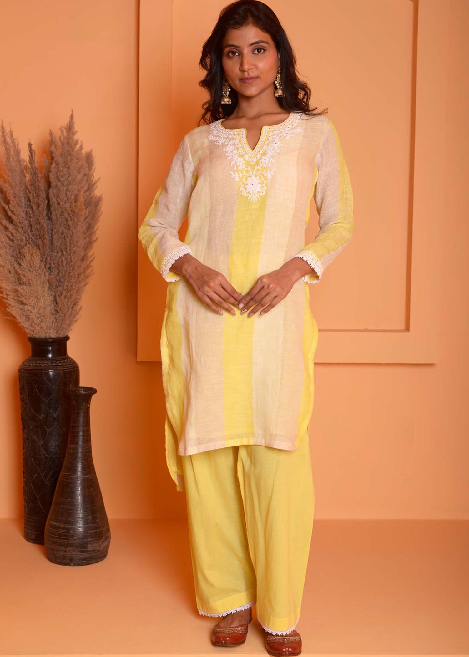 Light Yellow Linen Embroidery Kurta Set With Pant