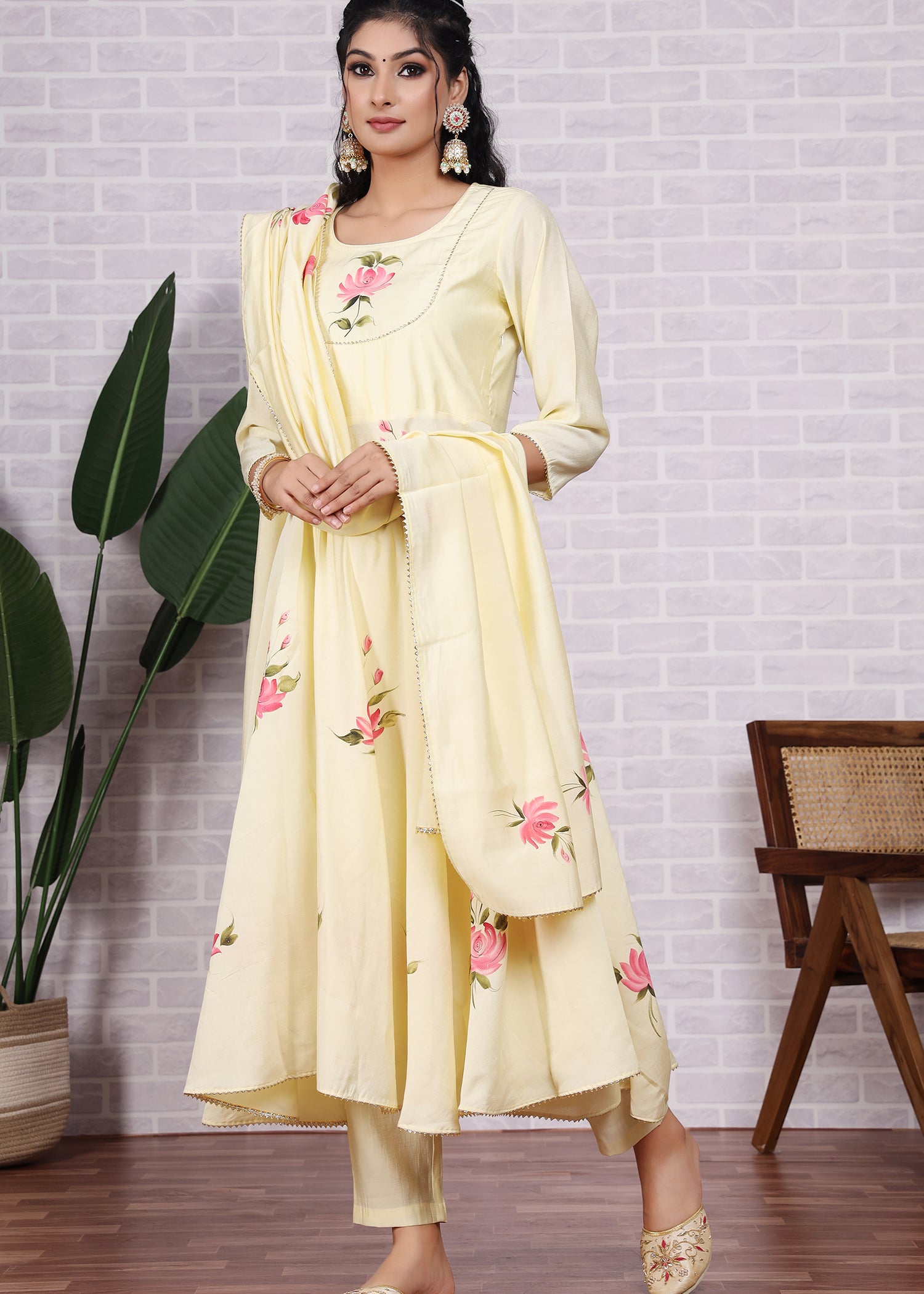 Light Yellow Hand Painted Modal Silk Kurta Set