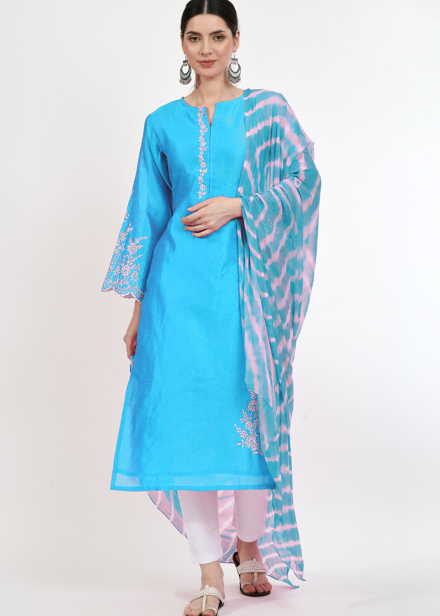 Capri Blue Raw Silk Floral Embroidered Kurti Set