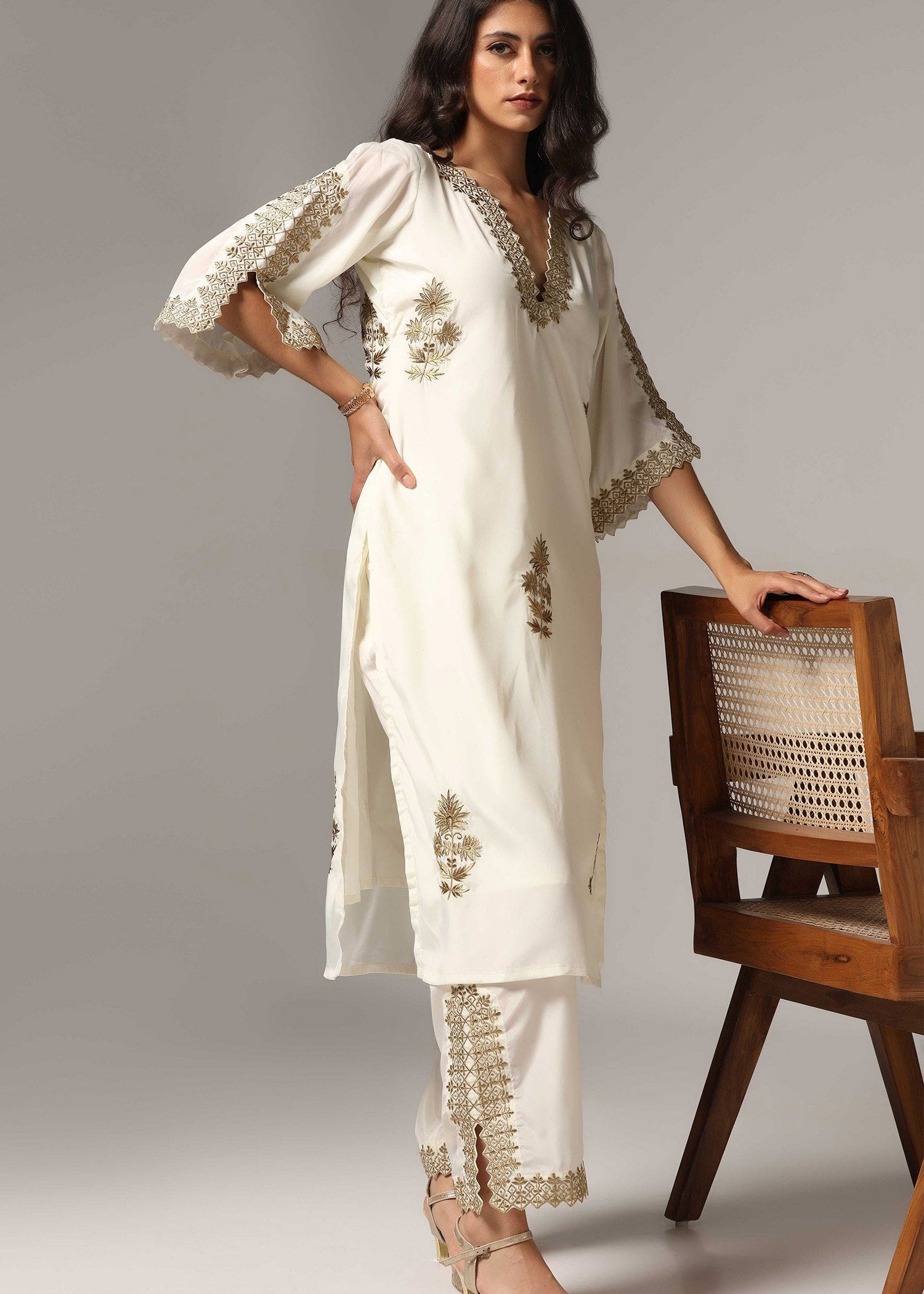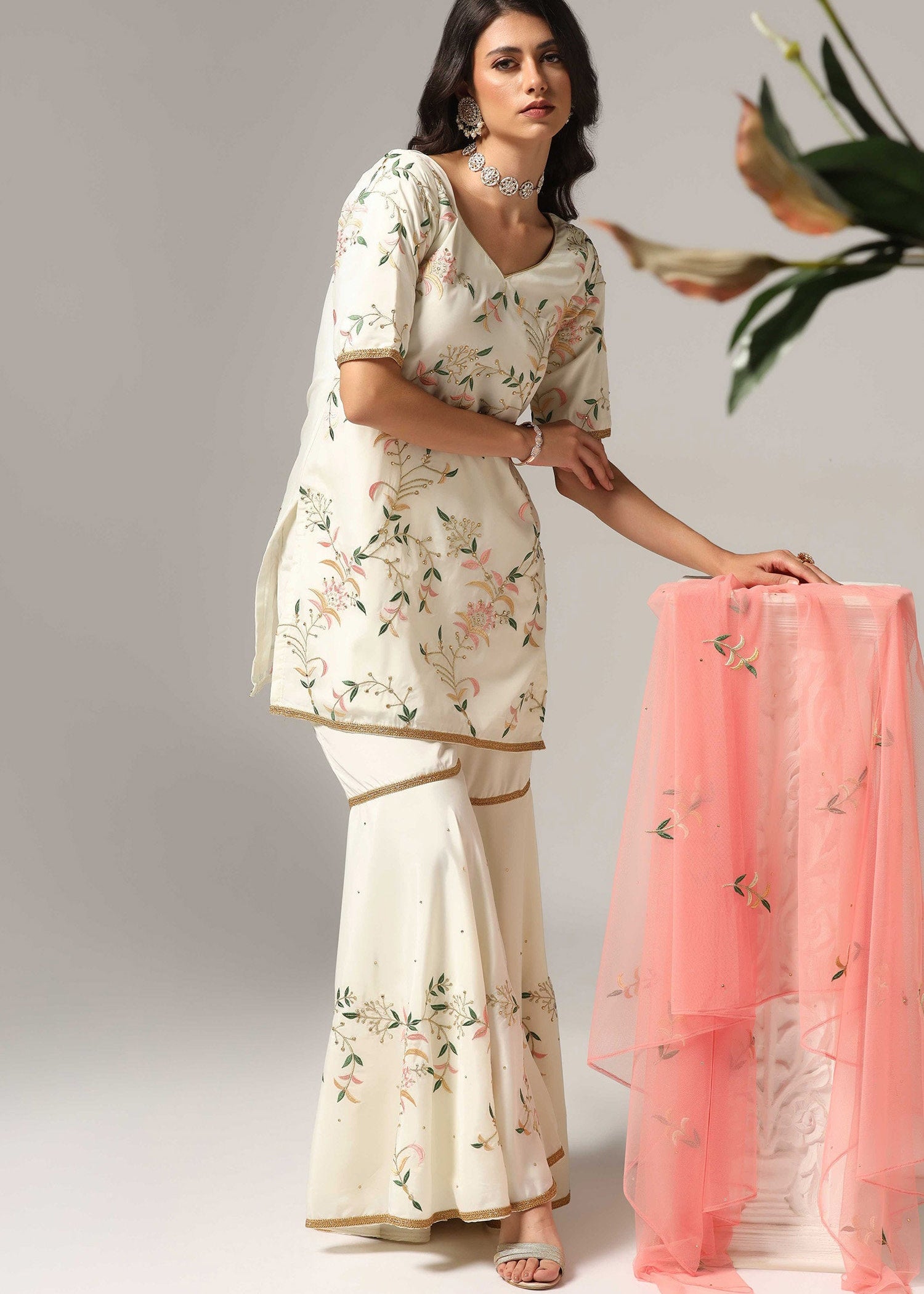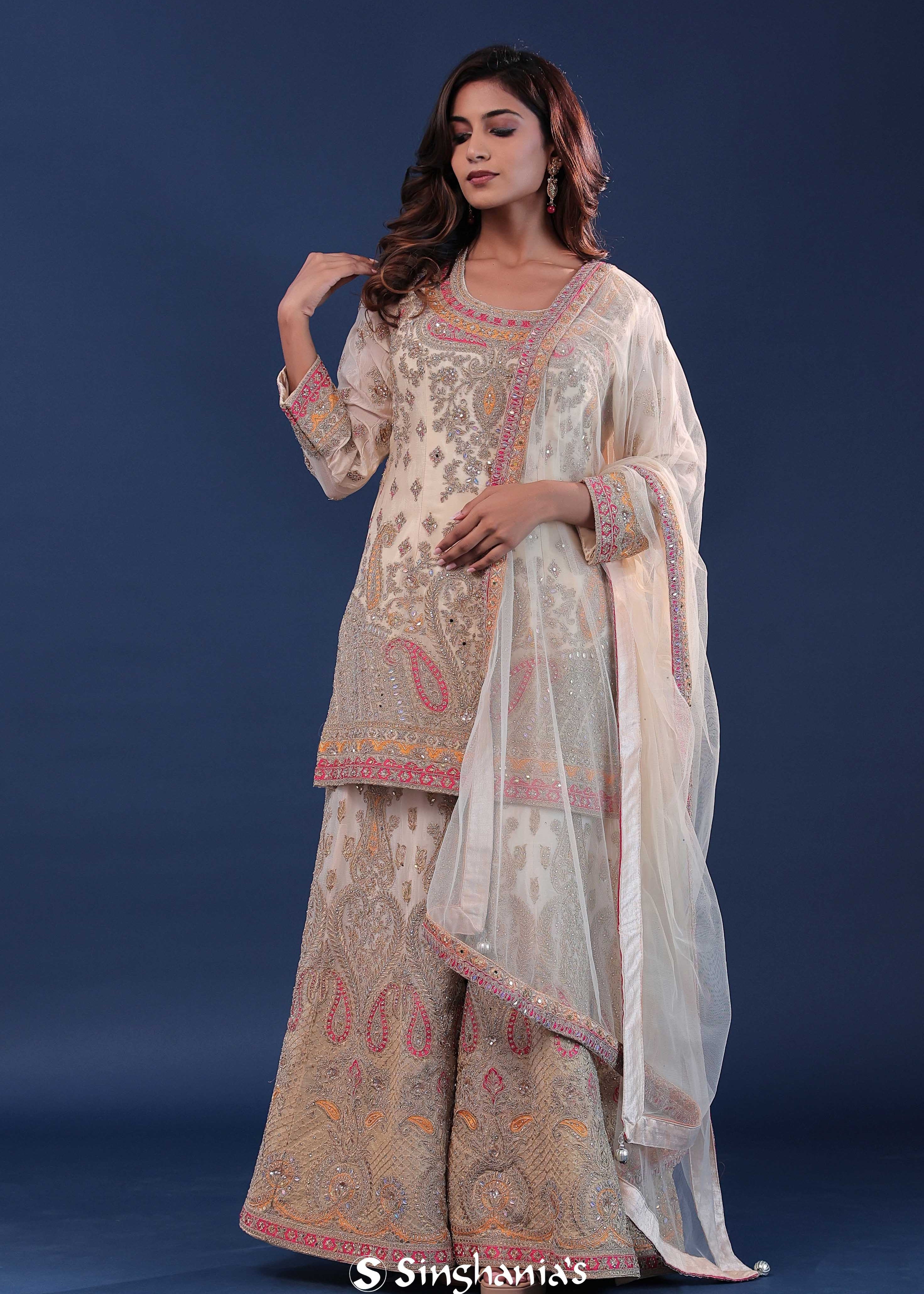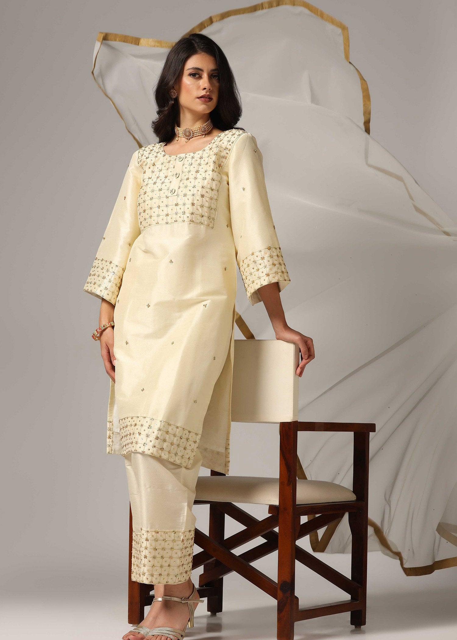 Cream Raw Silk Kurti With Palazzo Pants And Dupatta