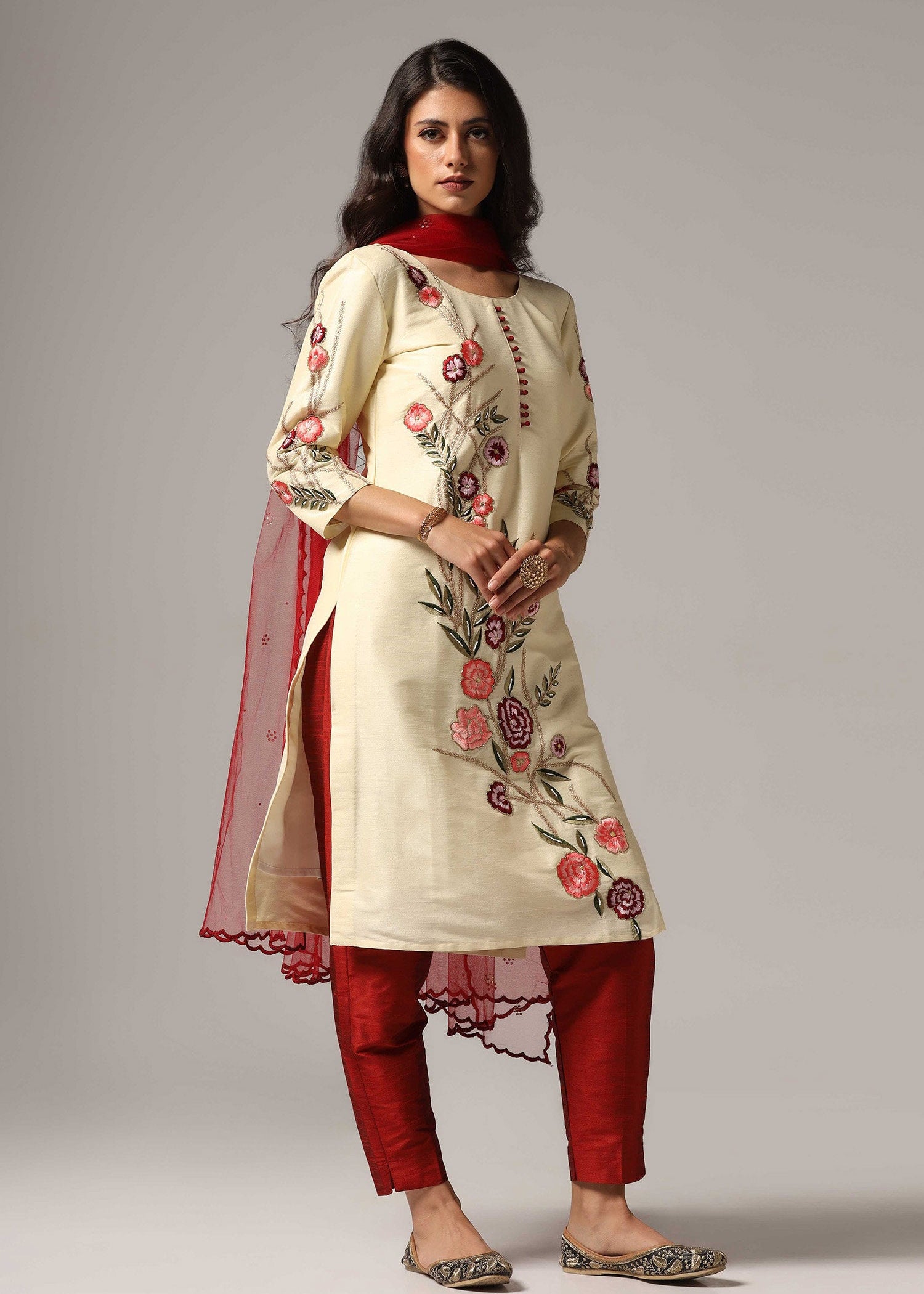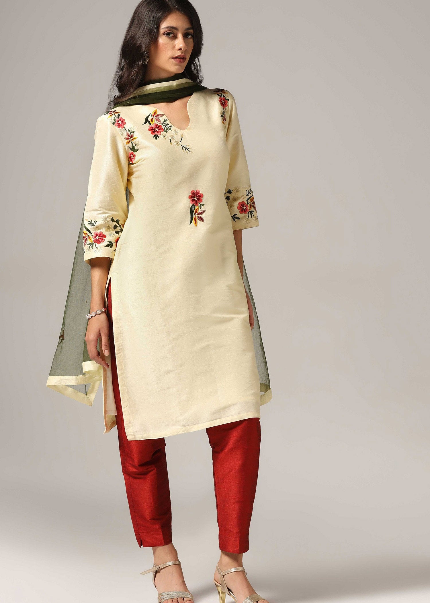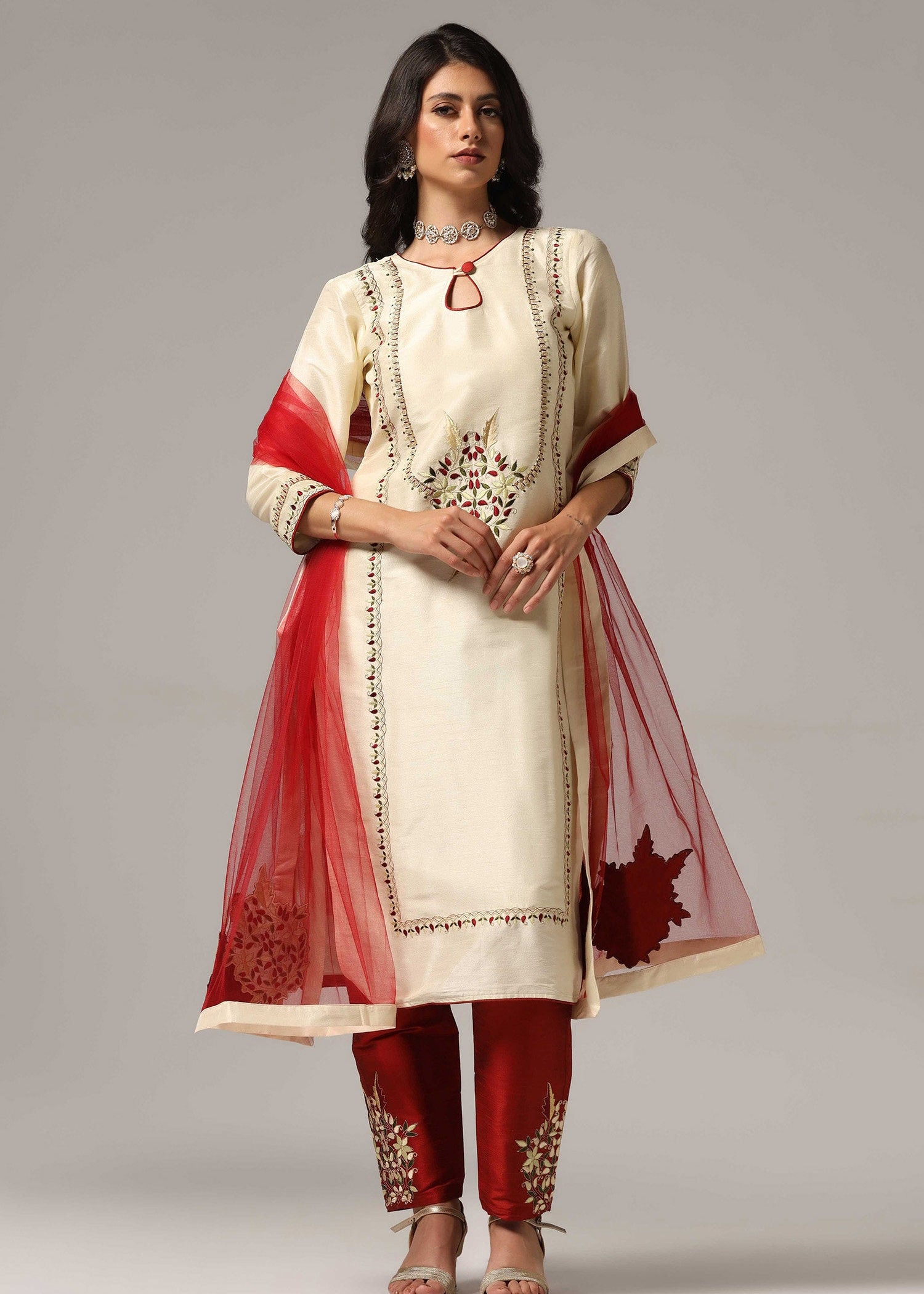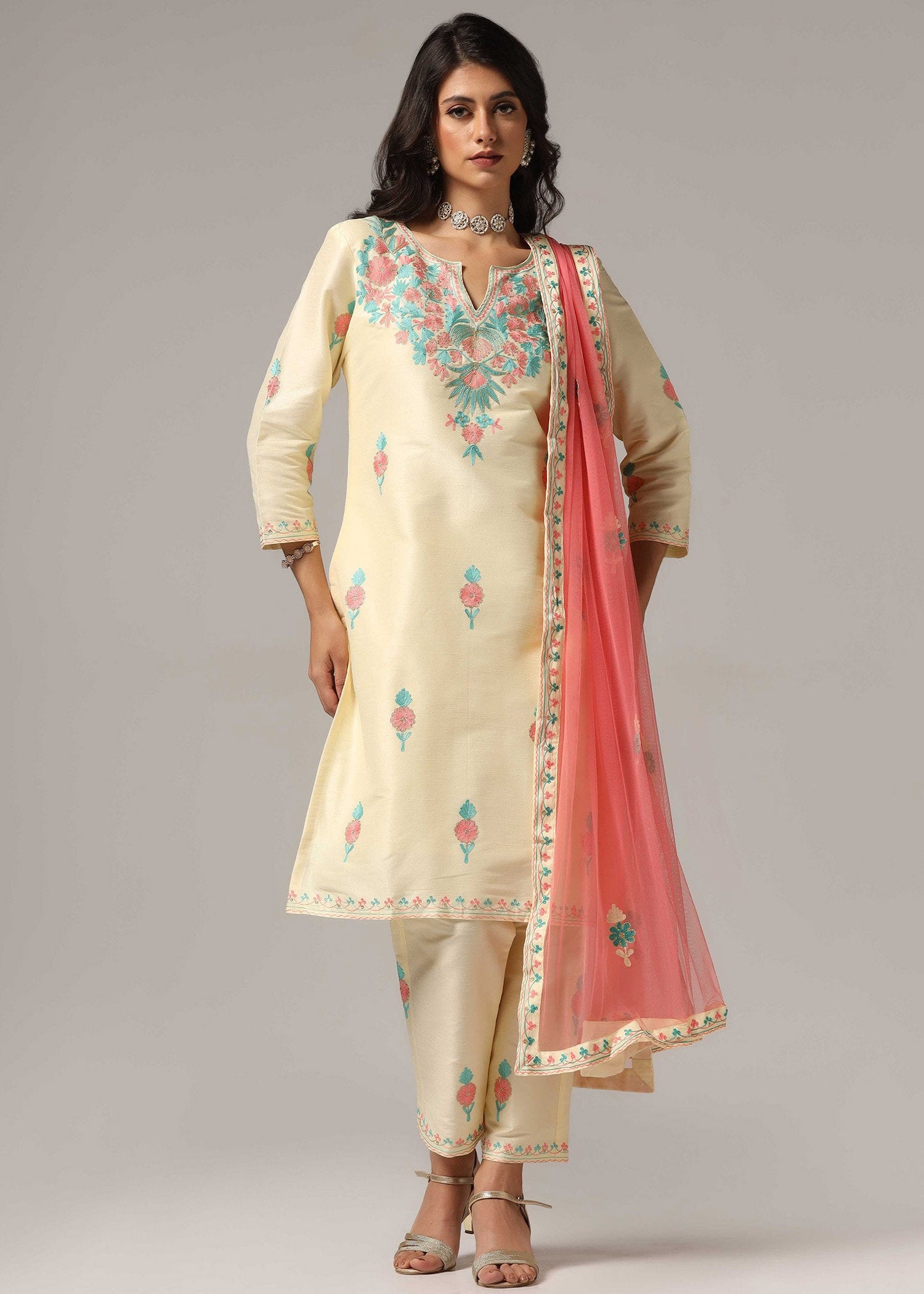 Cream Raw Silk Kurti With Pants And Netted Dupatta Set