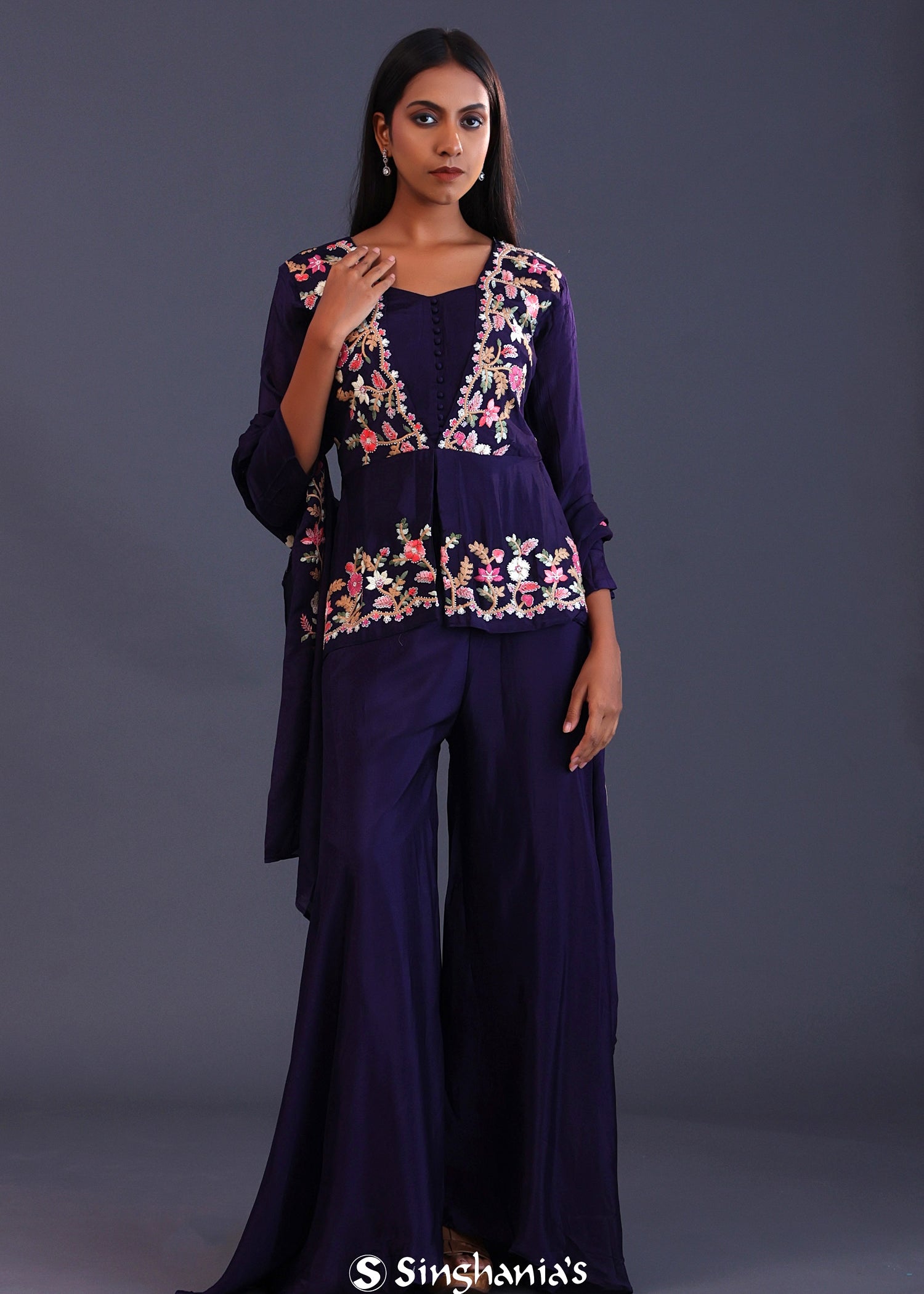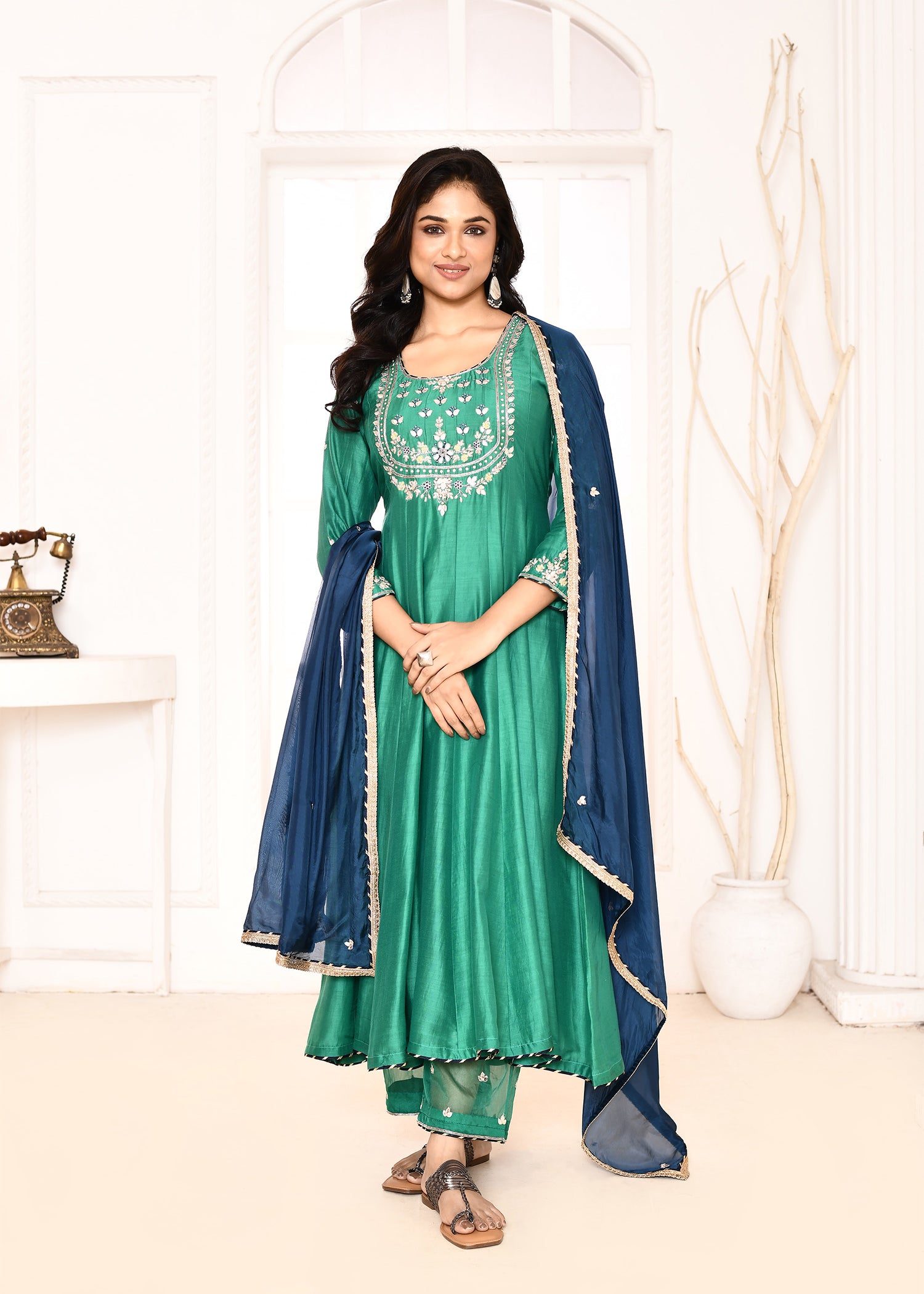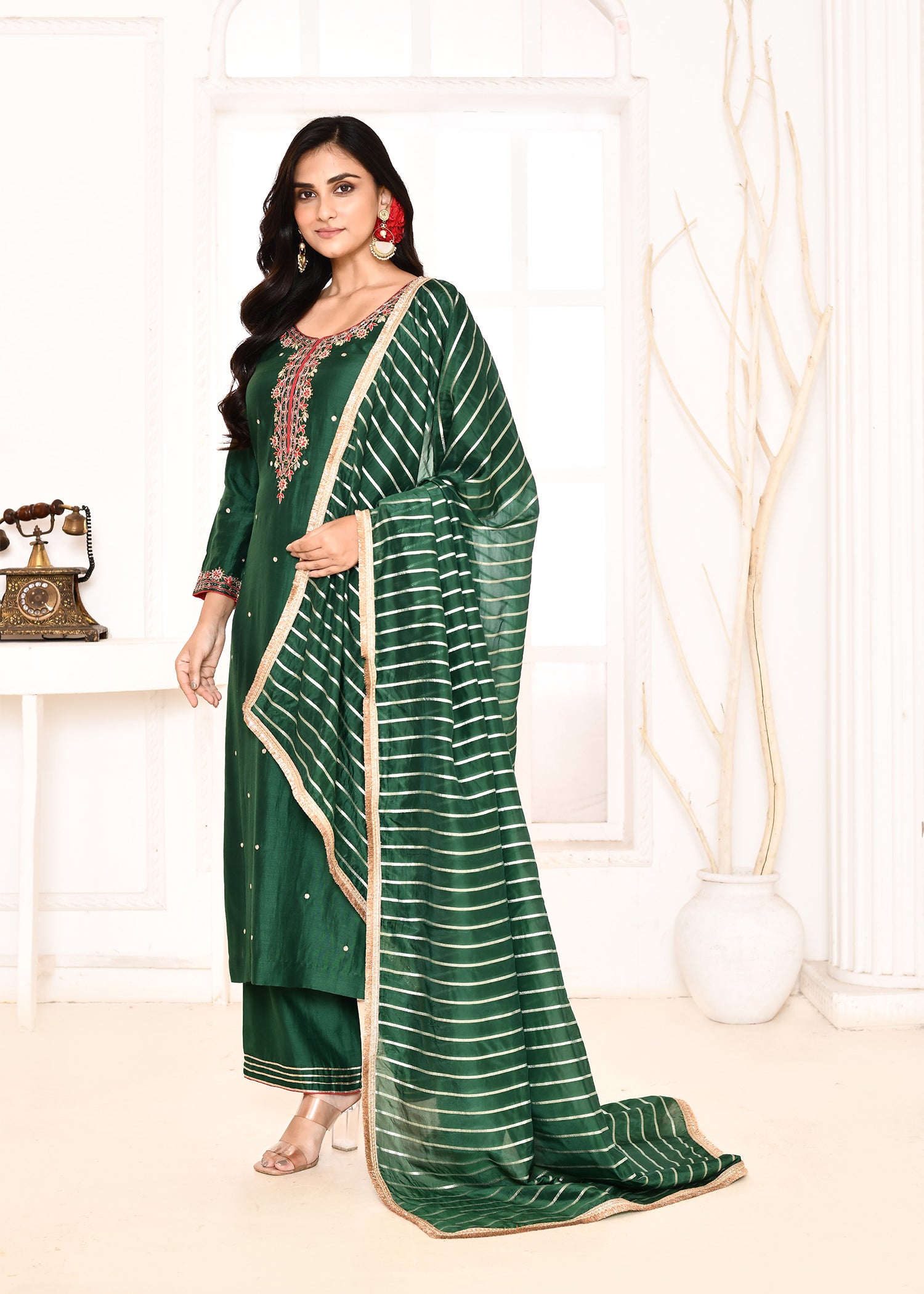 Dark Green Hand Embroidered Straight Kurta And Palazzo With Navy Blue Dupatta