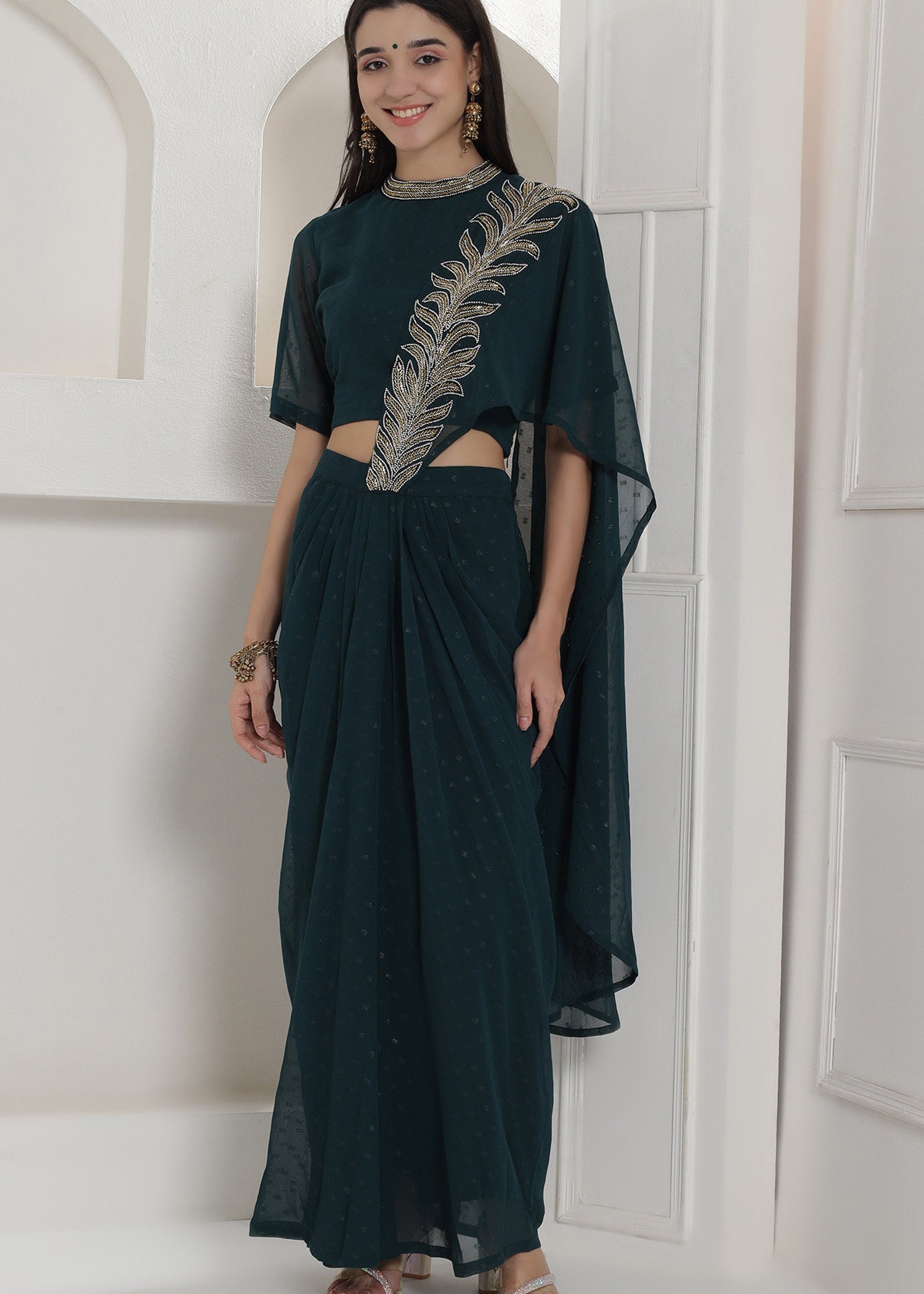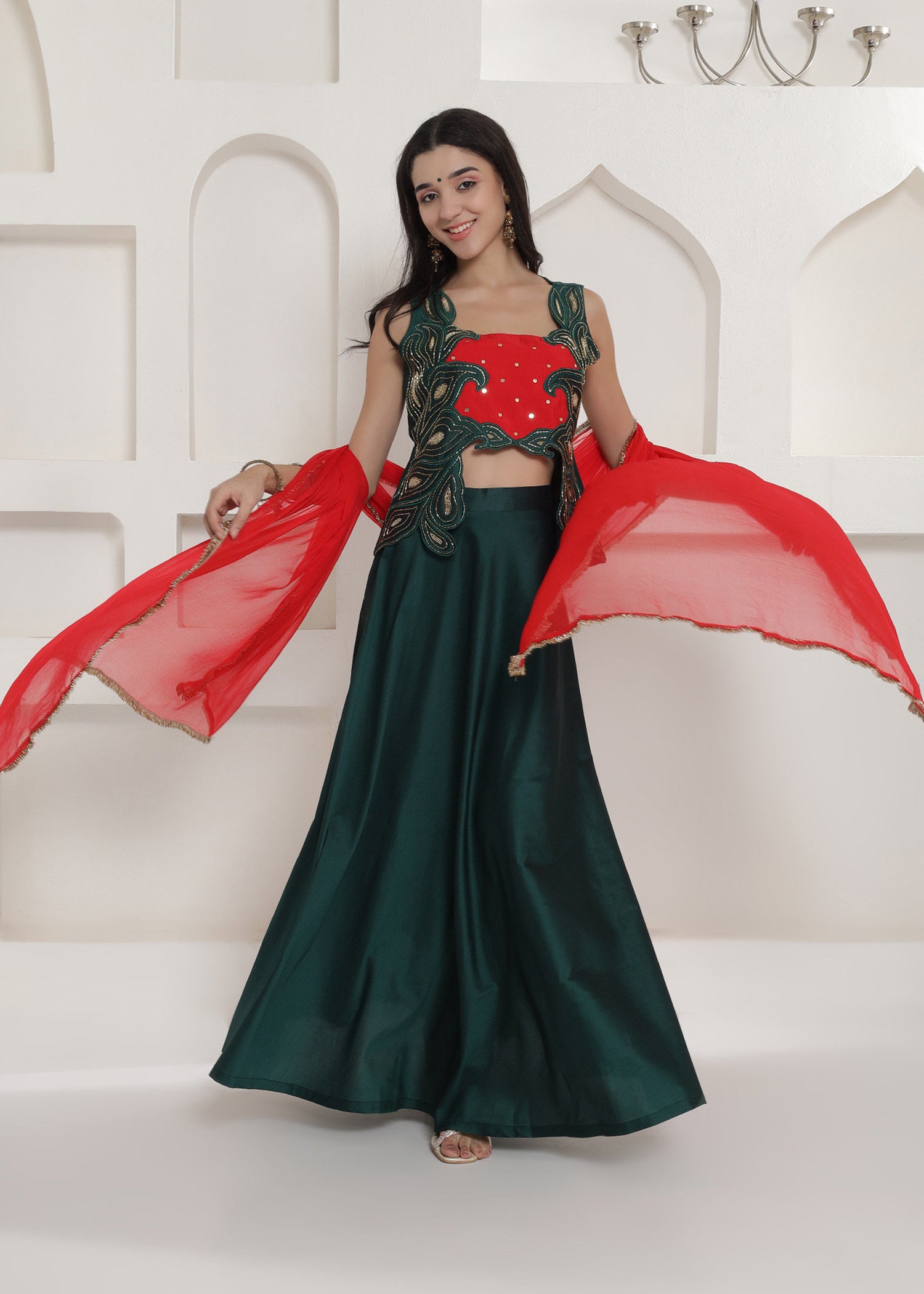 Dark Green Tafta Silk Lehnga Top And Dupatta Set