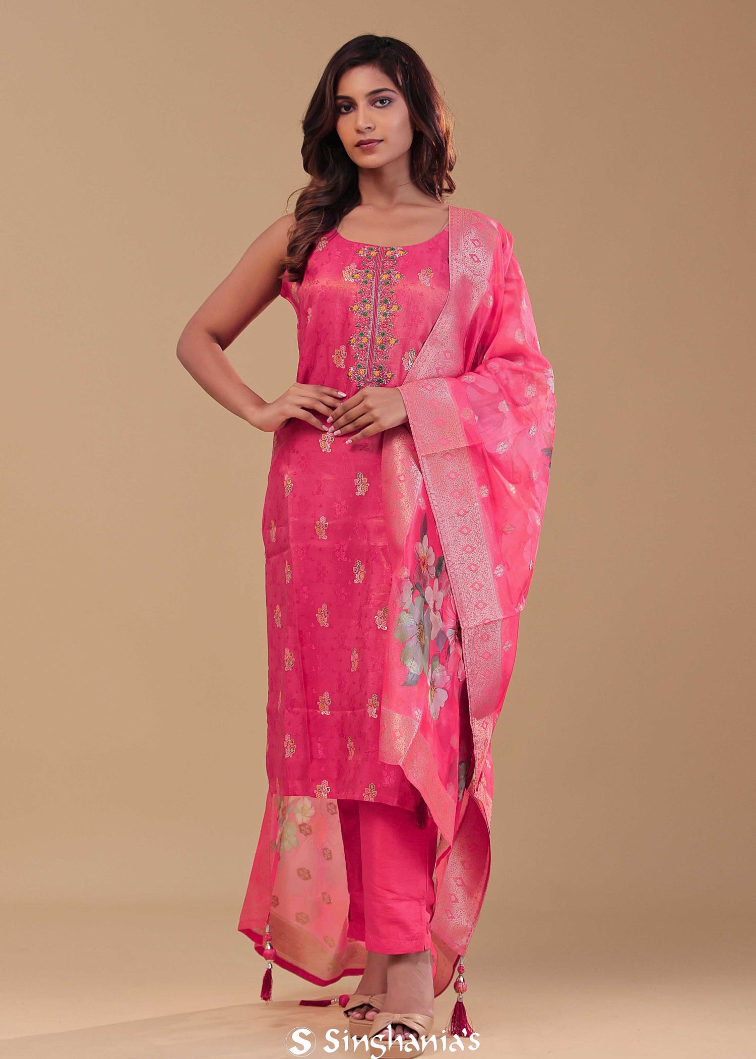 Deep Pink Soft Chanderi Silk Saree With Embroidery Work