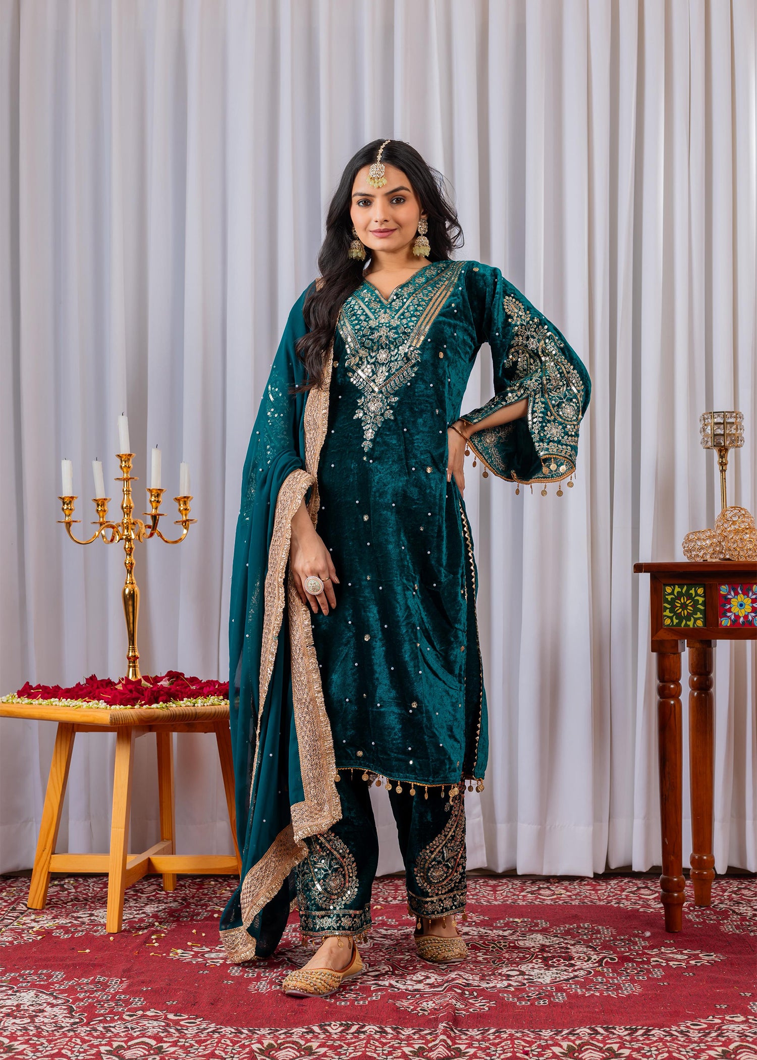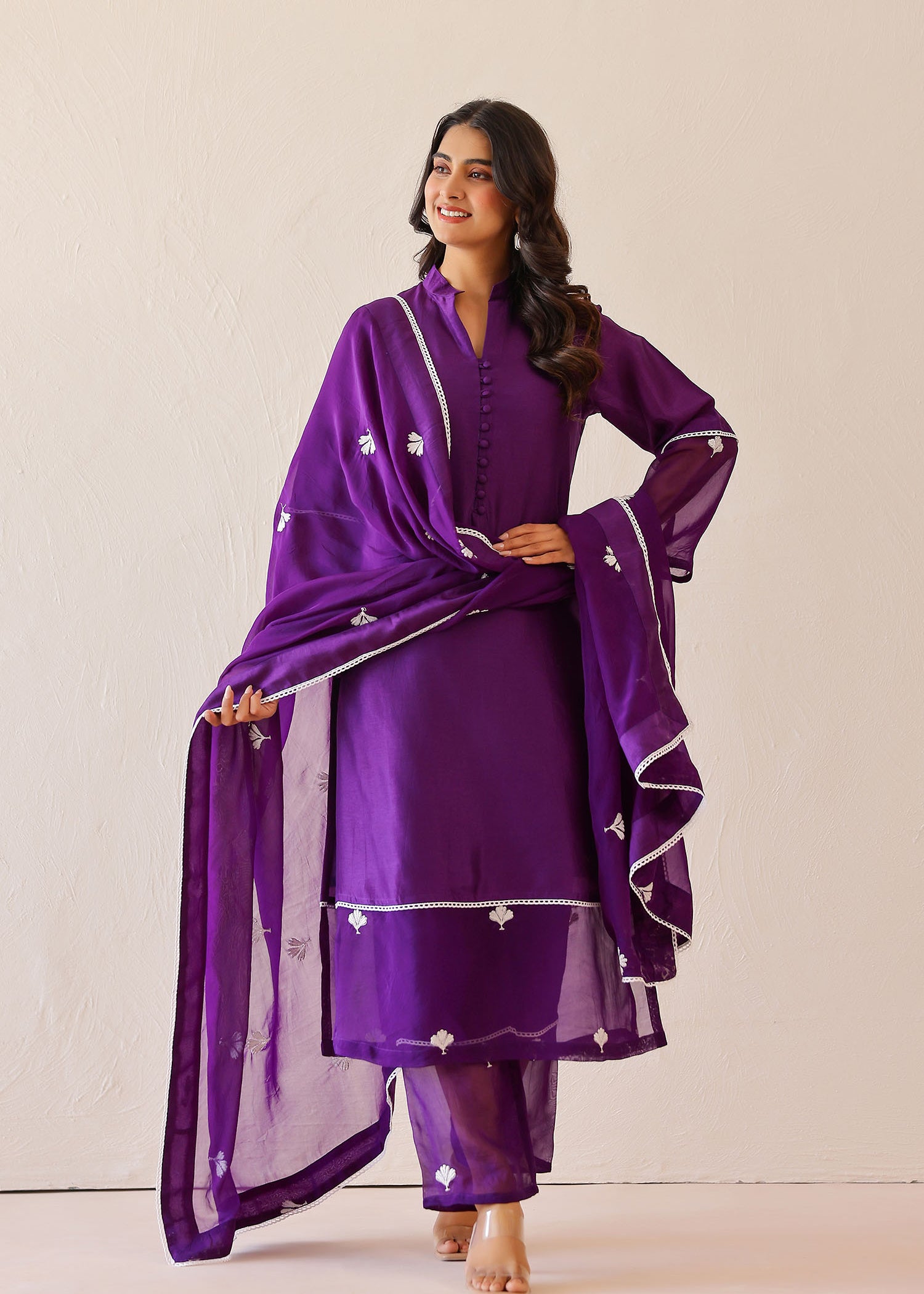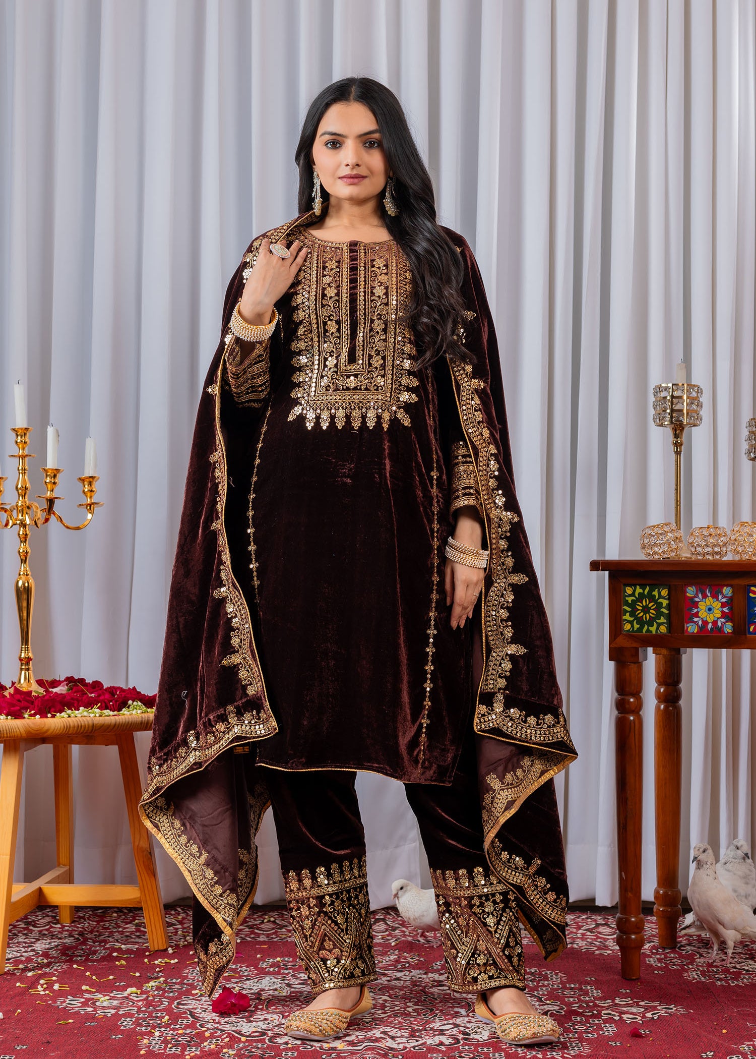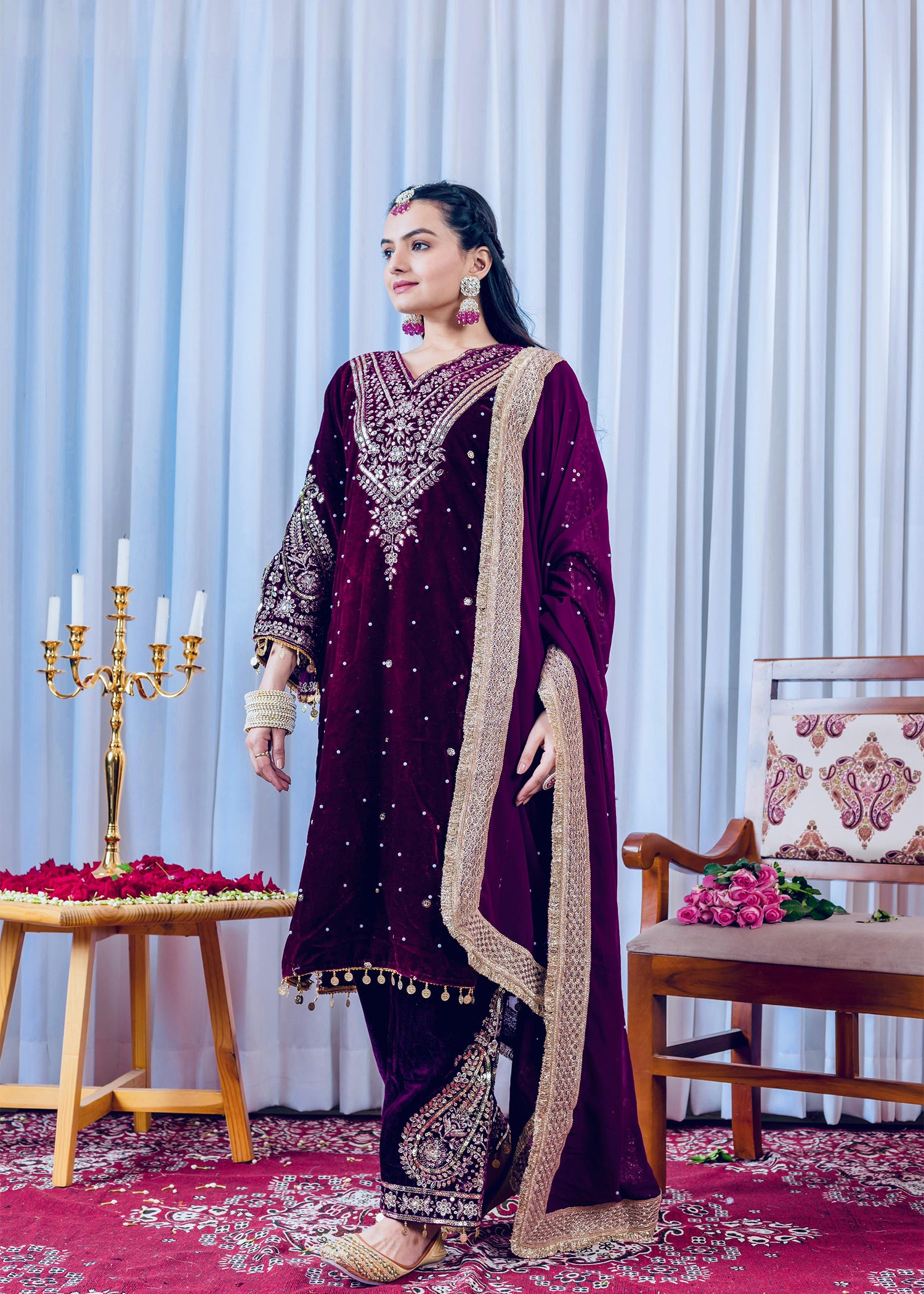 Deep Plum Purple Velvet Embroidered Kurti Set
