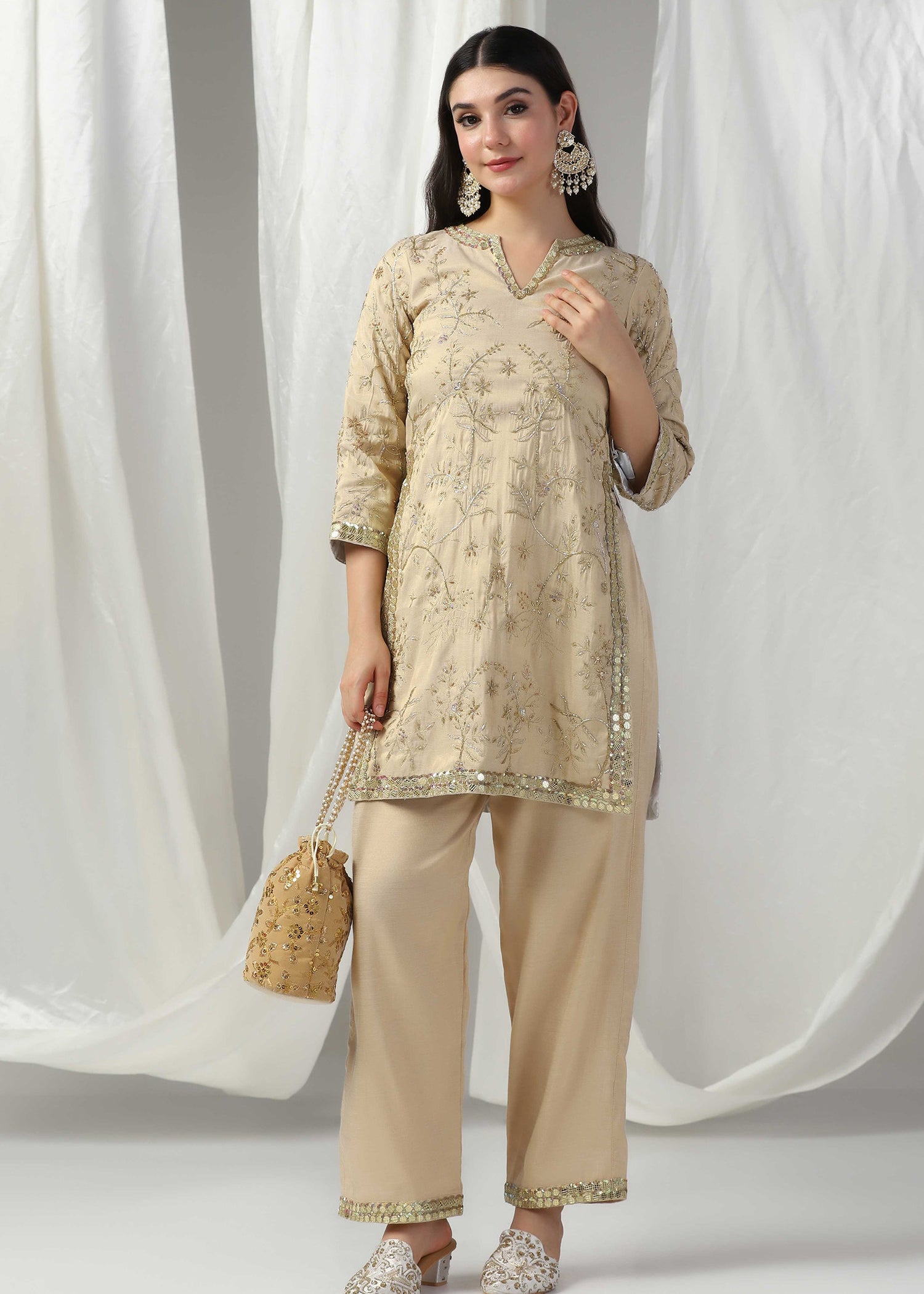 Beige Golden Shimmer Embroidered Co-Ord Set