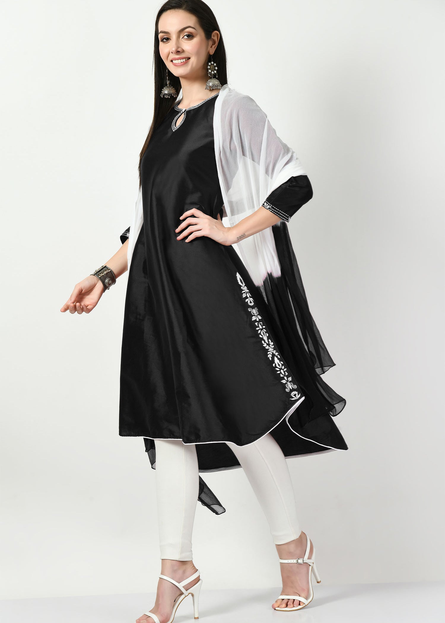 Black And Intense Pewter Grey Organza Saree With Petit Point Embroidery