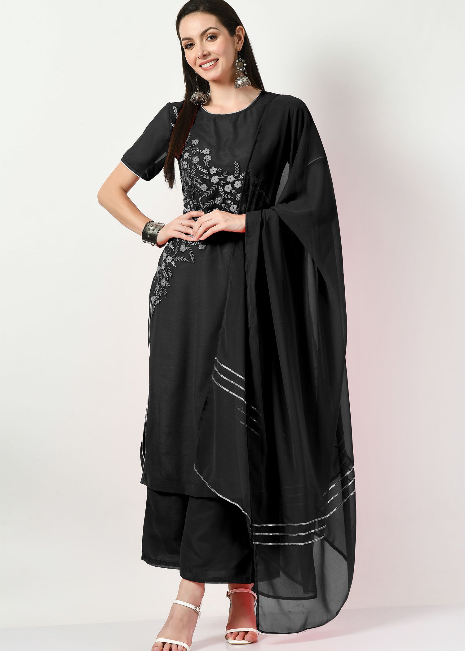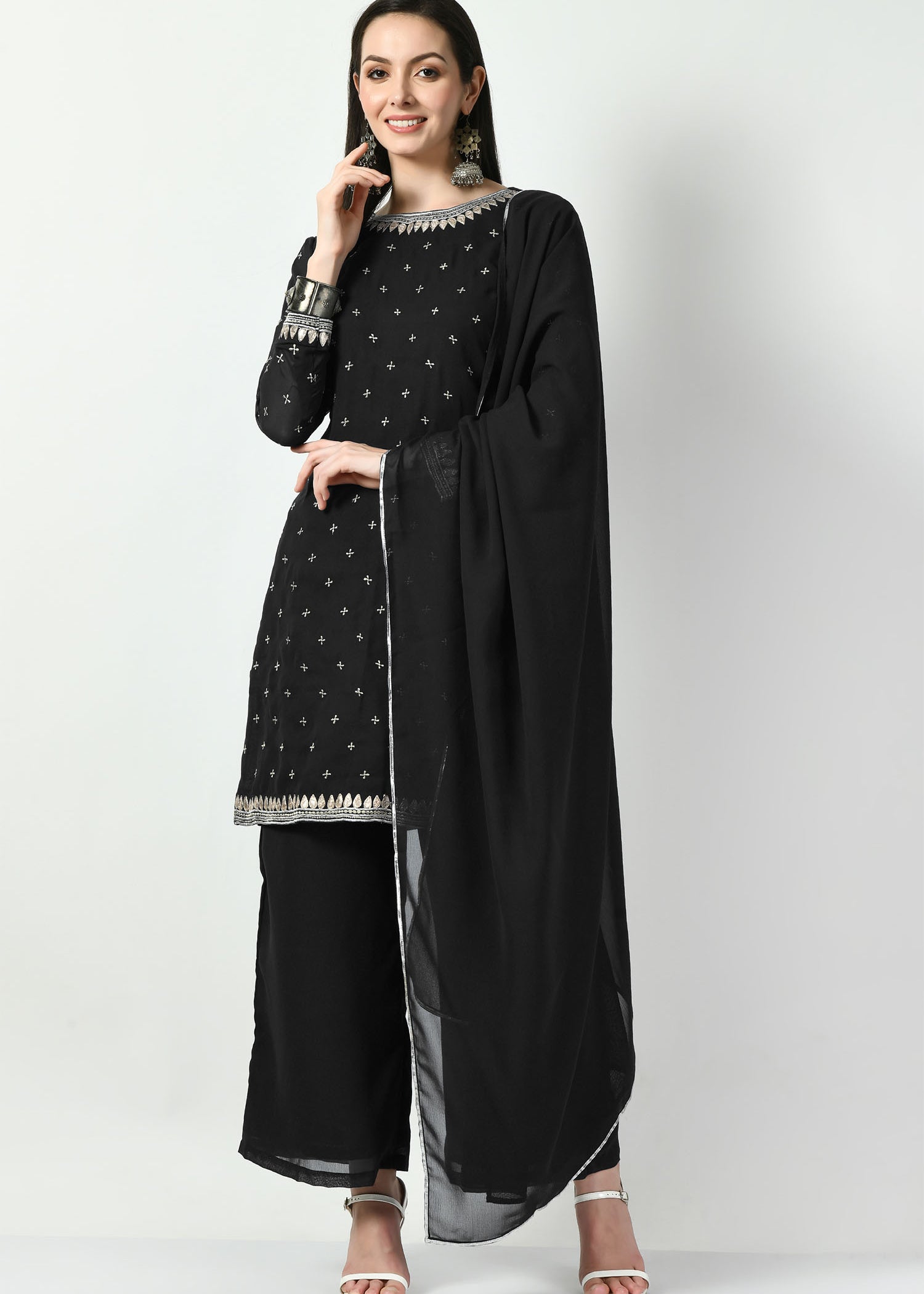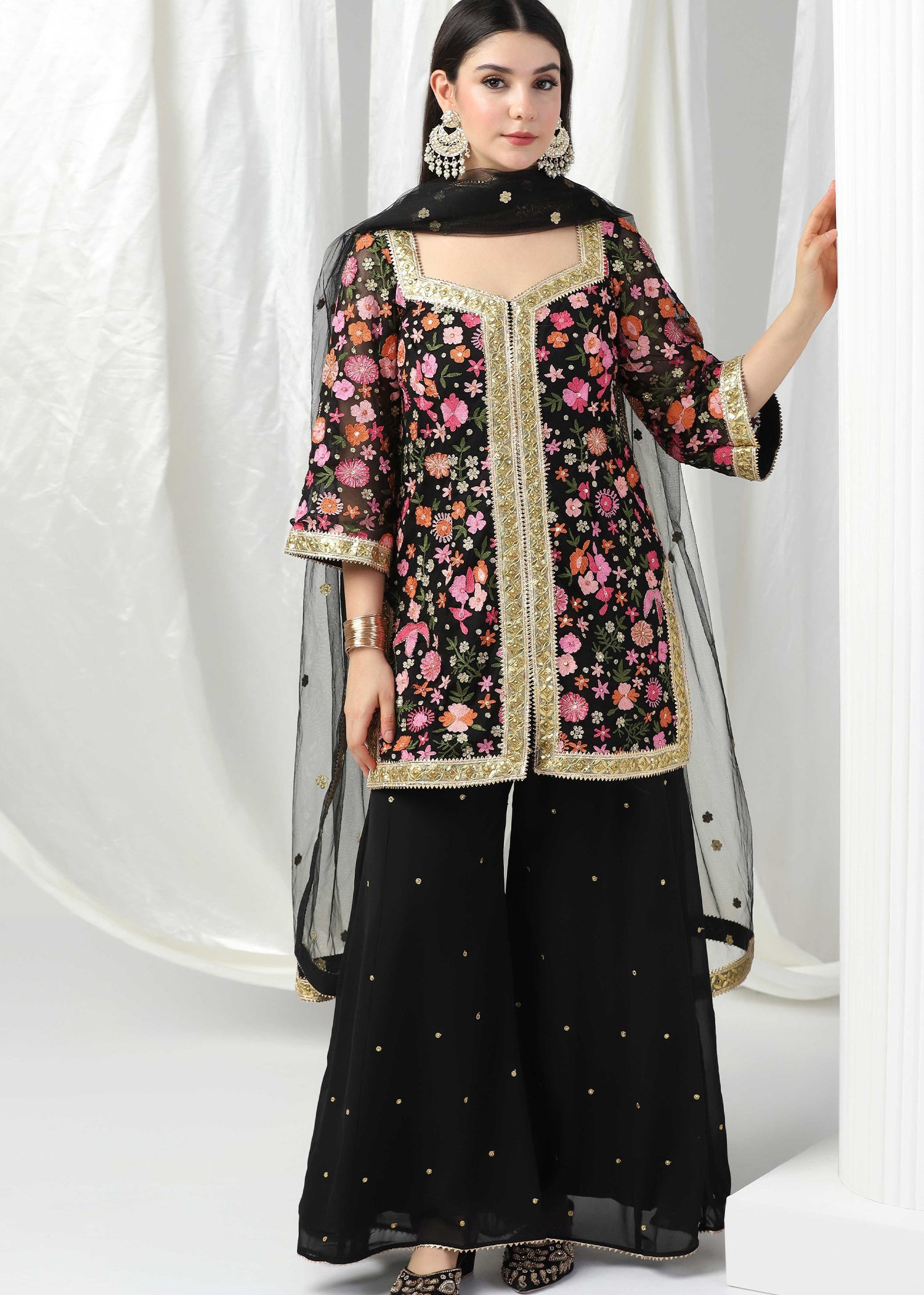 Black Designer Kurti With Georgette Sharara And Net Dupatta