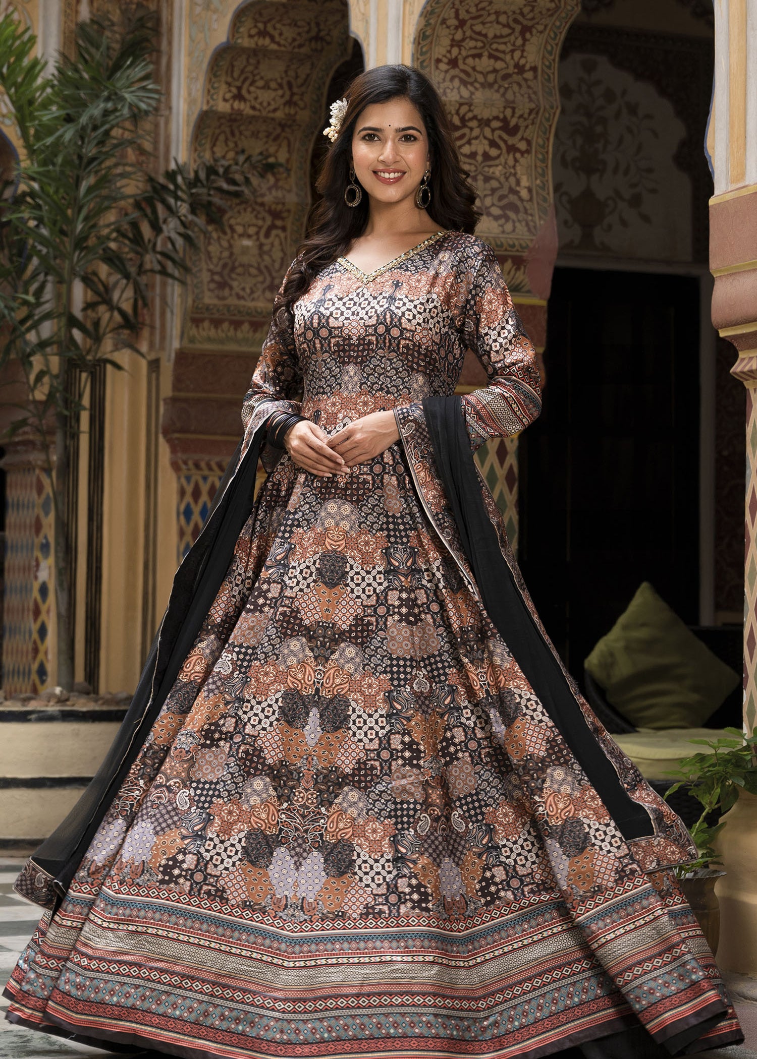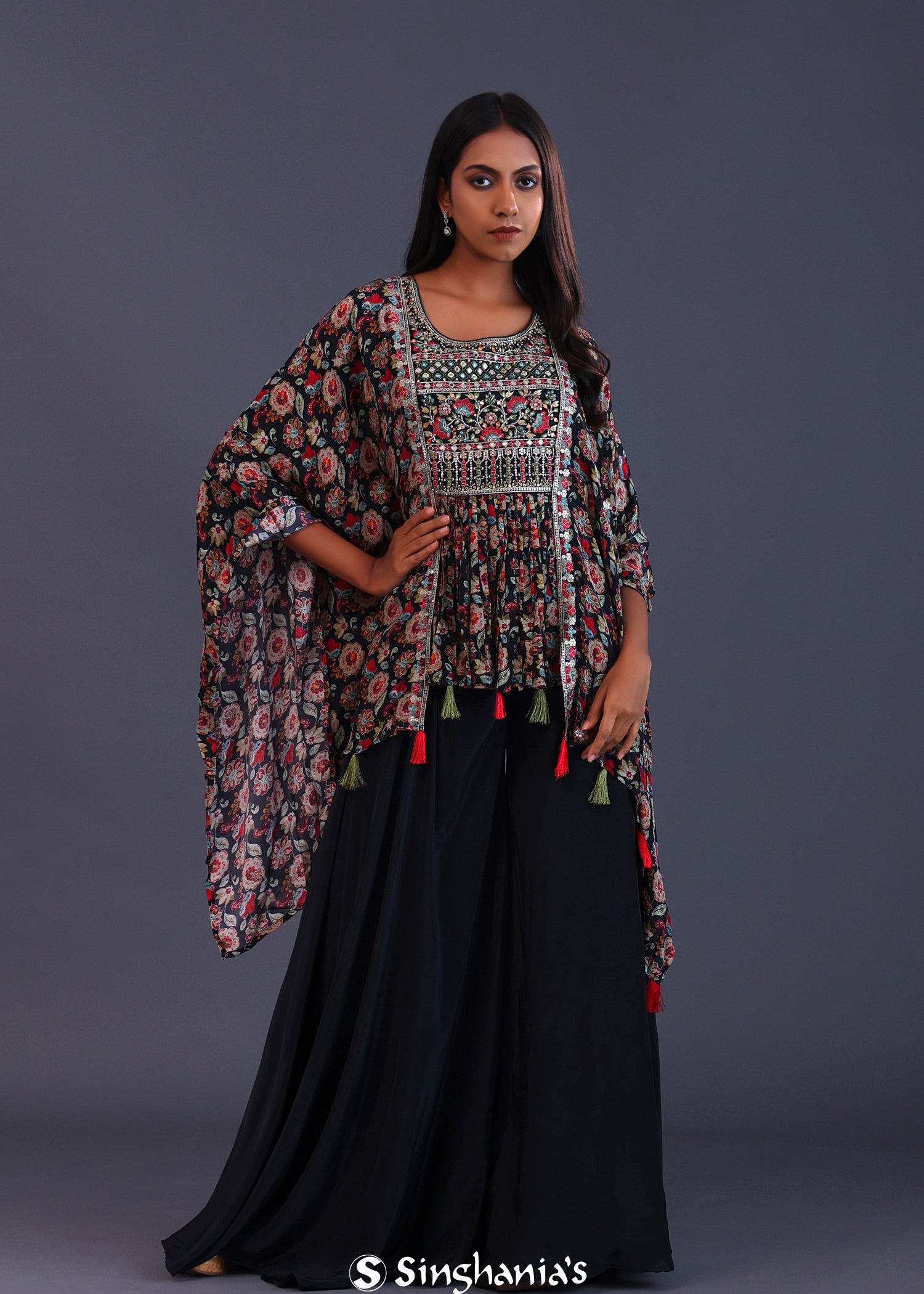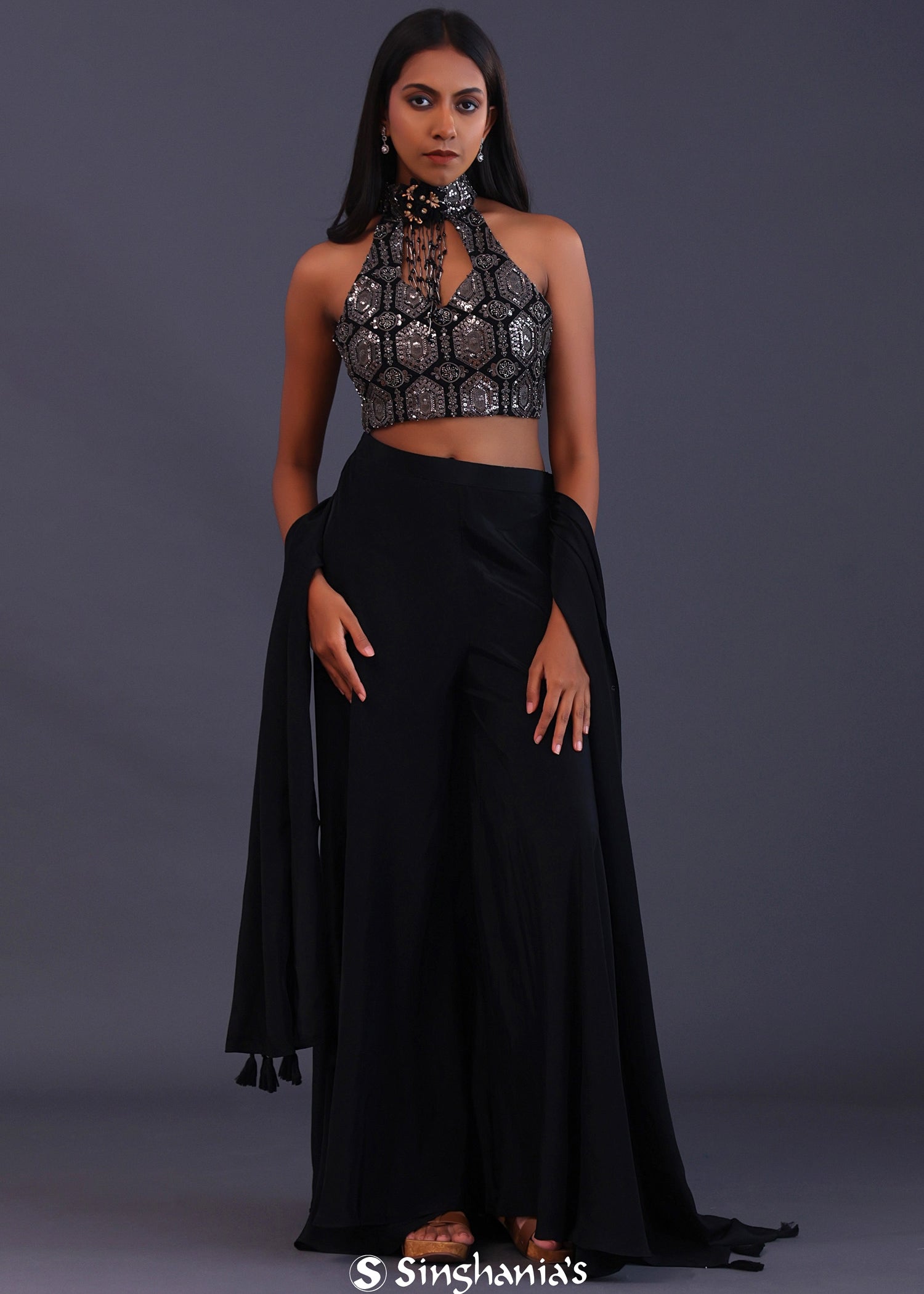 Black Crepe Silk And Georgette Indo Western Choli Set.