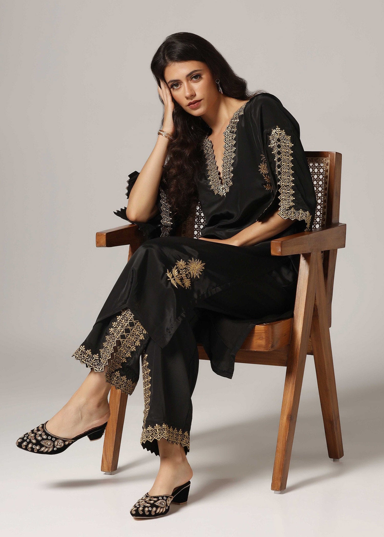 Black Crepe Silk And Chiffon Floral Peplum Set.
