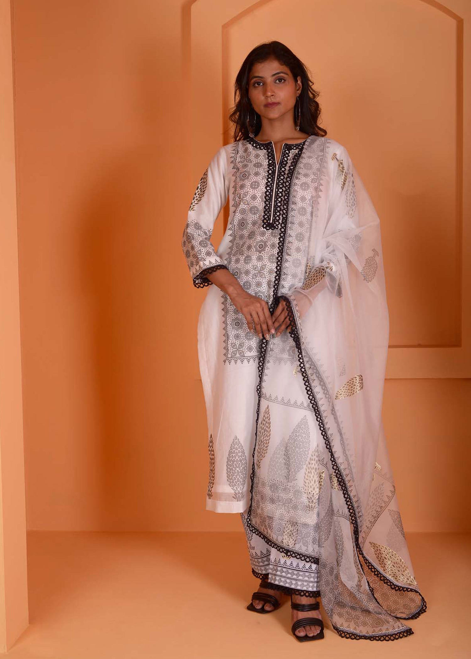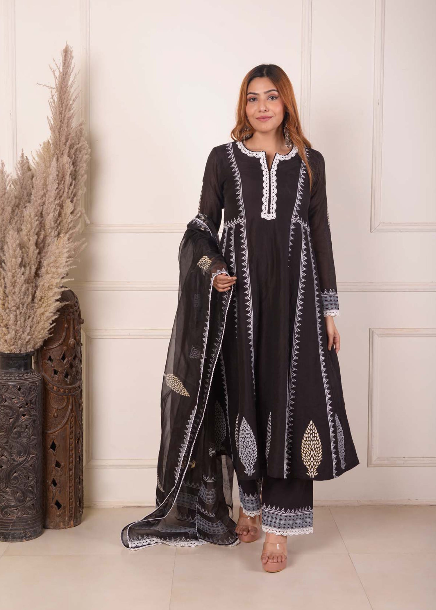 Black Foil Block Print Straight Kurta Set With Black Lace Work