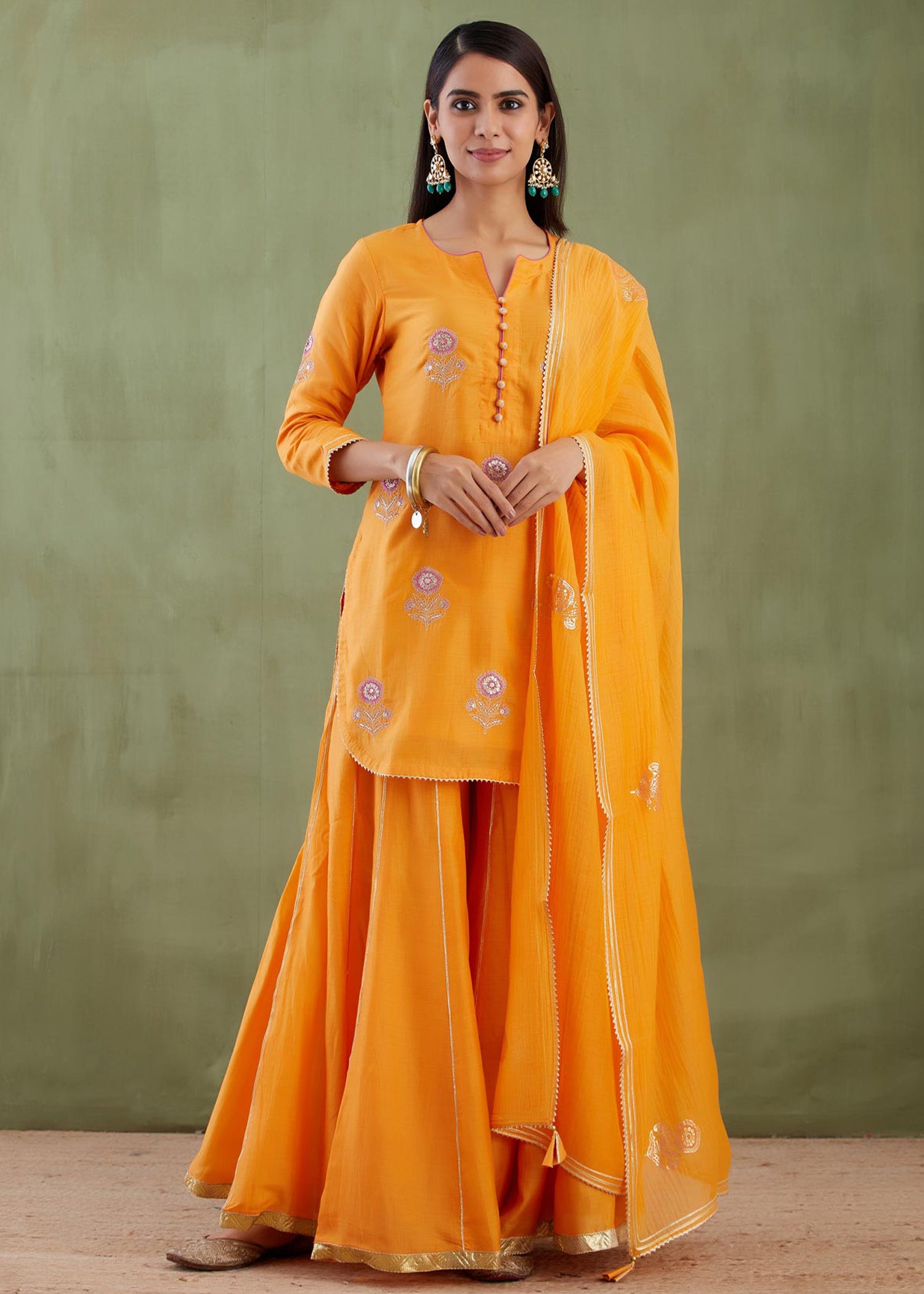 Orange Kurta Sharara Set With Gold Lace Work Bottom
