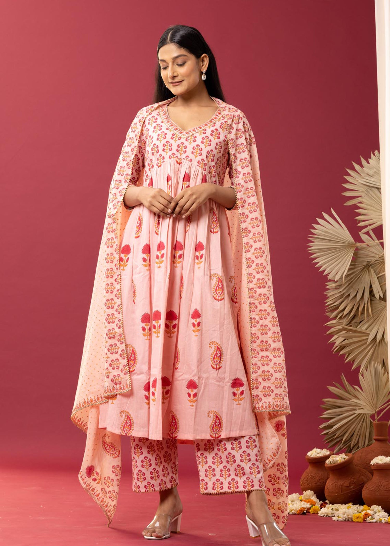Pink Block Printed Cotton Cambric Gathered Kurti Set