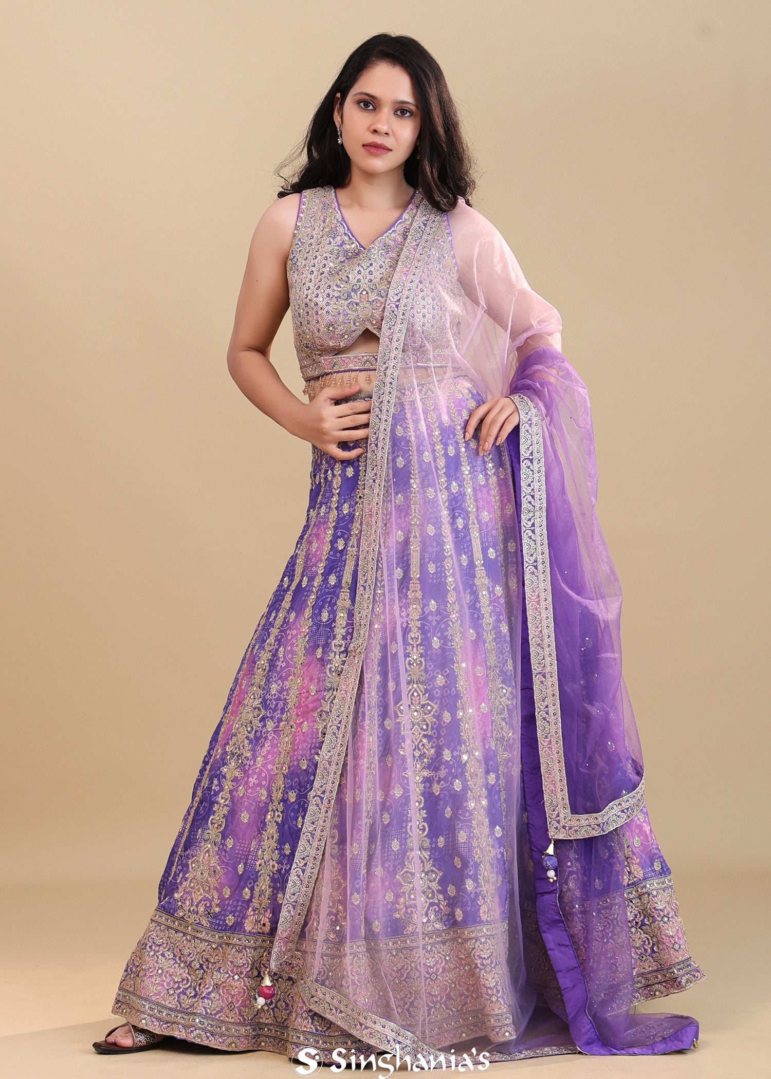 Purple Block Print With Embroidery Outing Kurta And Sharara Set