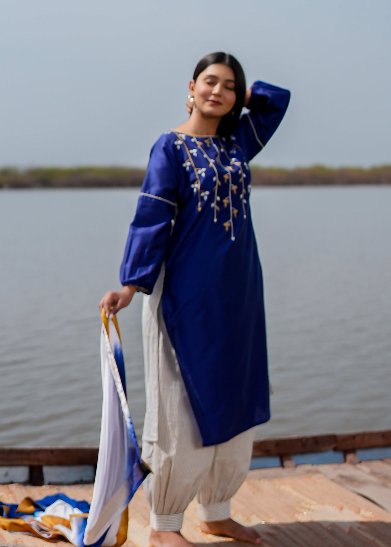 Blue Cotton Kurta Set With Hand Embroidery And Leheriya Dupatta