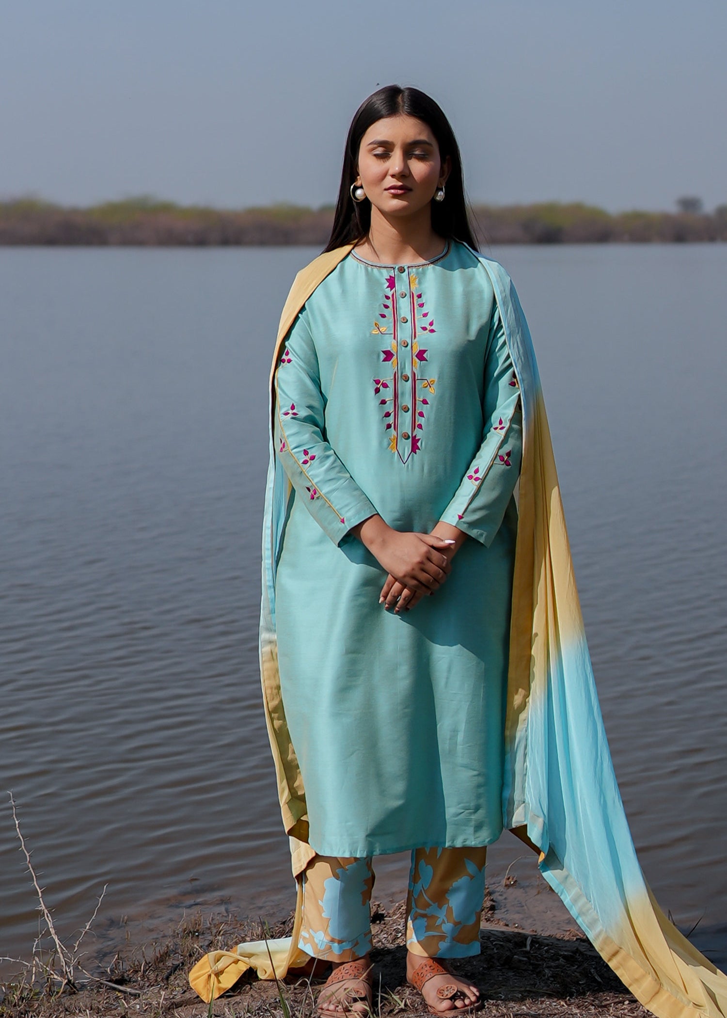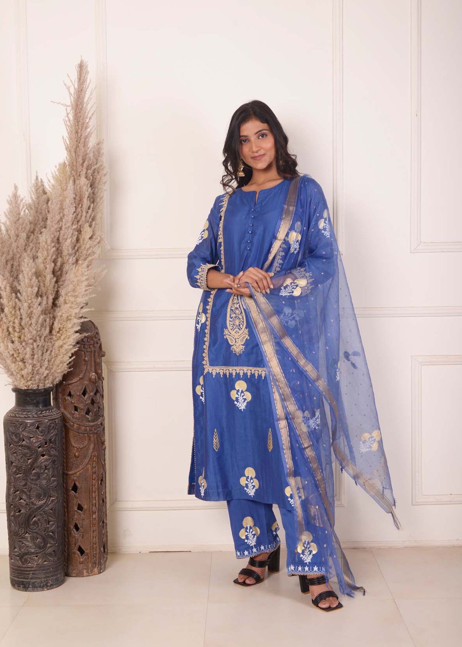 Blue Chanderi Straight Kurti With Pant And Dupatta