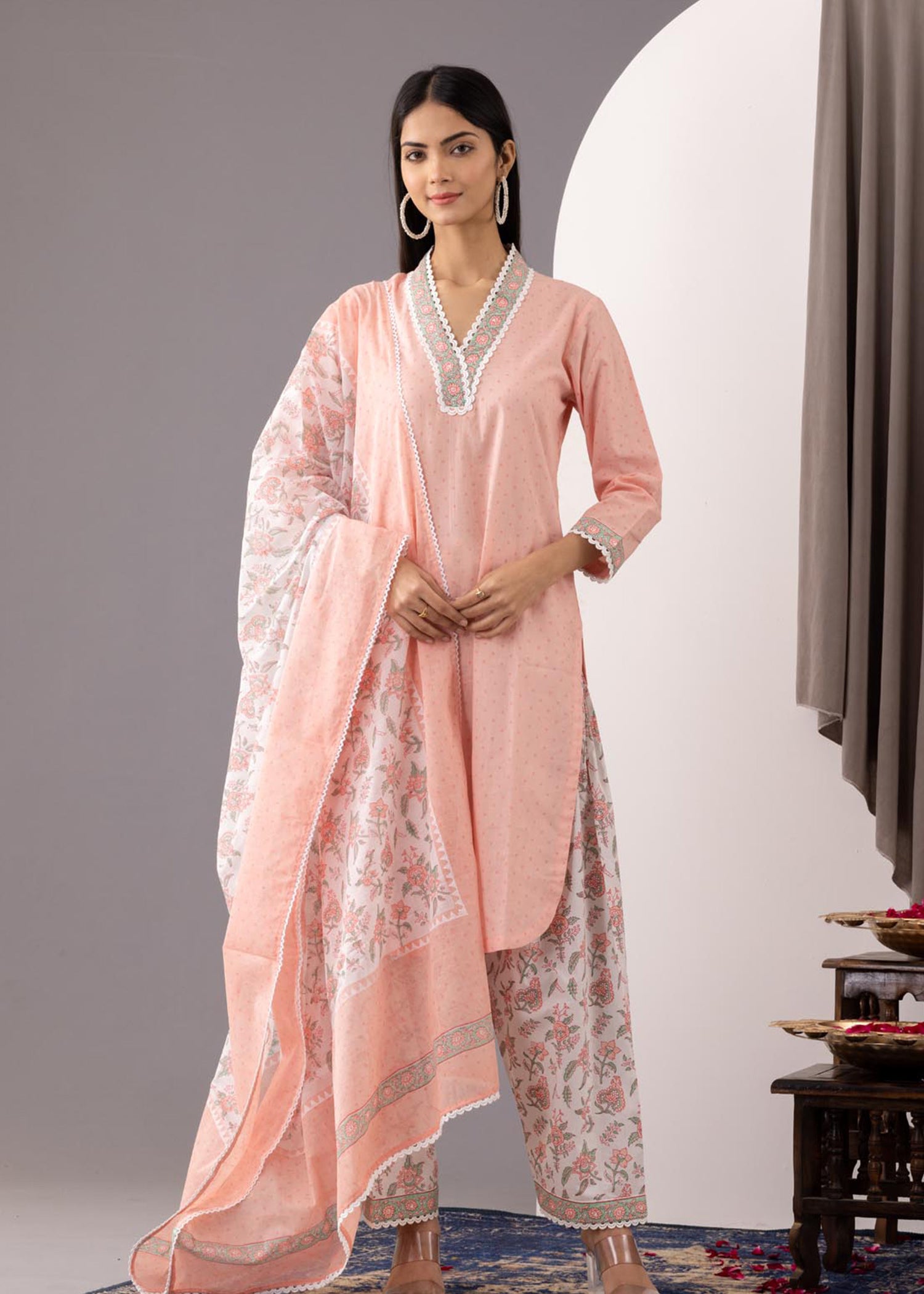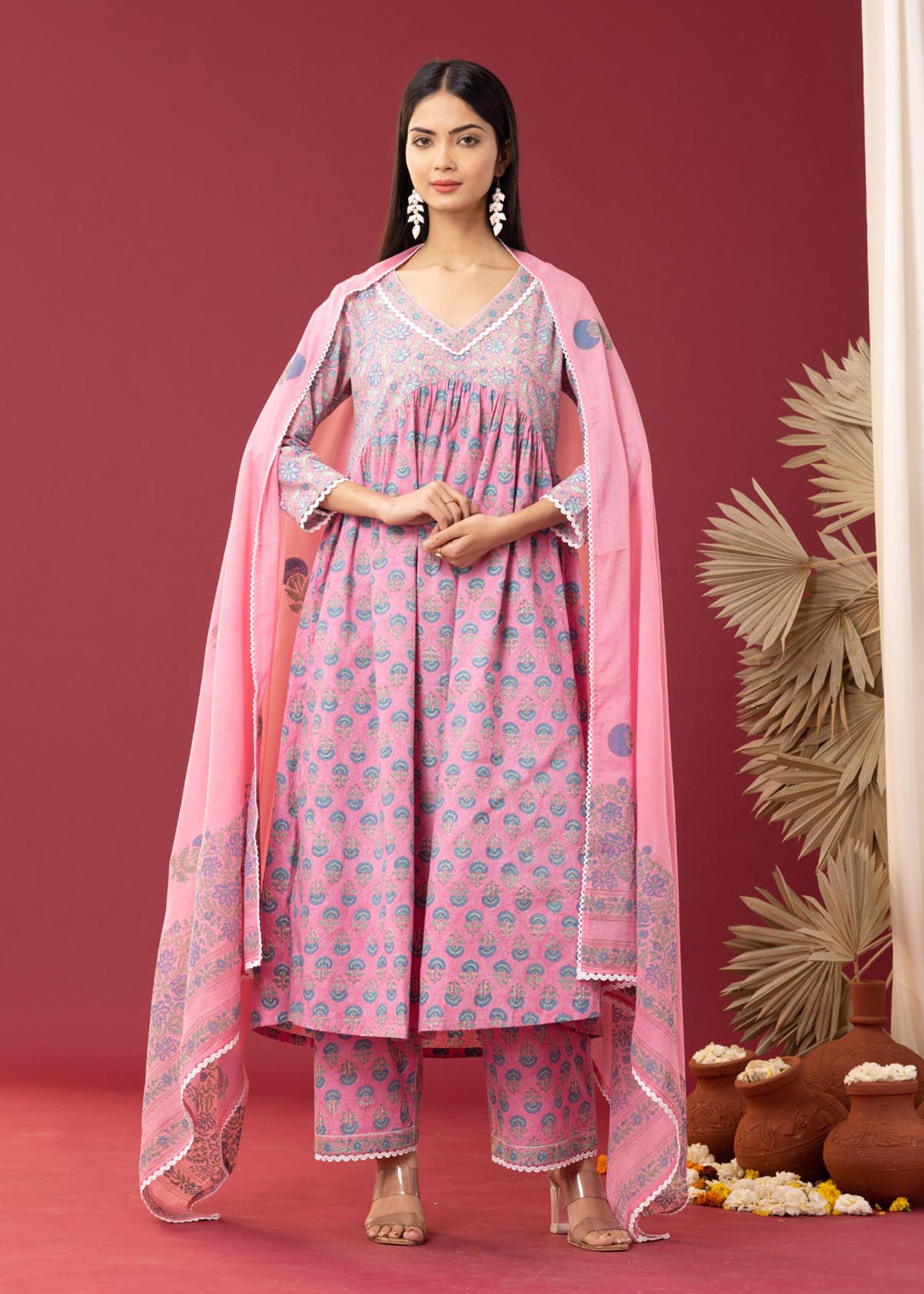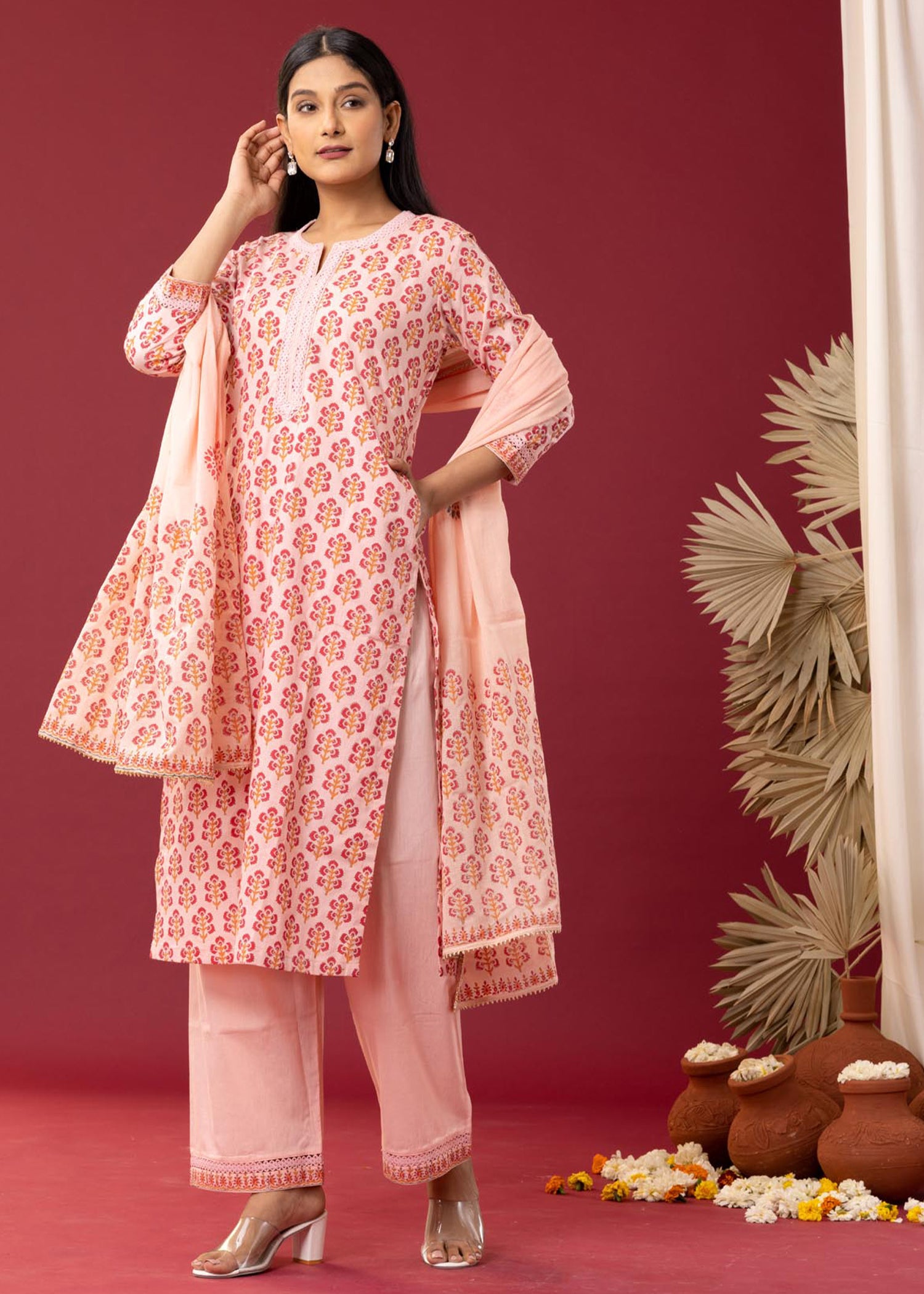 Block Printed Pink Cotton Kurta Set With Dupatta