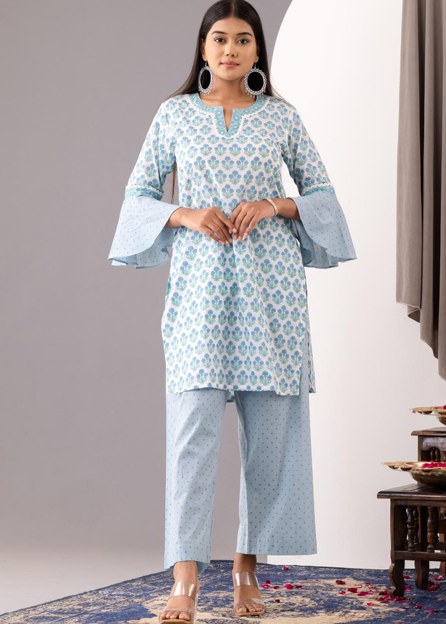 Blue Block Printed Cotton Cambric Gathered Kurti Set