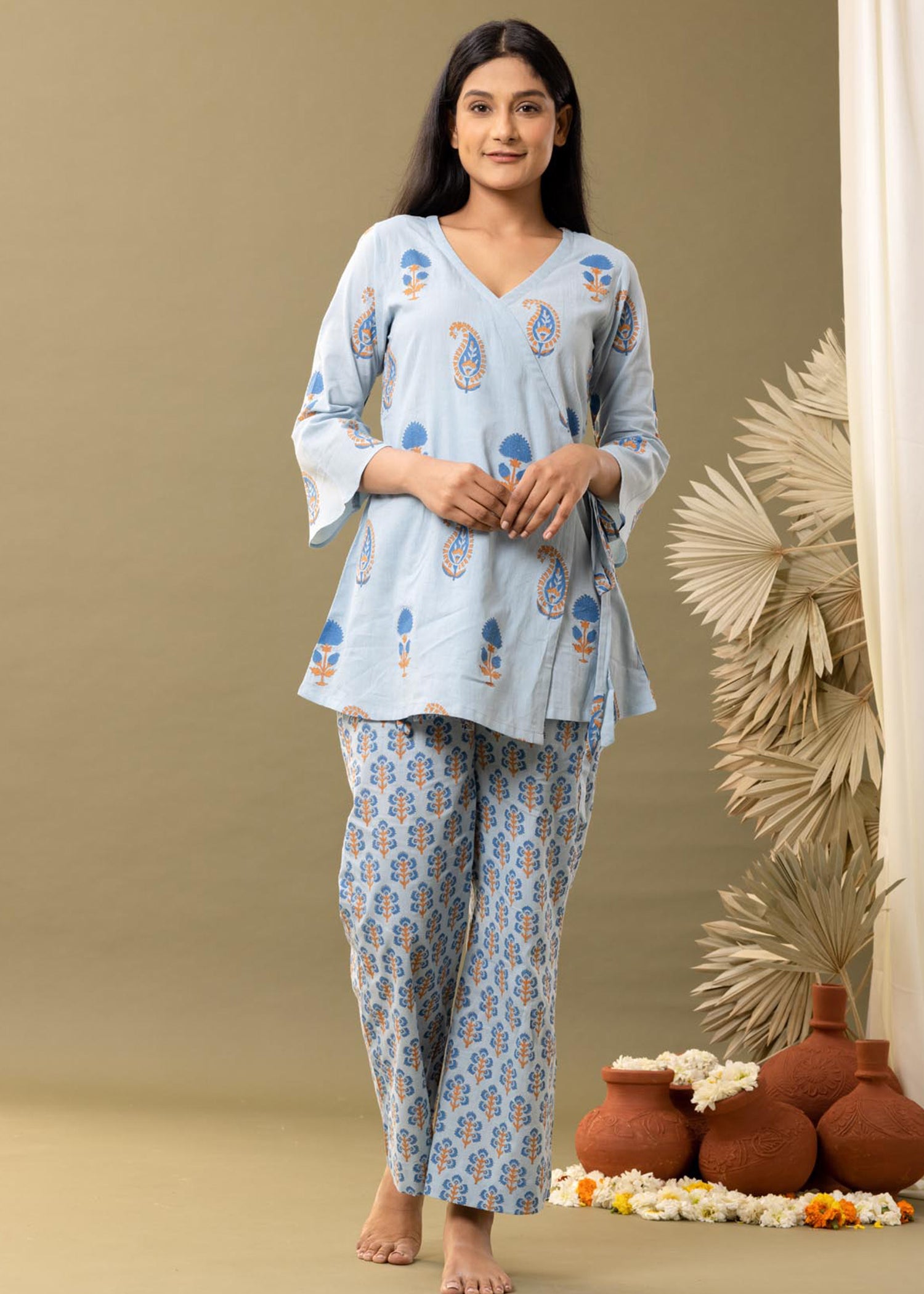 Blue Block Printed Cotton Straight Kurta And Palazzo