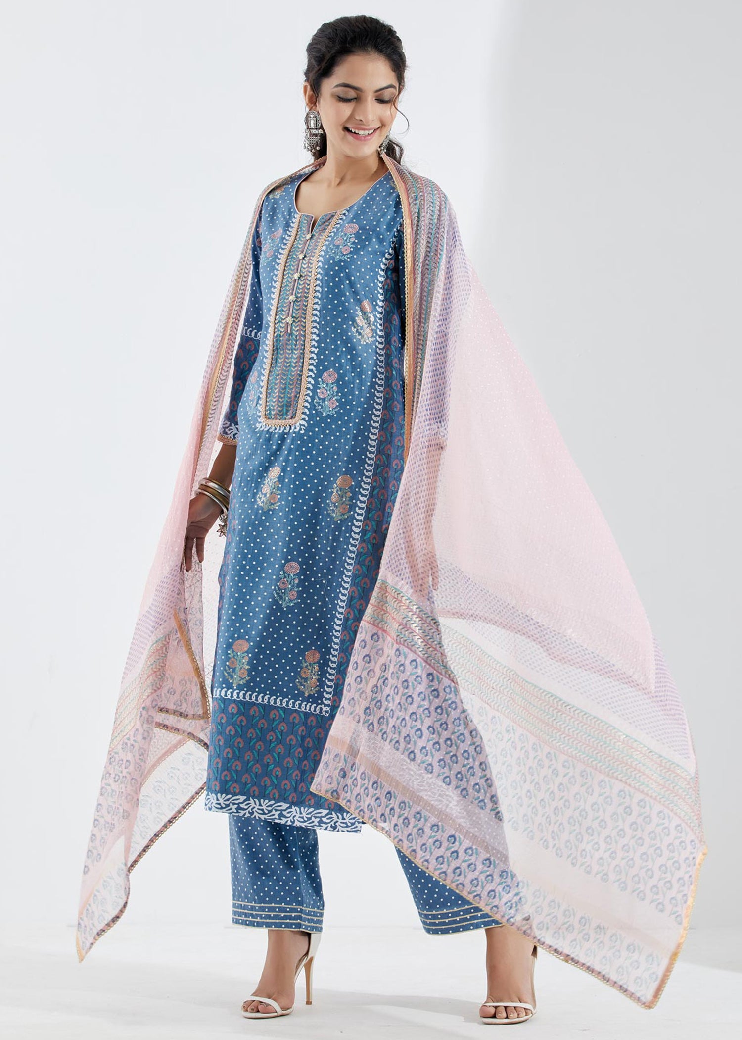 Blue And White Chanderi Suit Set