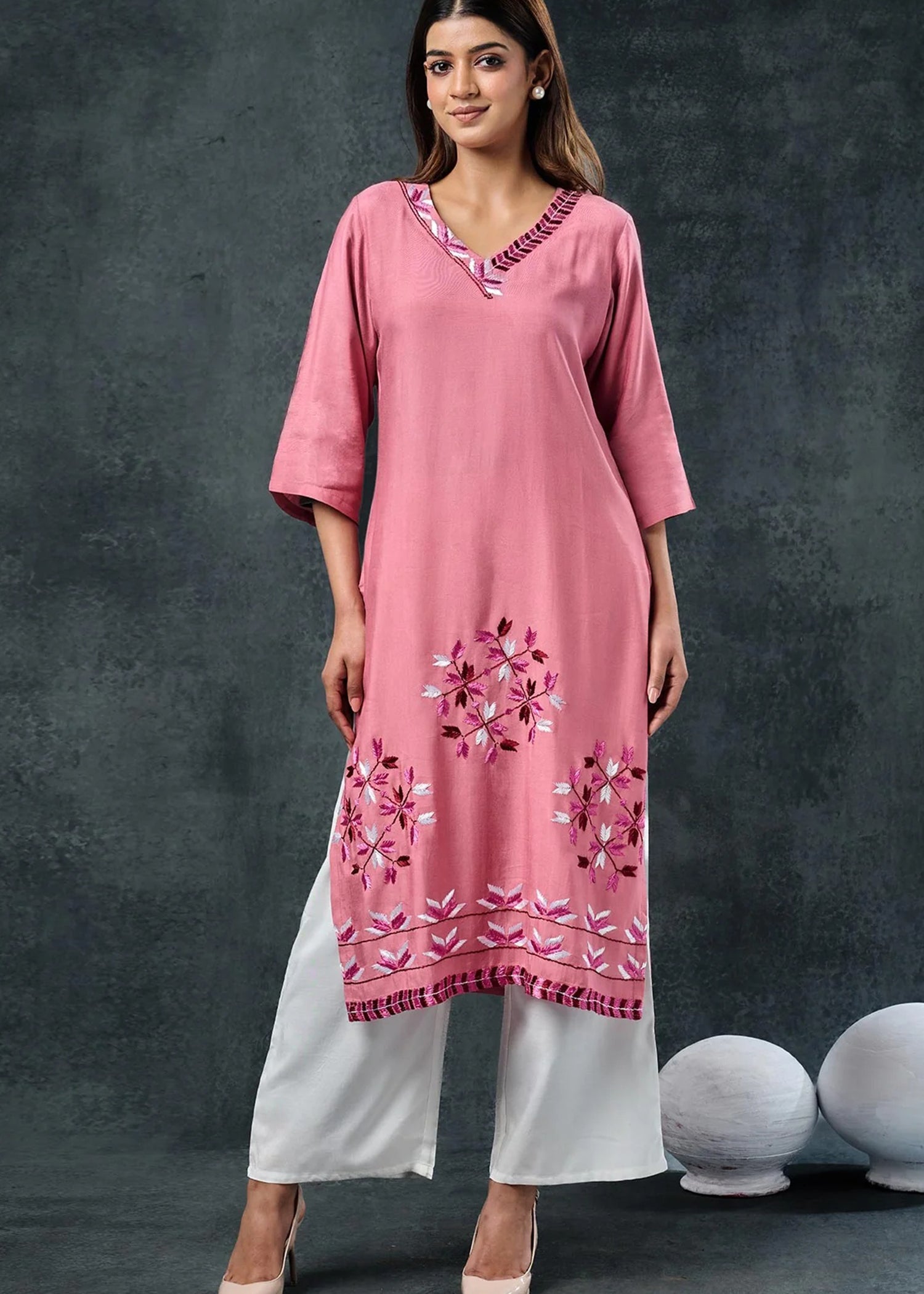 Soft Pink Rayon Kurta Set With Leaf Embroidery