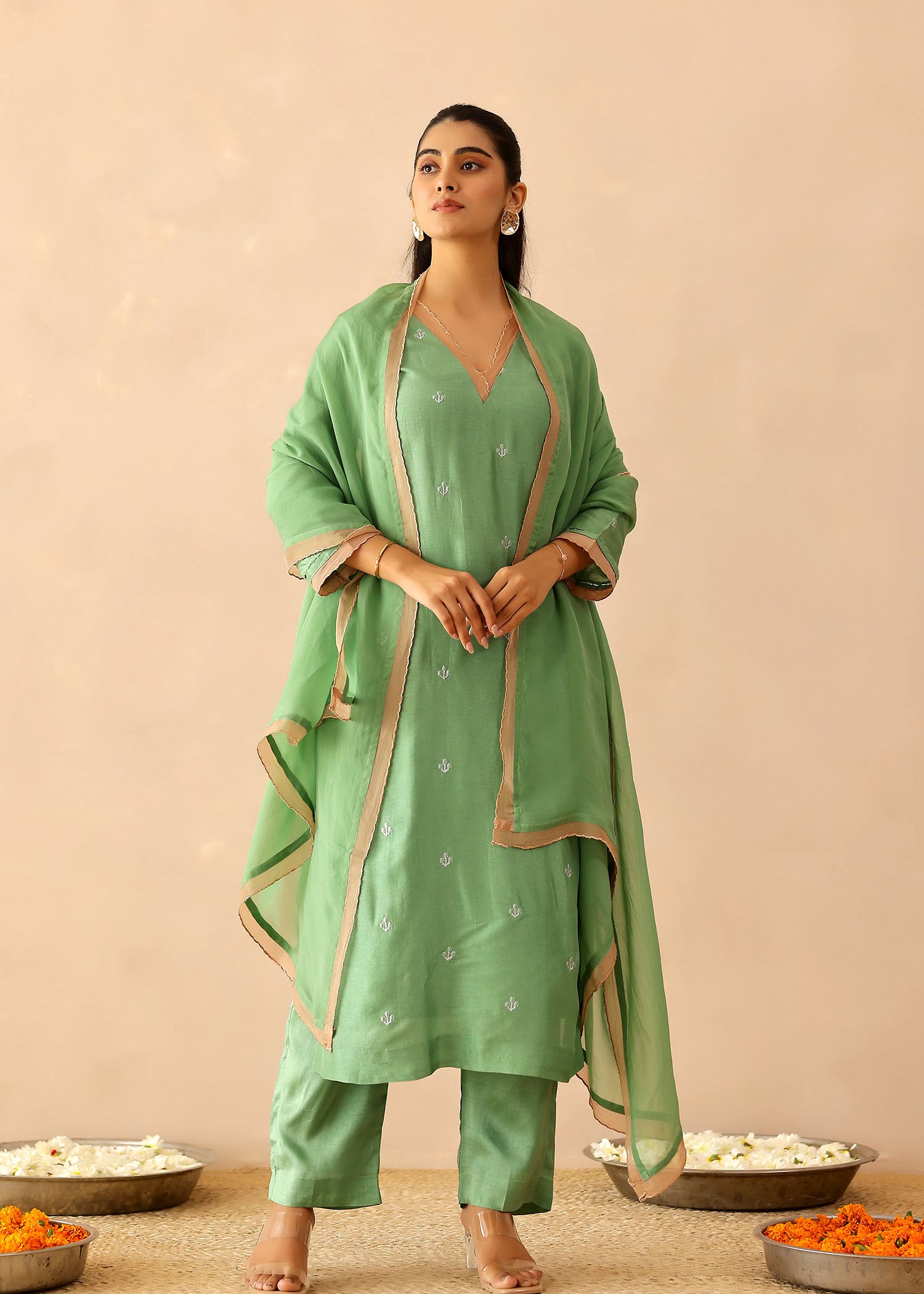 Spring Green Russian Silk Subtle Embroidered Kurti Set