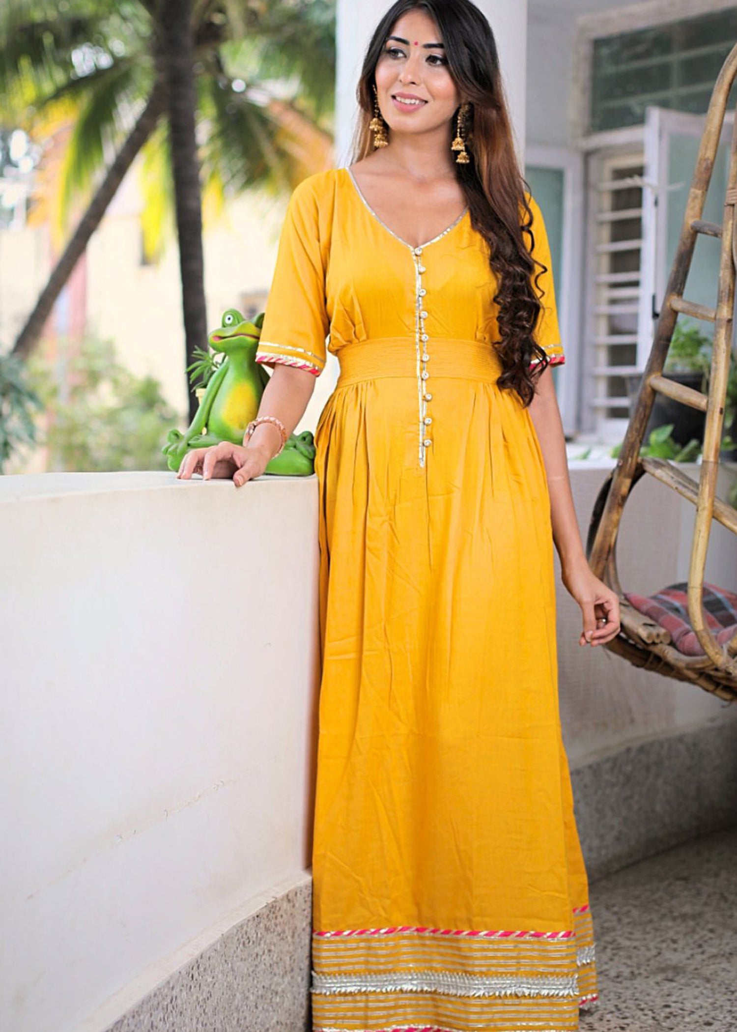 Yellow Block Printed Cotton Cambric Gathered Kurti Set