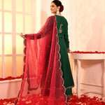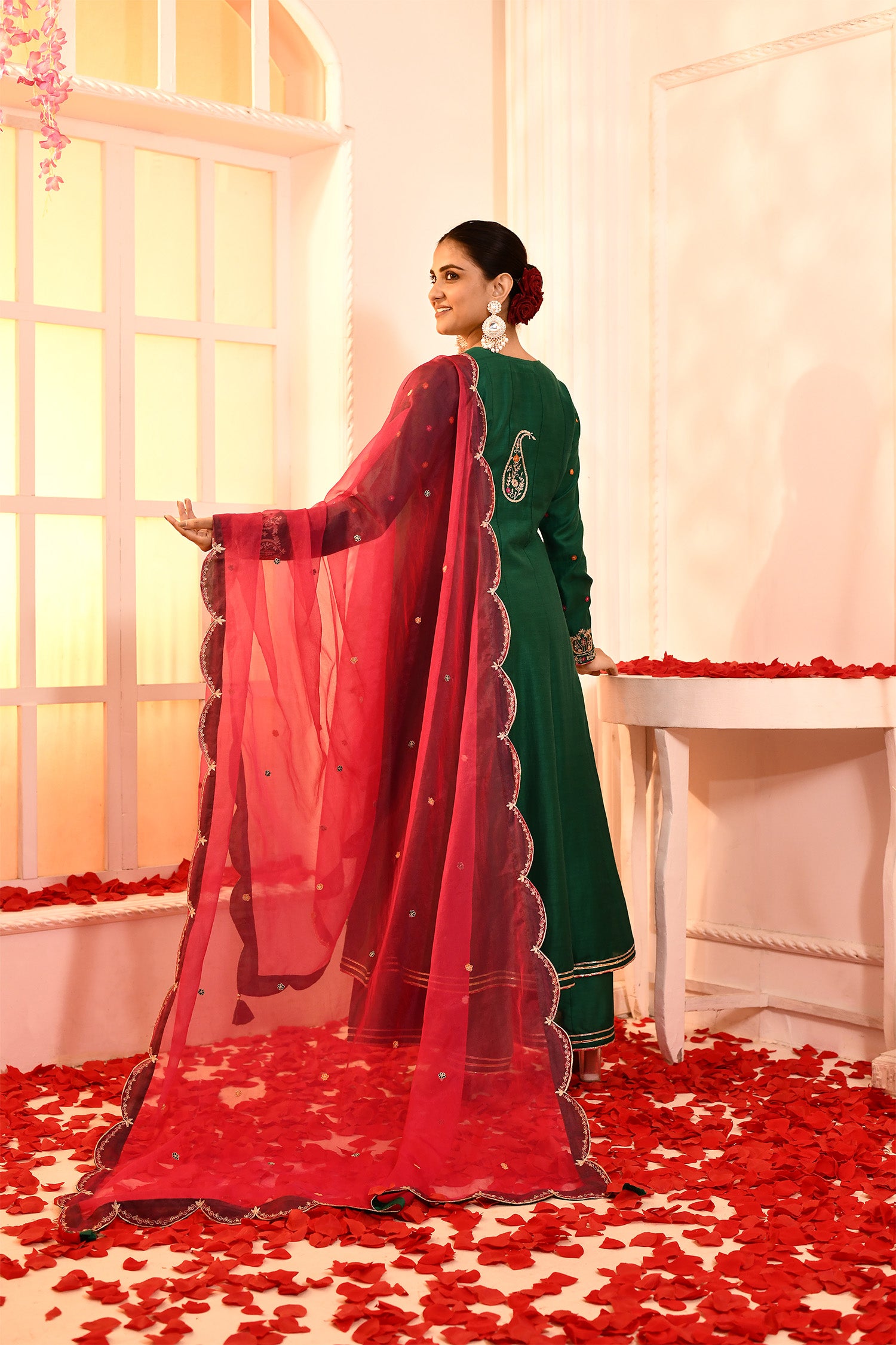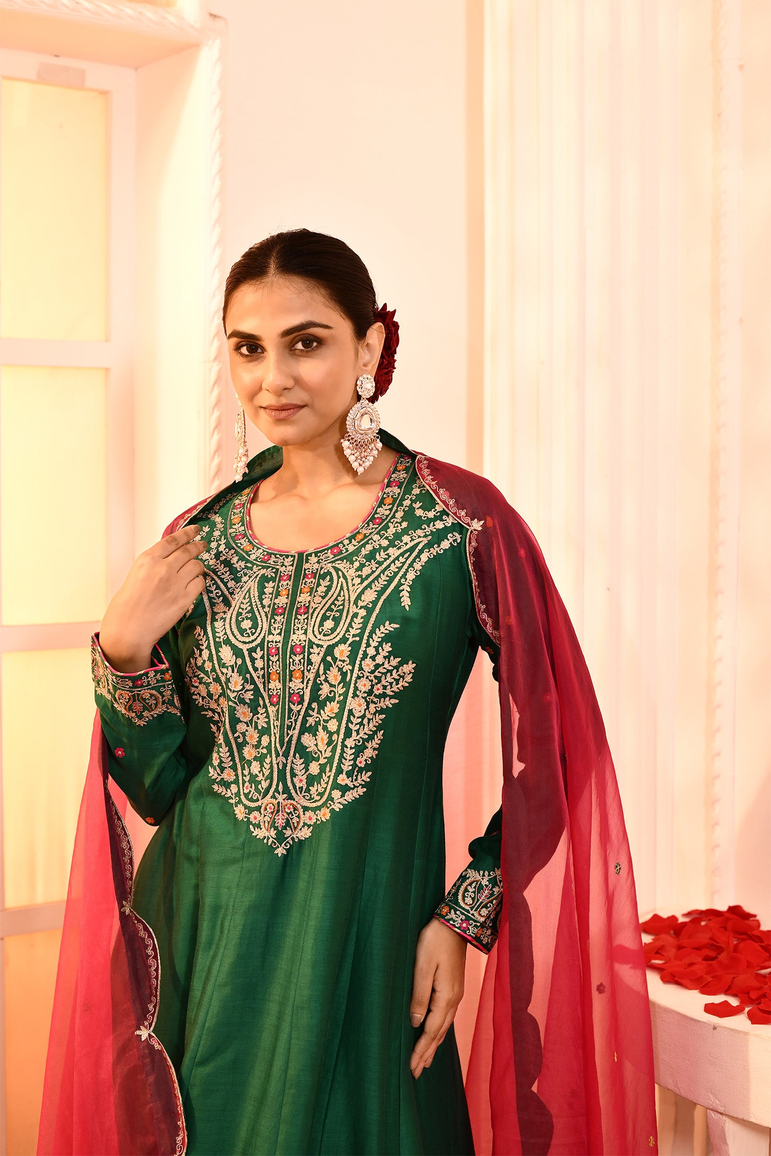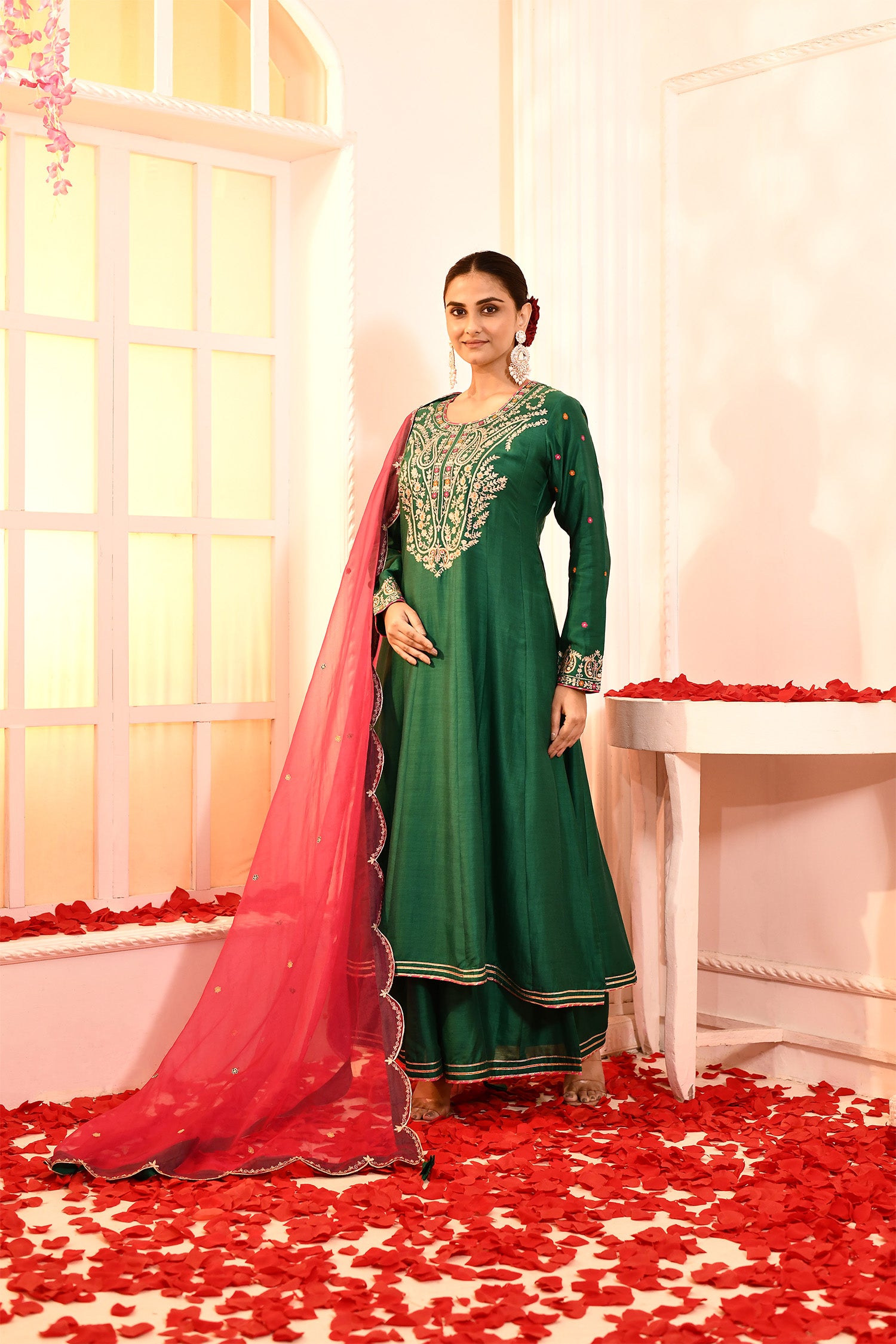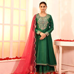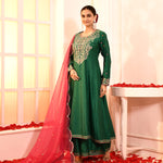 Green Embroidery Neck Anarkali And Gottalace Finish Flair Palazzo Set