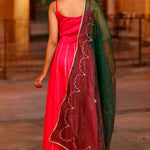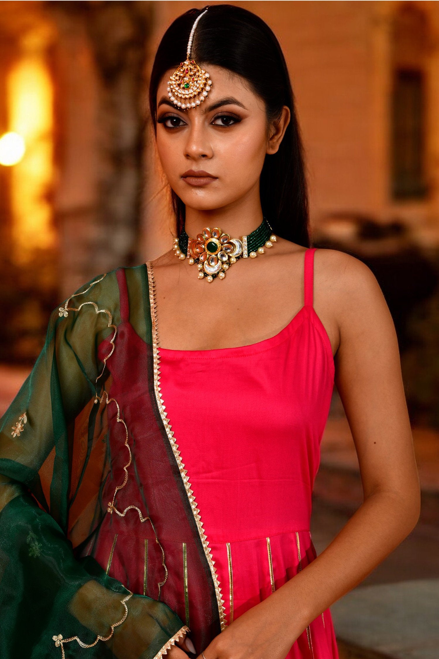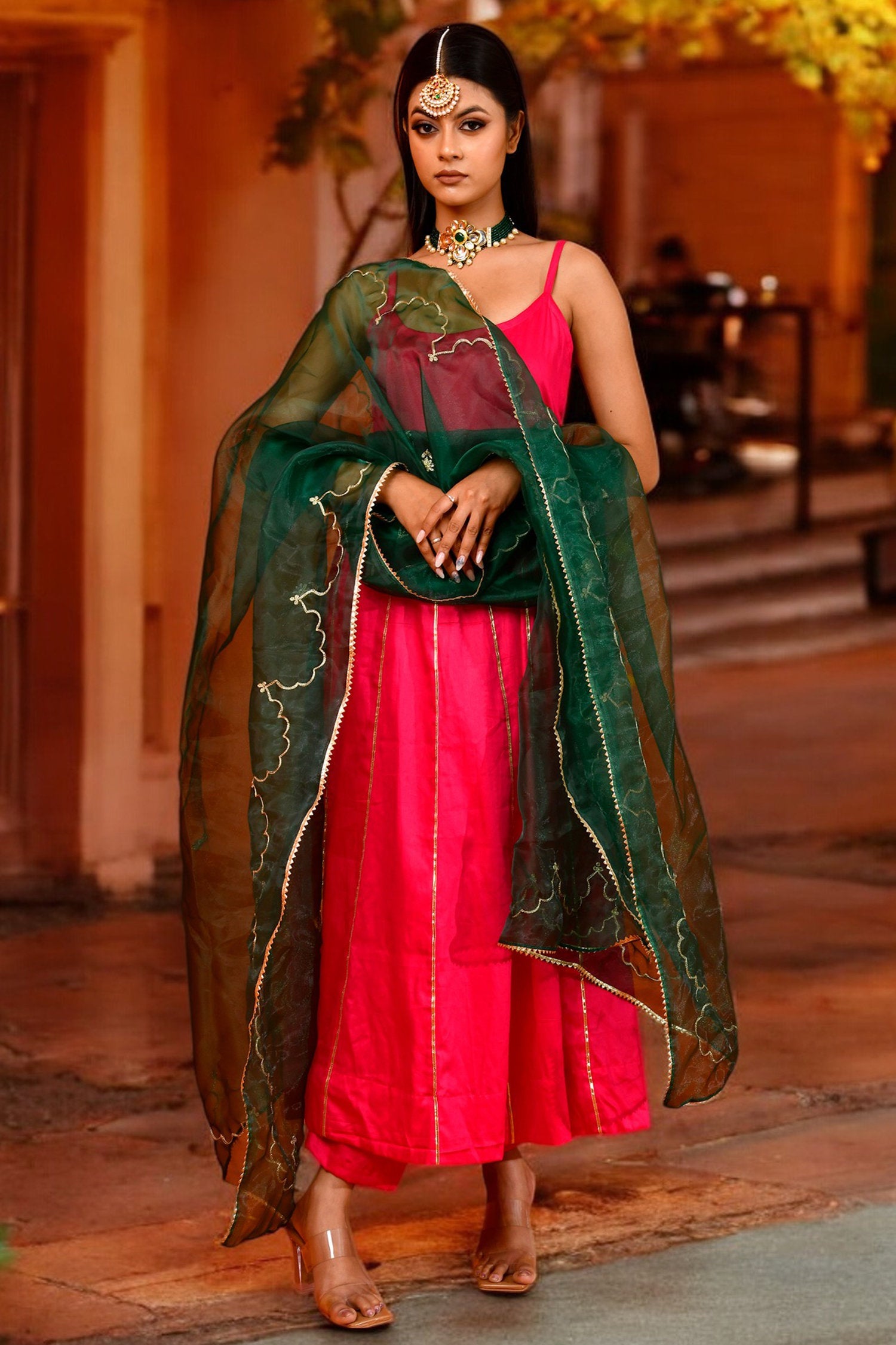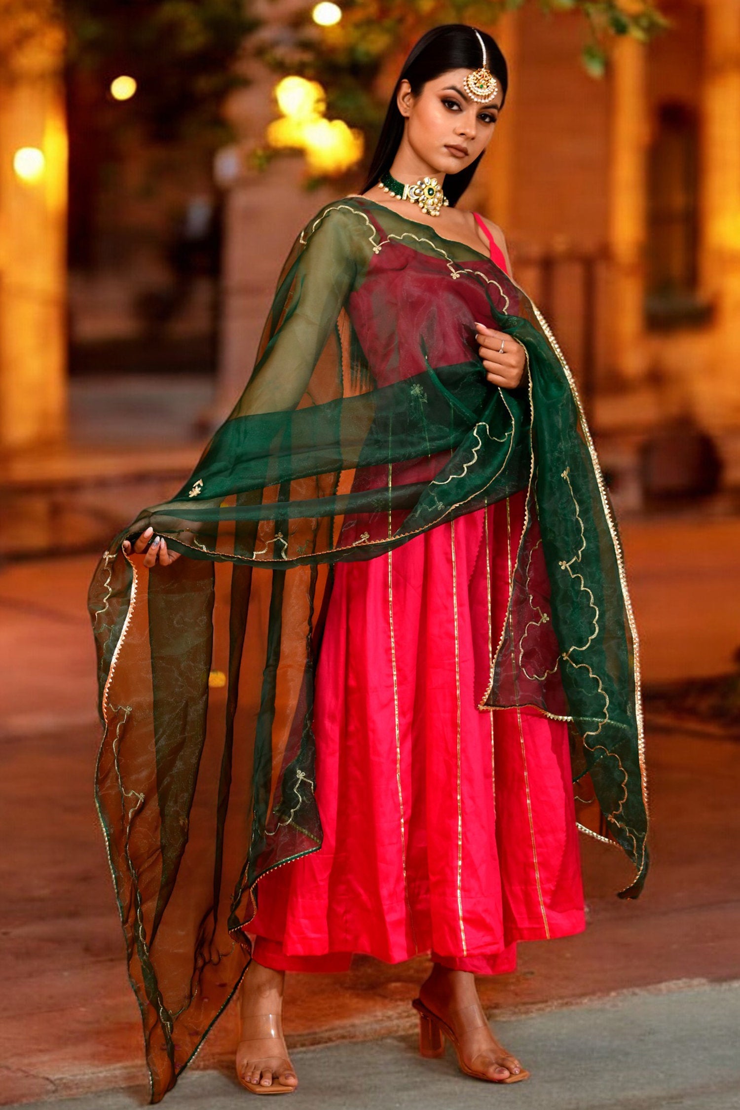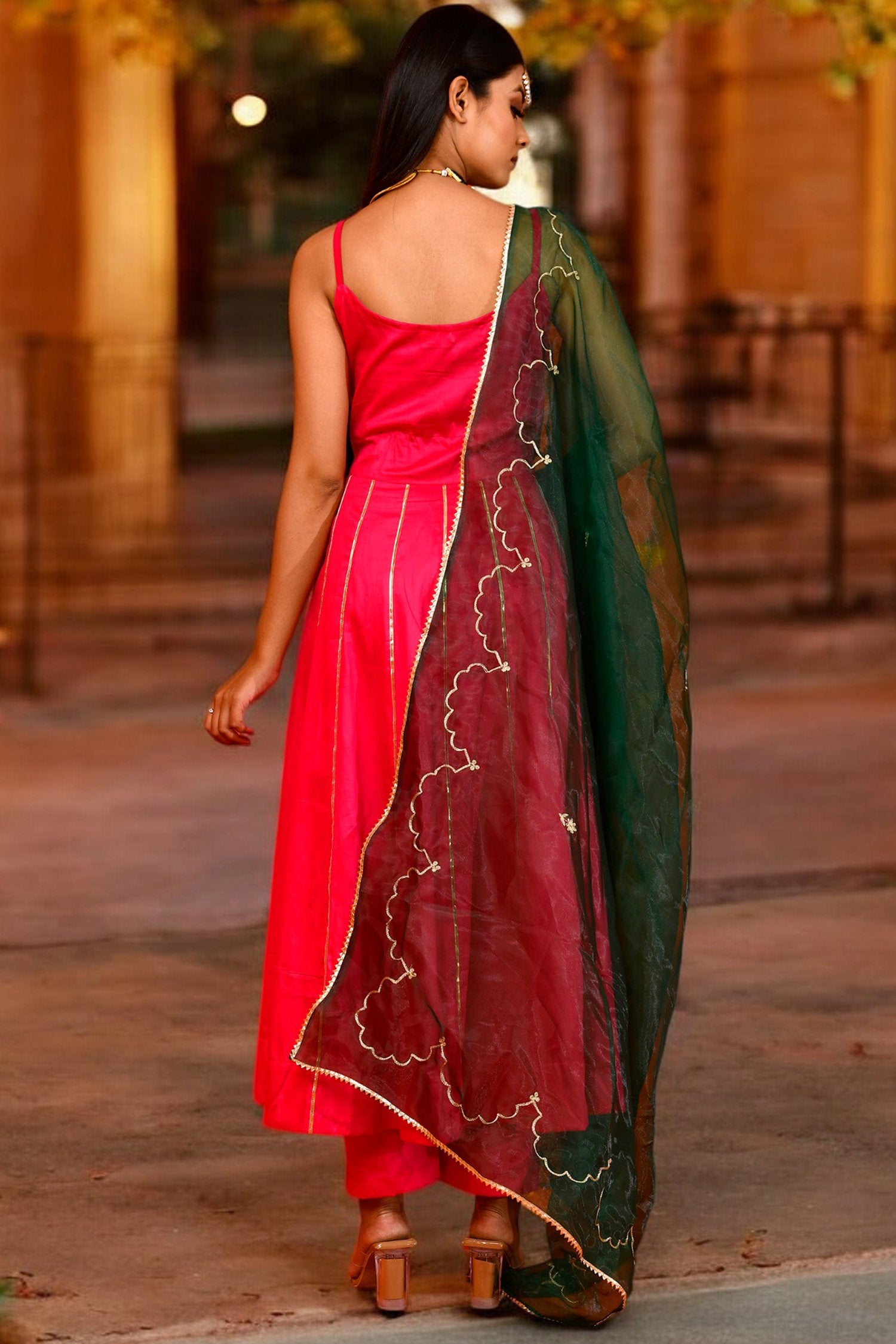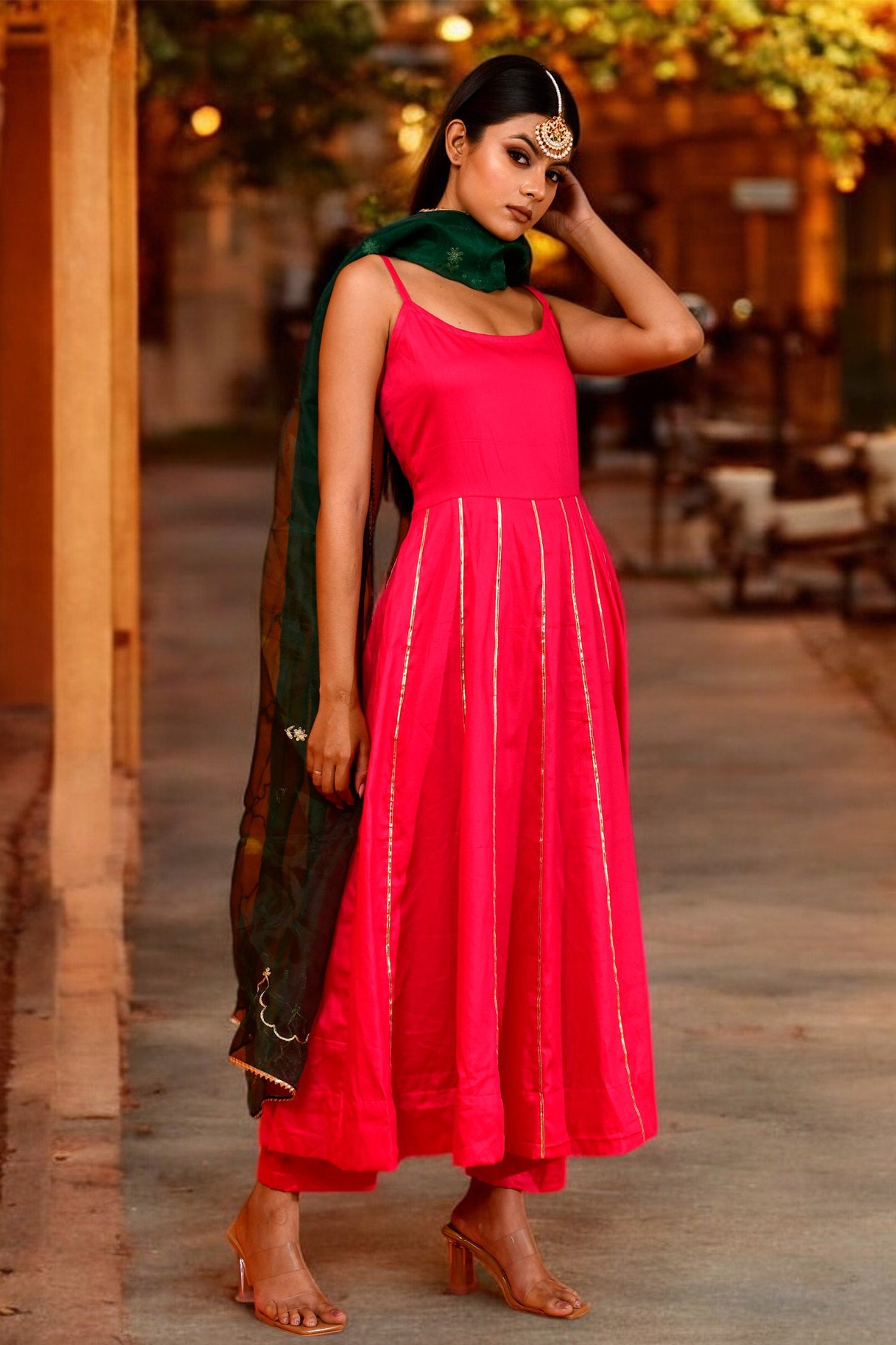 Hot pink cotton silk anarkali set V neckline and sleeveless adorned with gota lace around the flare complemented with matching pants of vibrant color along with contrast green dupatta making best choice for casual and formal events