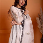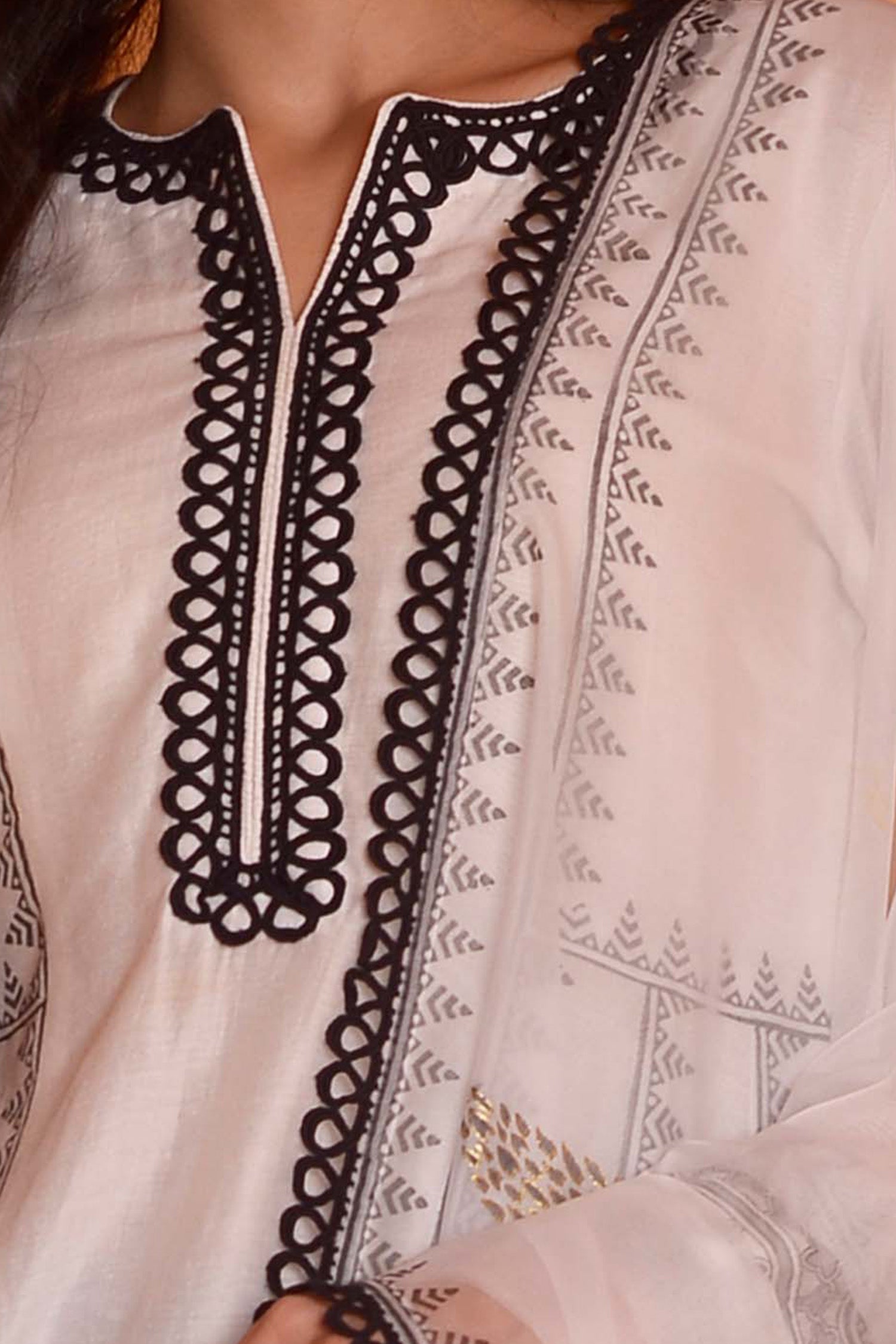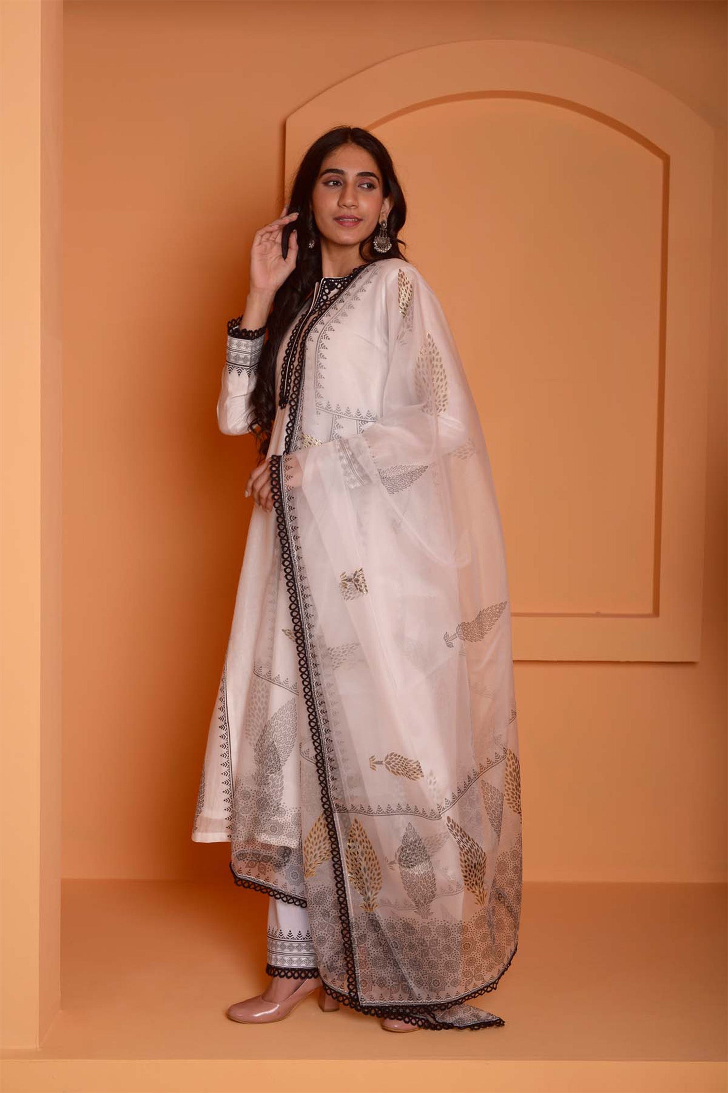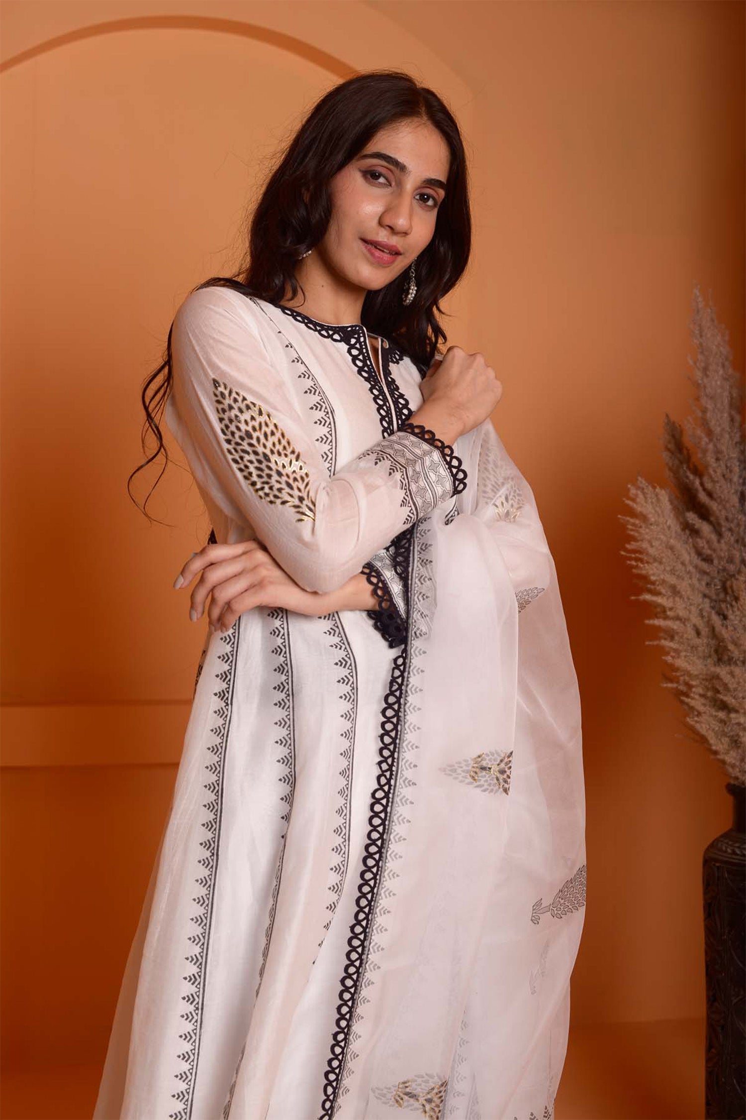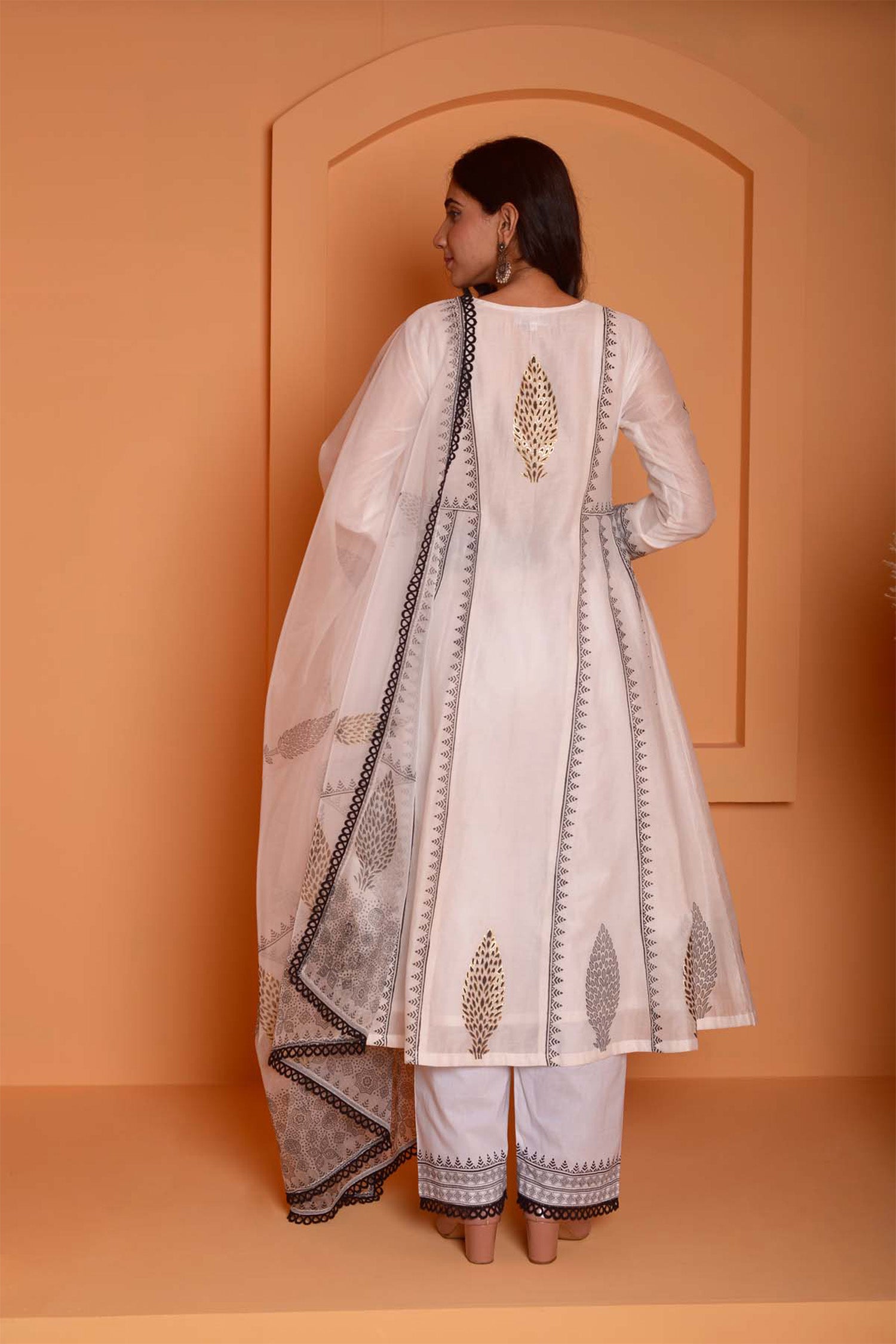 Ivory Foil Block Print Anarkali Set With Black Lace Work