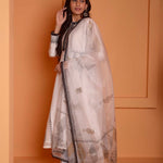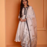 The Chanderi Anarkali Set with Lace work and block printed anarkali, foil printed pant and an matching organza dupatta for a glamorous and a Subtle Ethnic look.