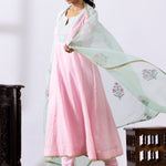 The Dori Embroidered Pink Chanderi Anarkali with matching Cotton churidar and a contrast Organza dupatta for an Ethnic and elegant look.