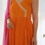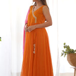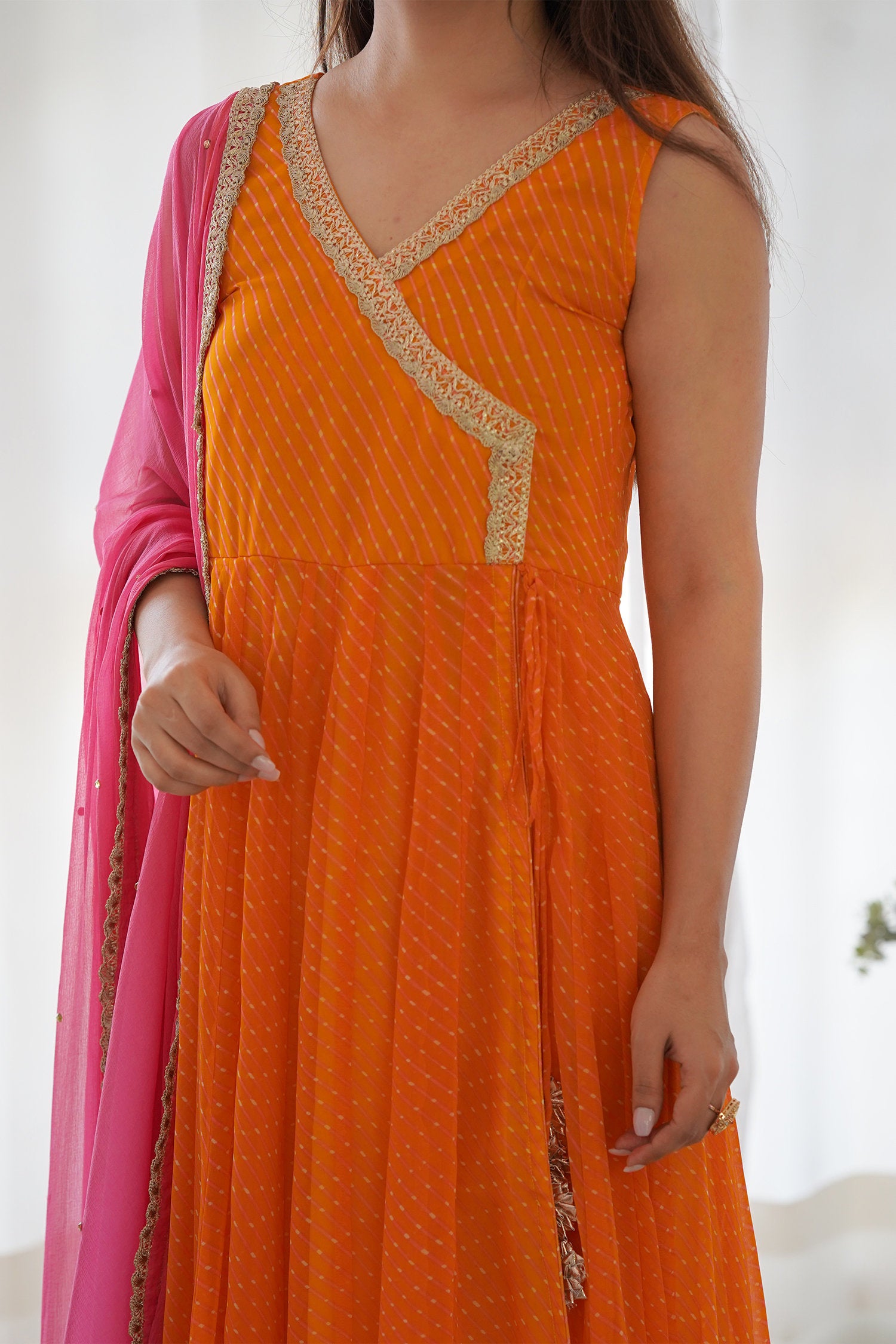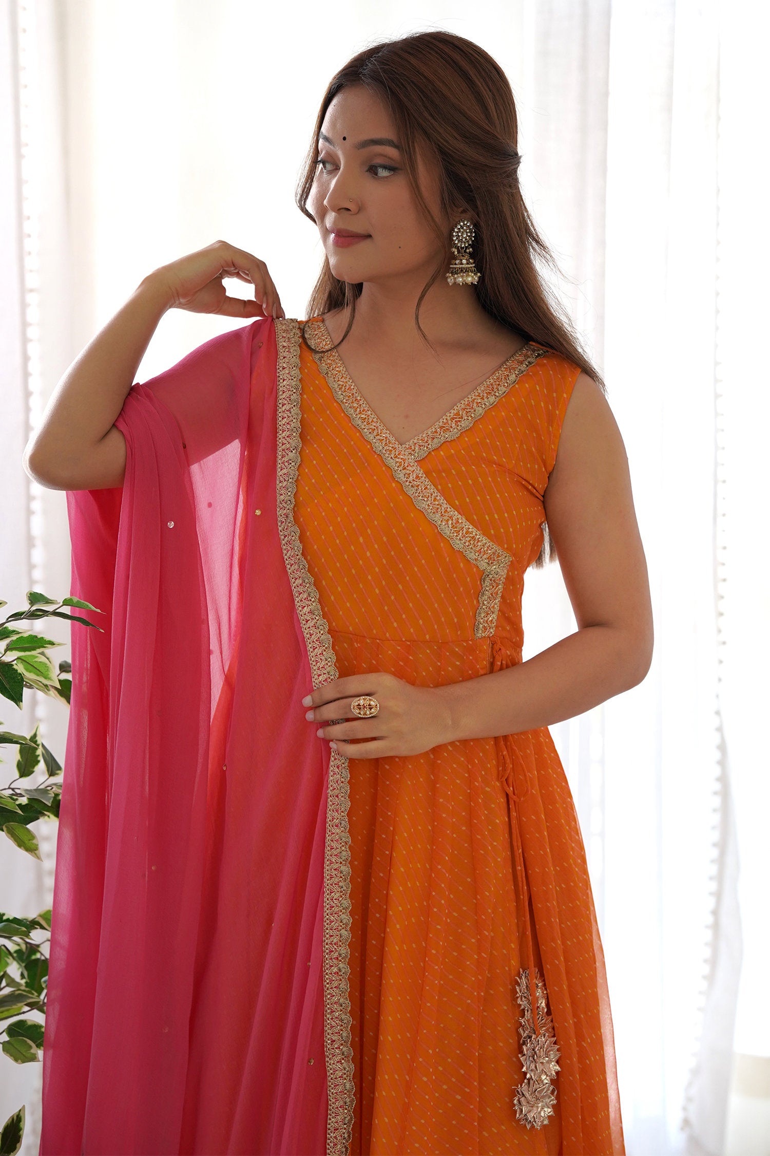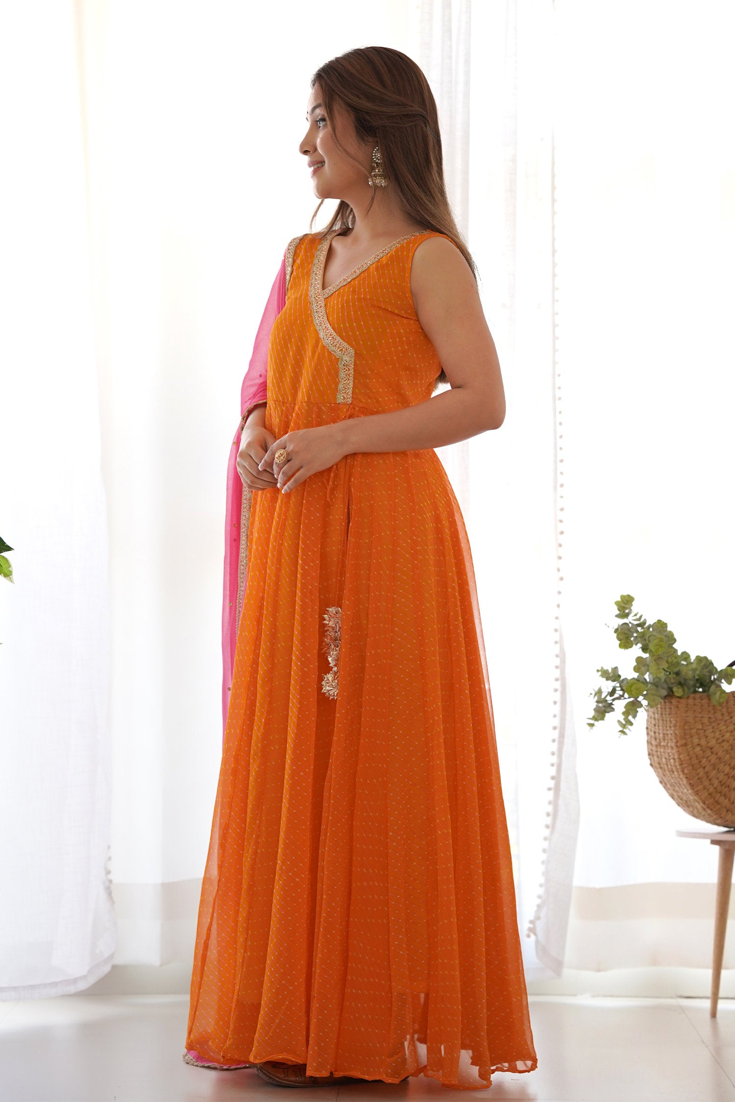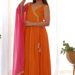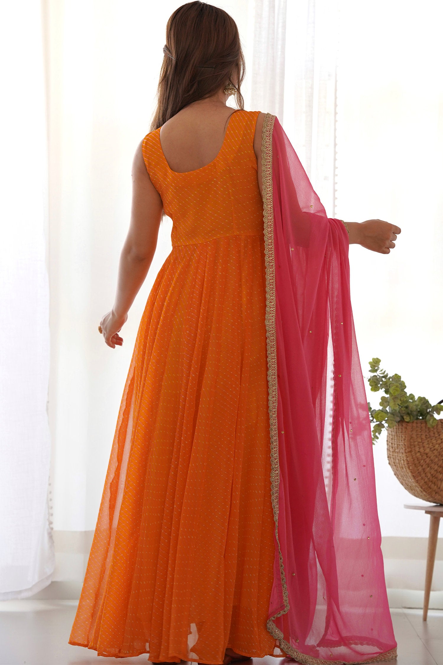 The orange georgette anarkali set with contrast pink dupatta for a majestic appearance and a beautiful flare in every twirl with elegance.