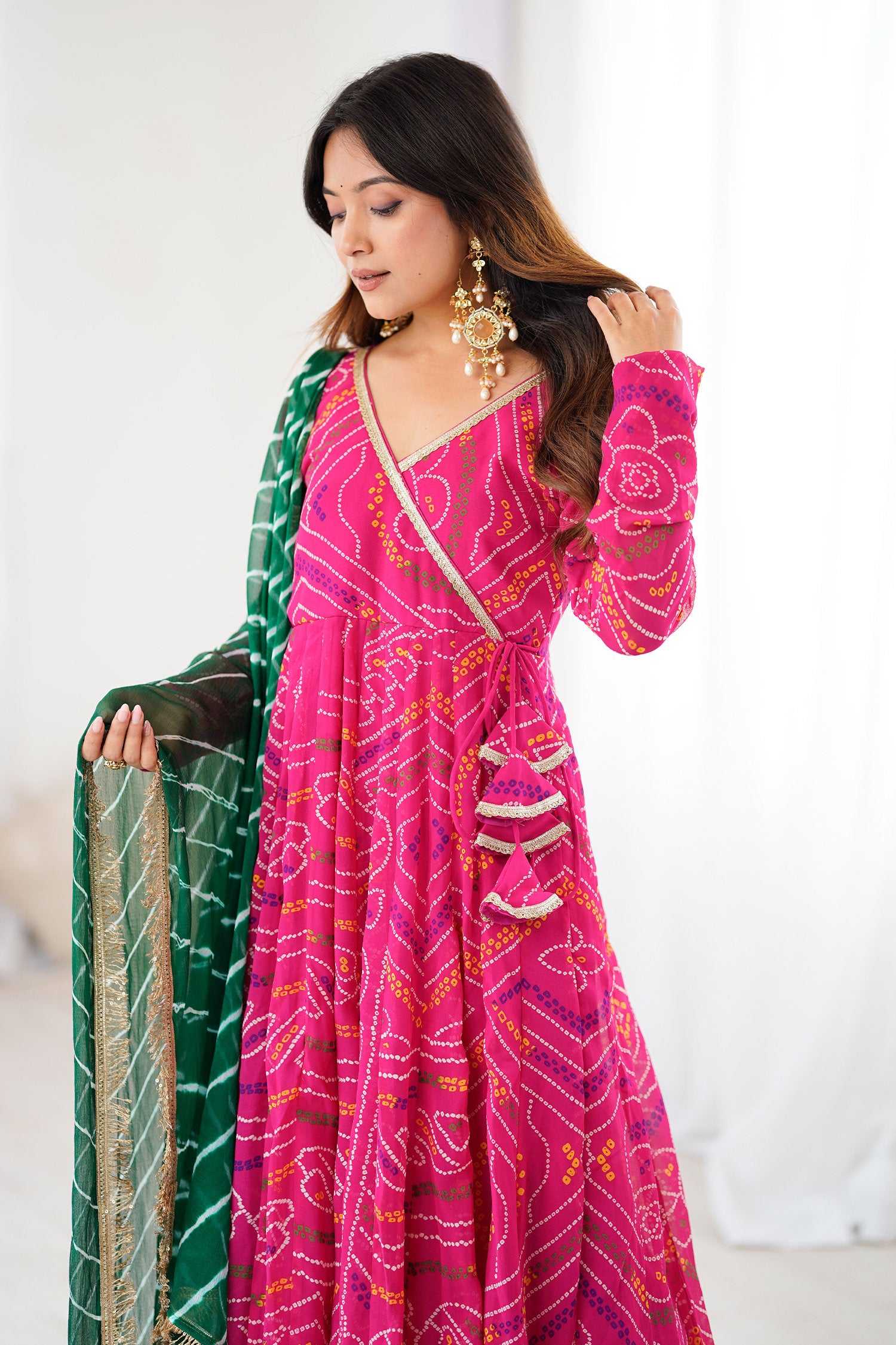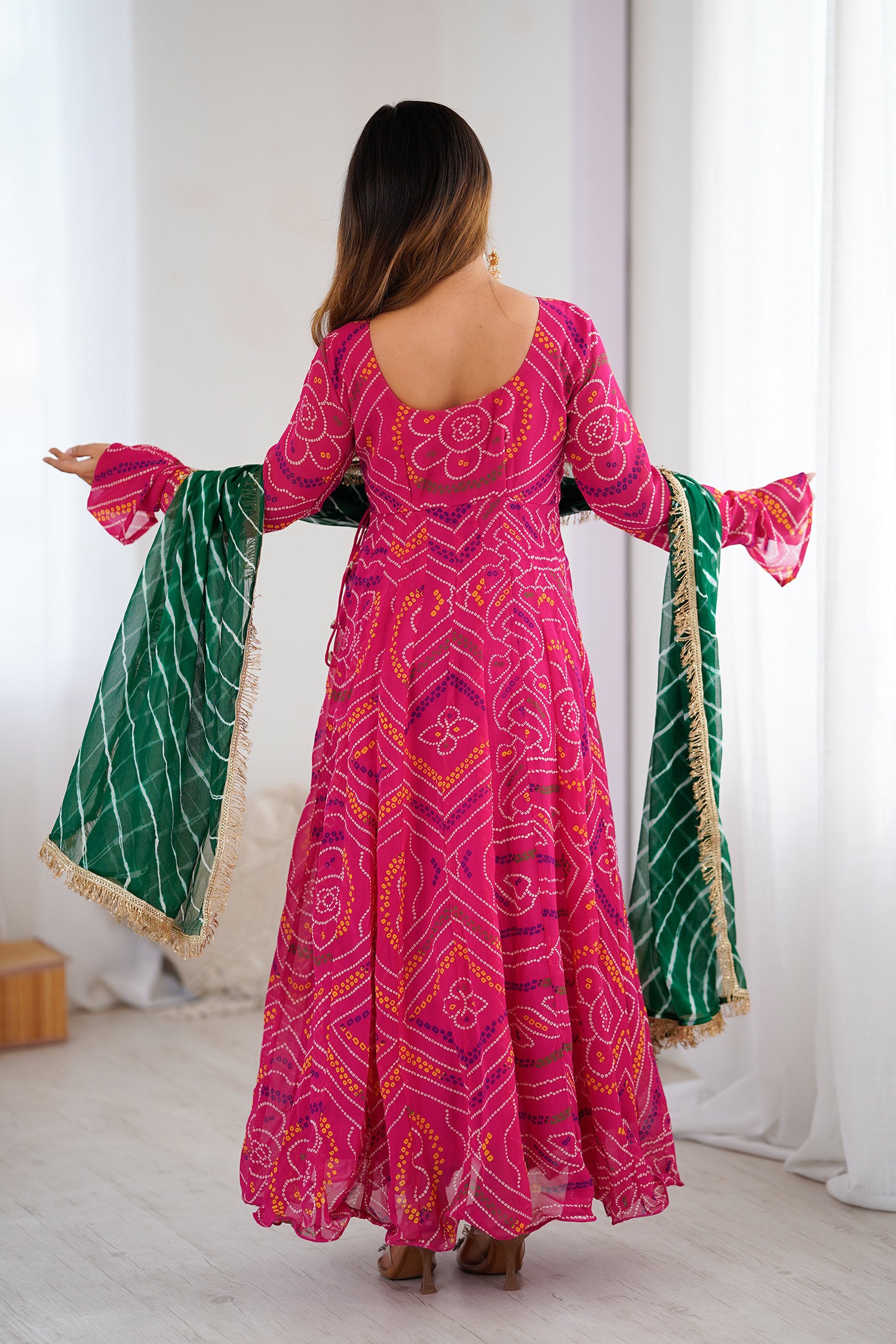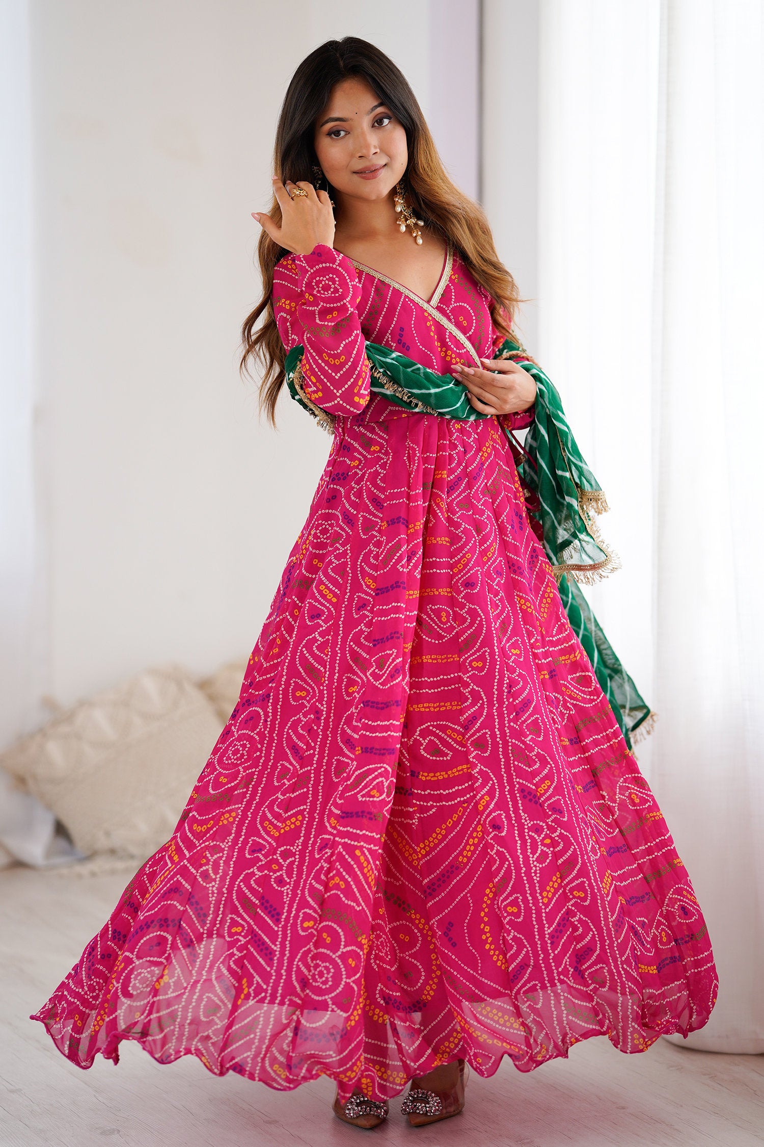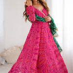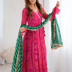 The georgette bandhani Pink flared V-Neck anarkali with contrast green dupatta for a trendy and stylish look with elegance in every twirl.