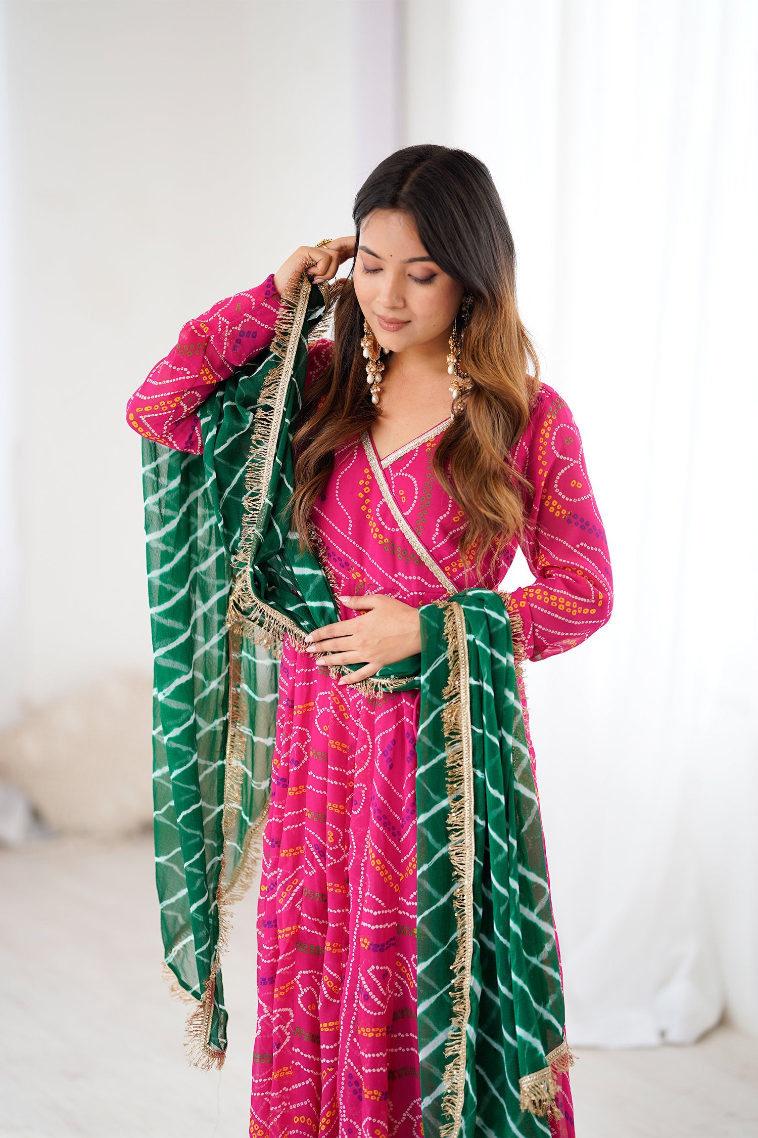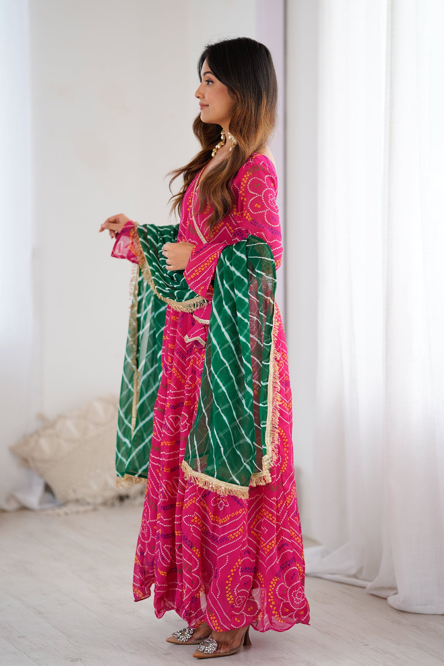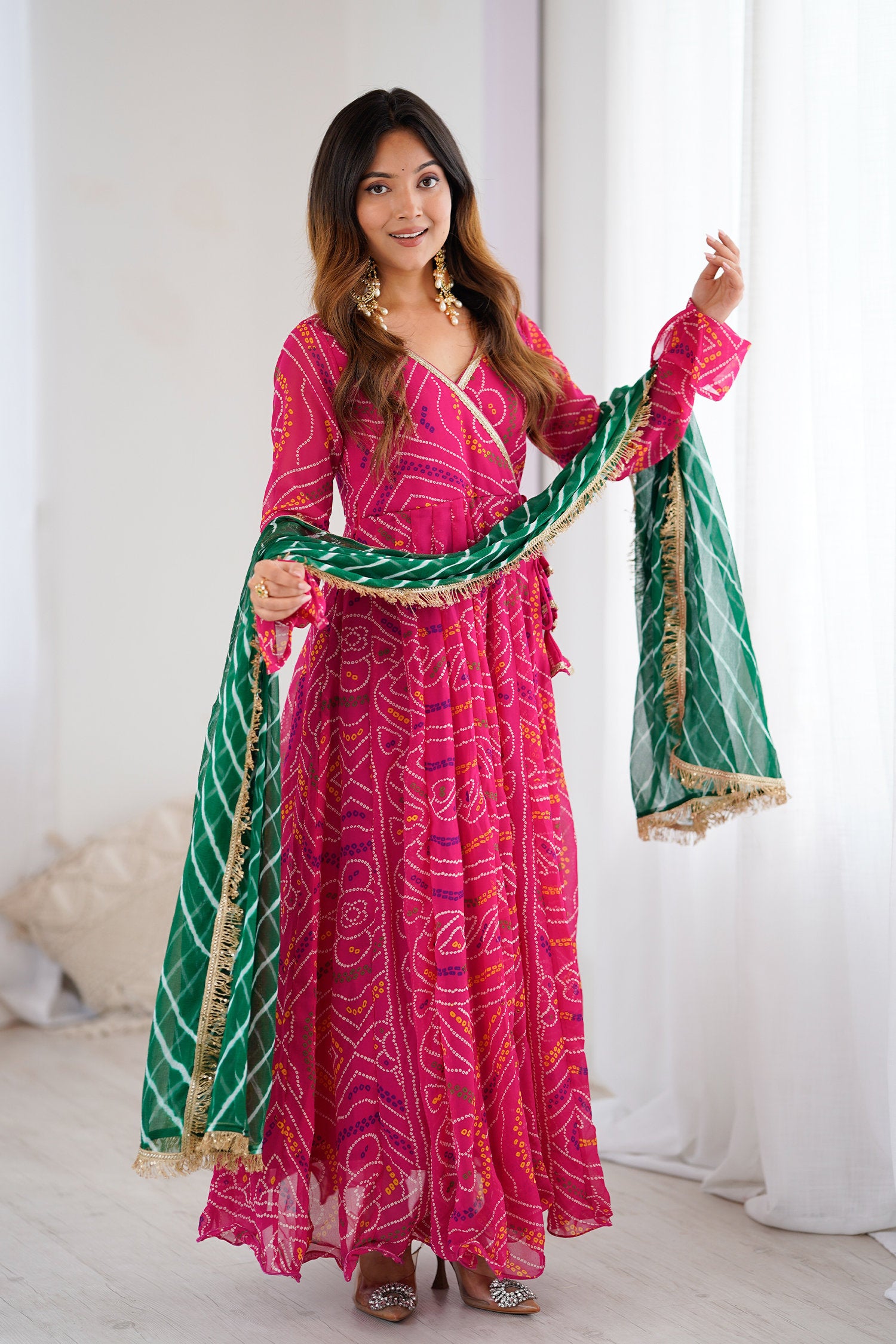 The georgette bandhani Pink flared V-Neck anarkali with contrast green dupatta for a trendy and stylish look with elegance in every twirl.