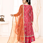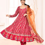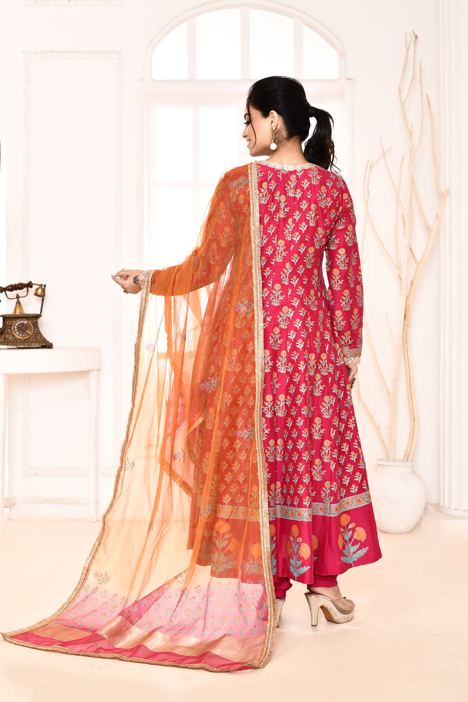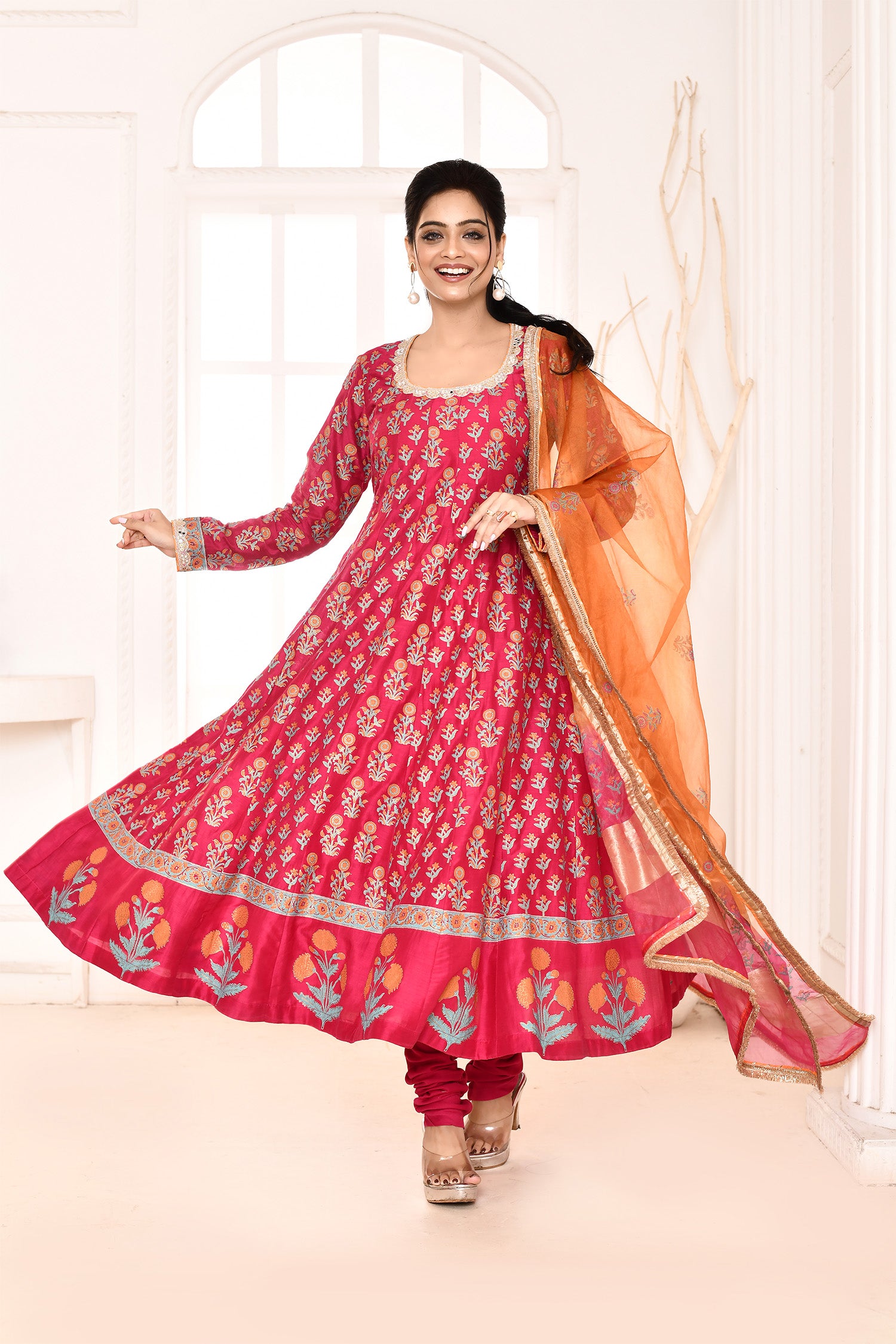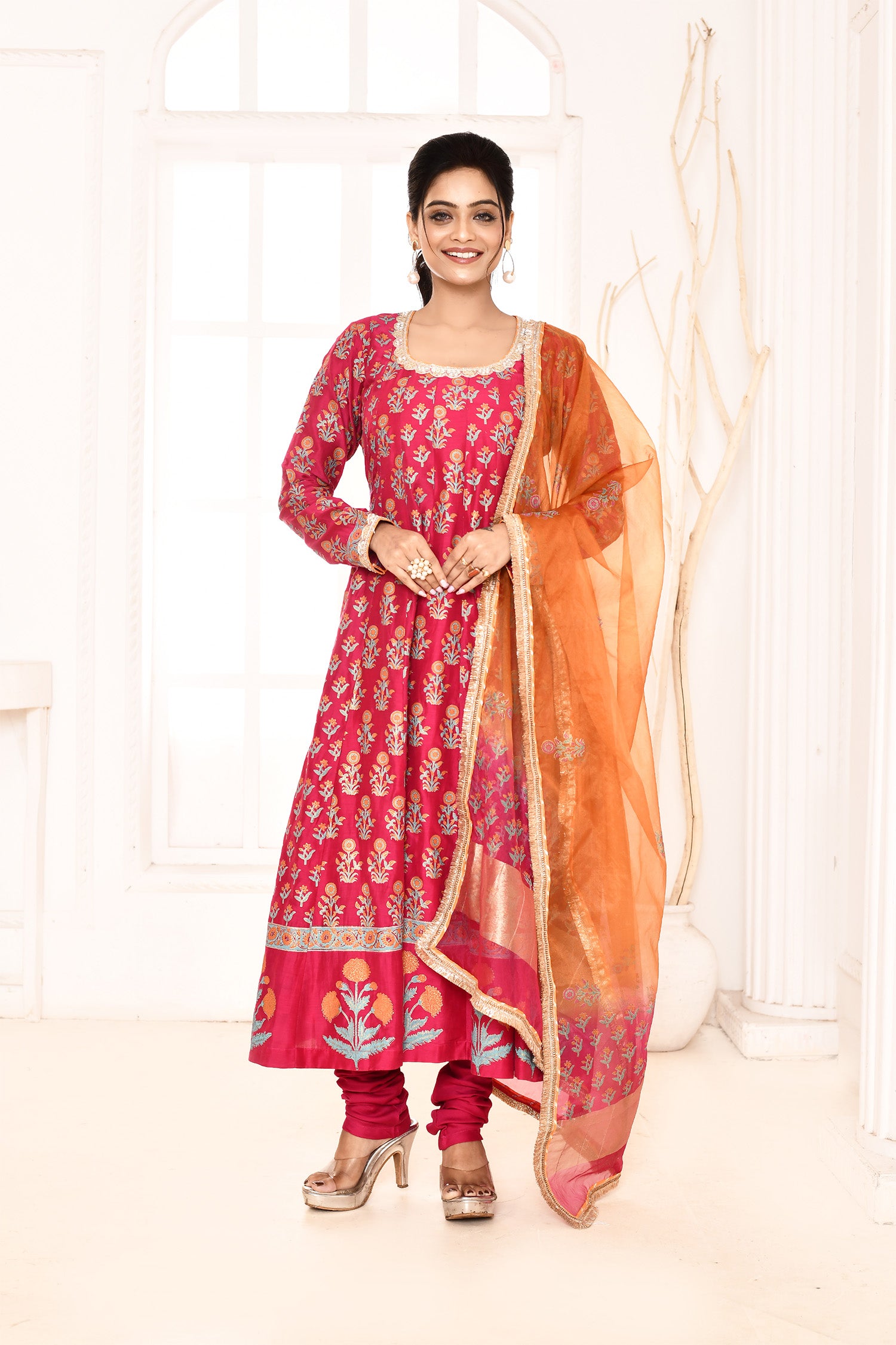 Pink Block Printed Anarkali And Churidar With Orange Lace Finish Dupatta
