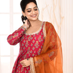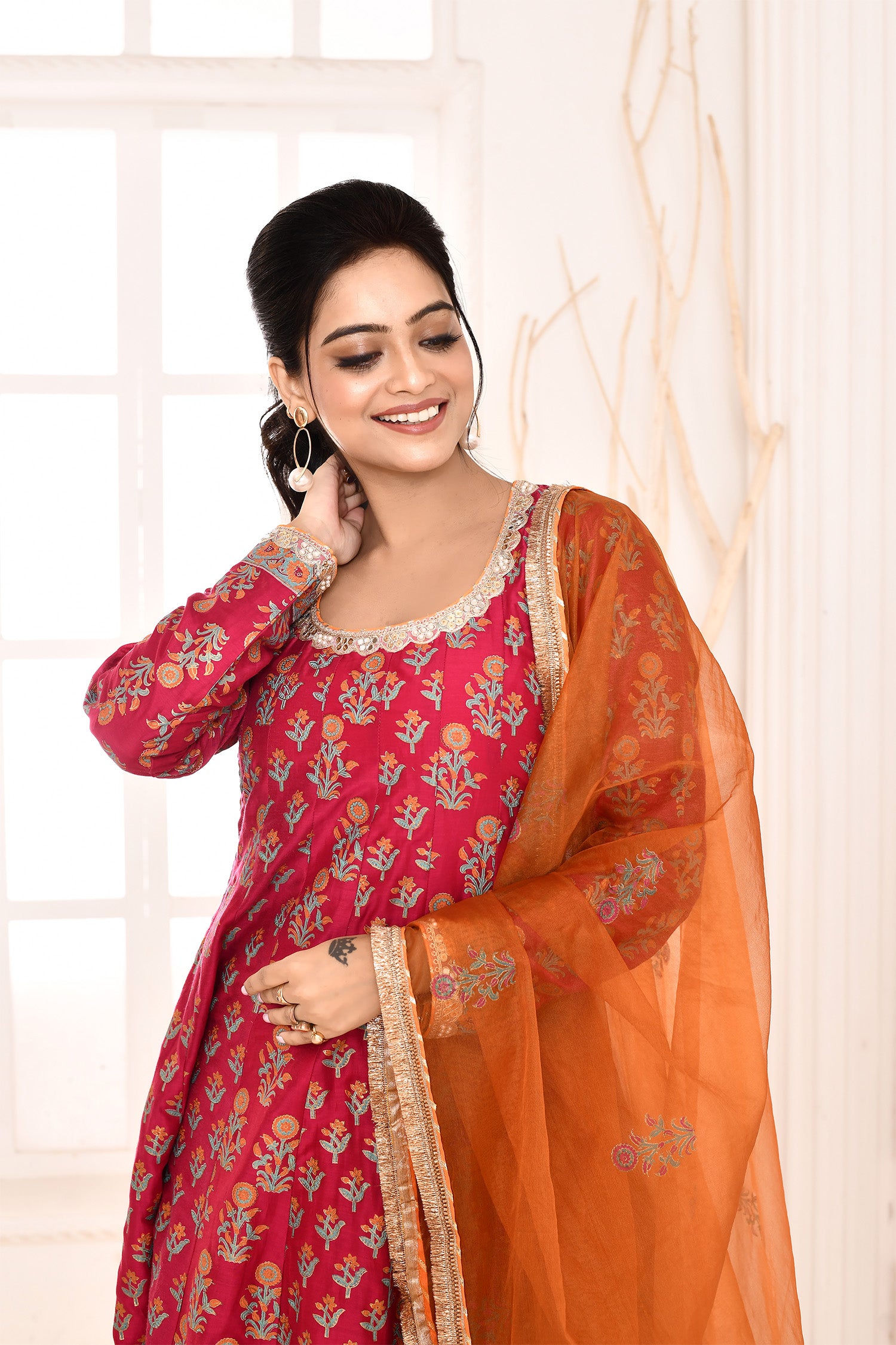The cotton silk Anarkali kurti set with floral design and the matching pants and an contrast chanderi dupatta for a casual yet dignified look along with the stylish comfort.