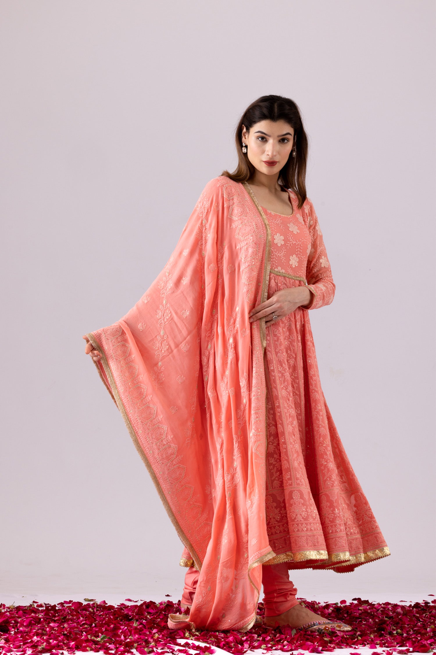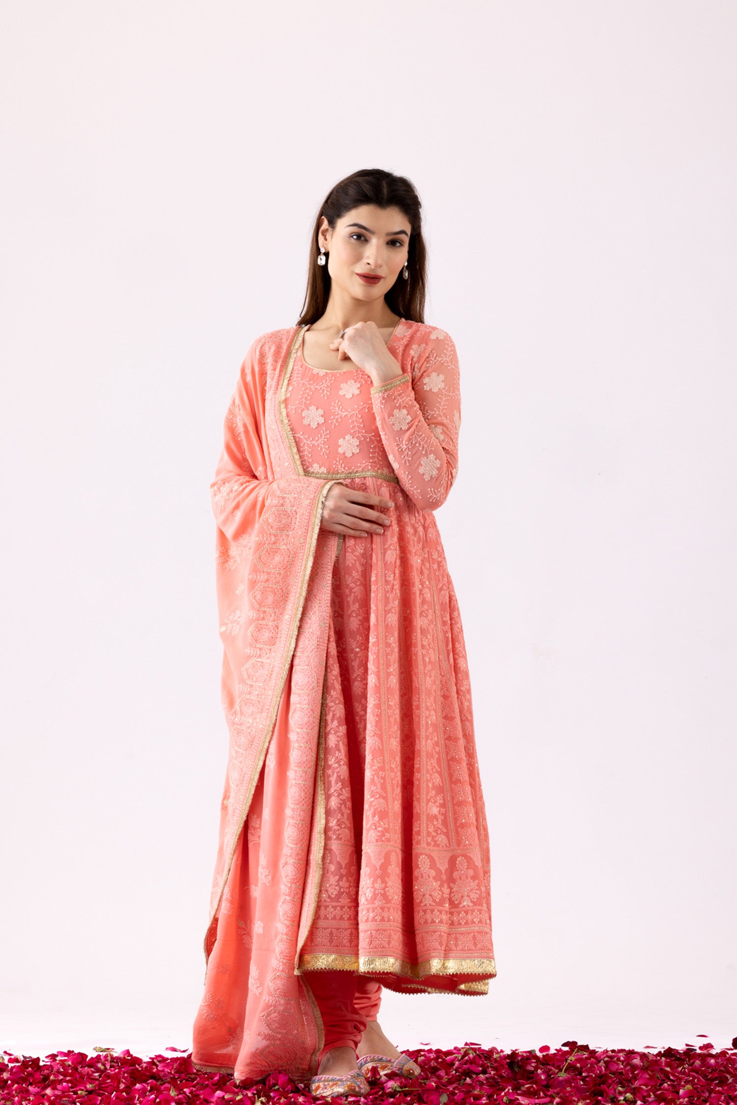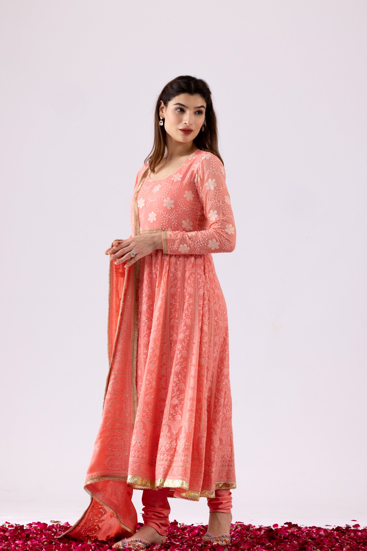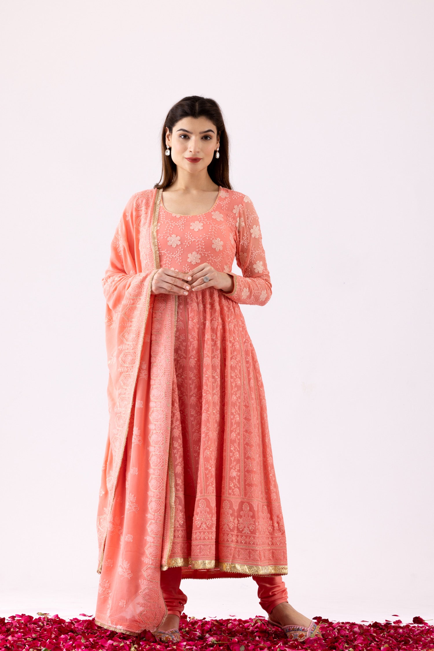 The Beautiful Pink Georgette Chikankari work finish Anarkali Kurti Along with a matching churidar pant and a georgette dupatta with lace finish casual and simple yet Elegant look.