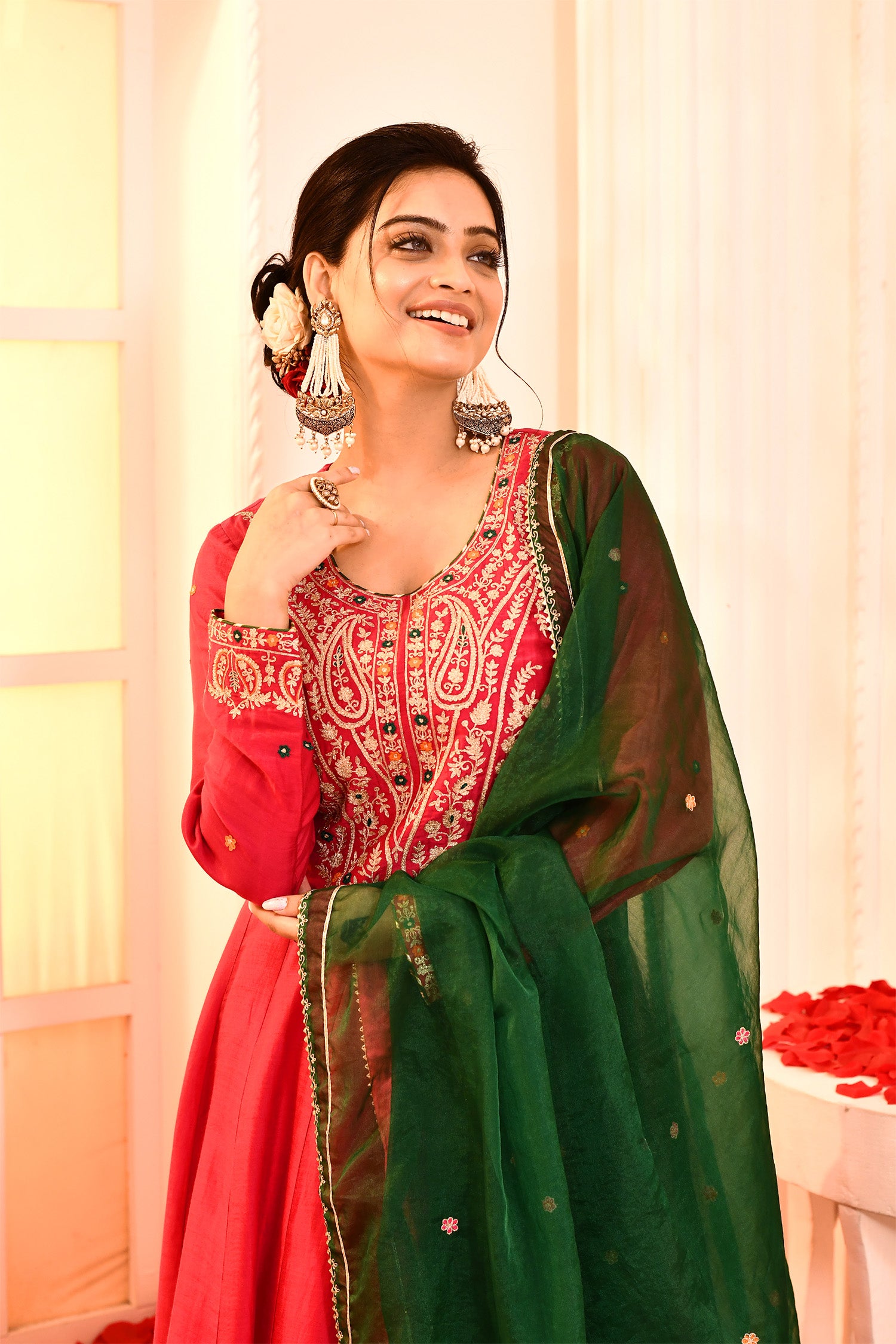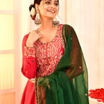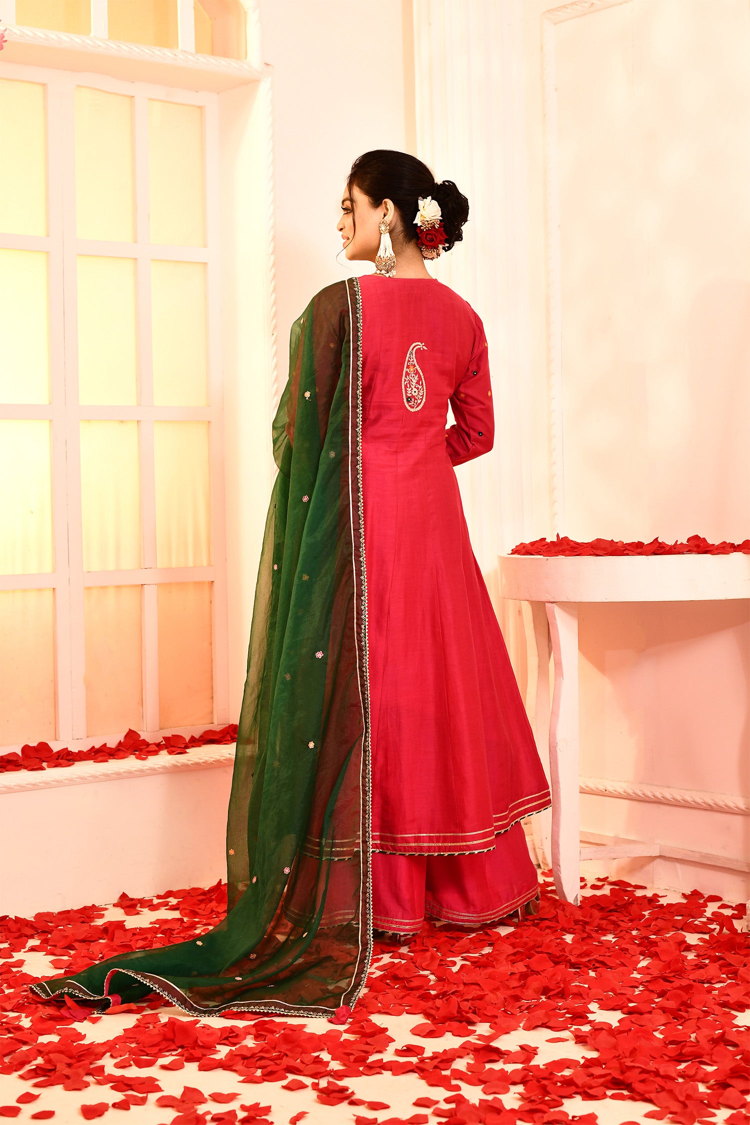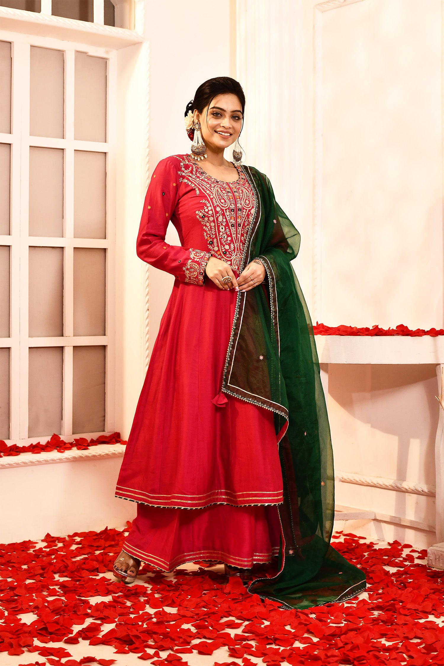 Red Embroidery Neck Anarkali And Gottalace Finish Flair Palazzo Set