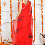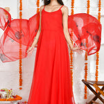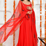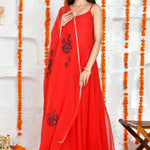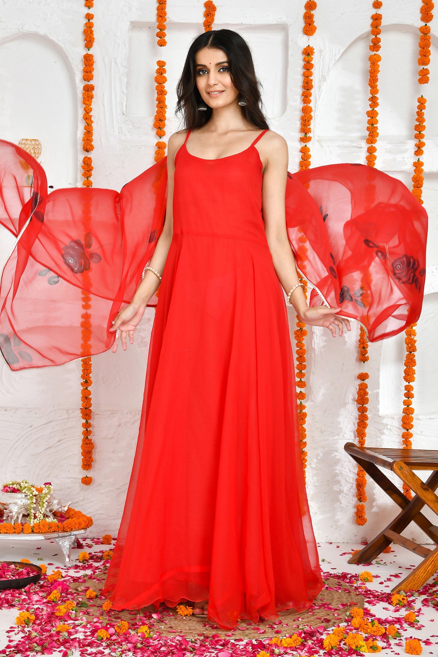 This majestic Red georgette anarkali set features sleeveless and plain anarkali complemented with floral printed dupatta to complete the look.
