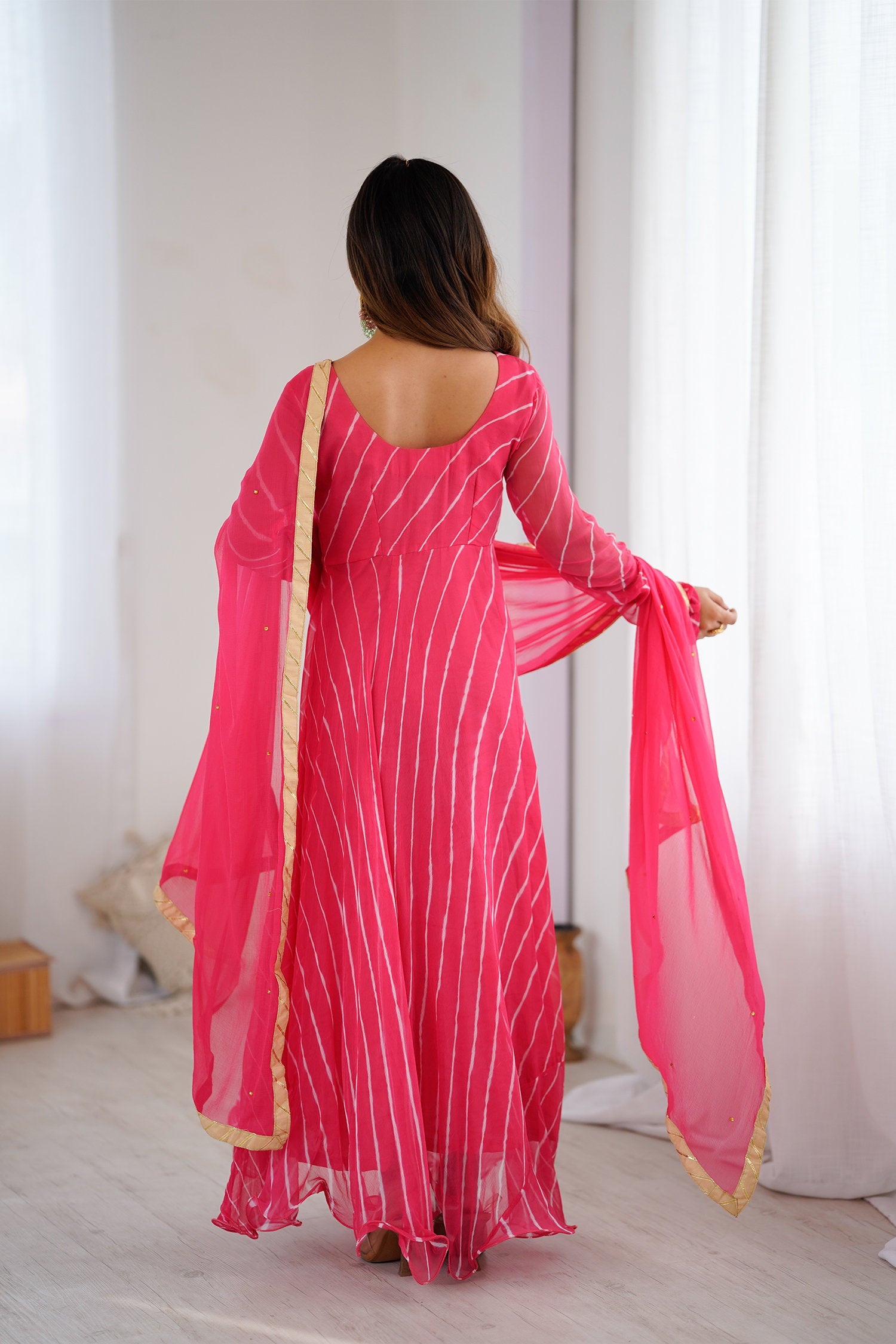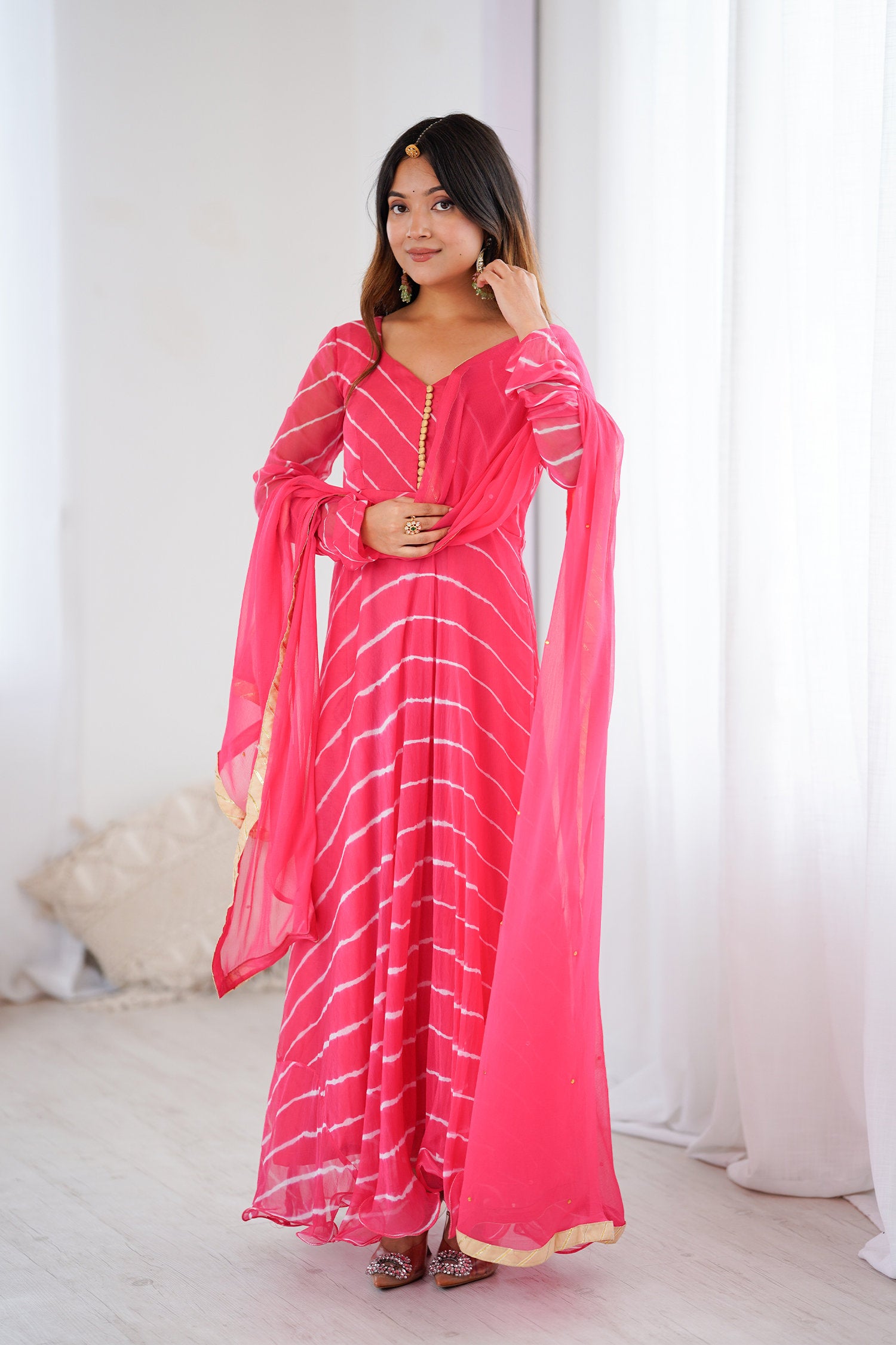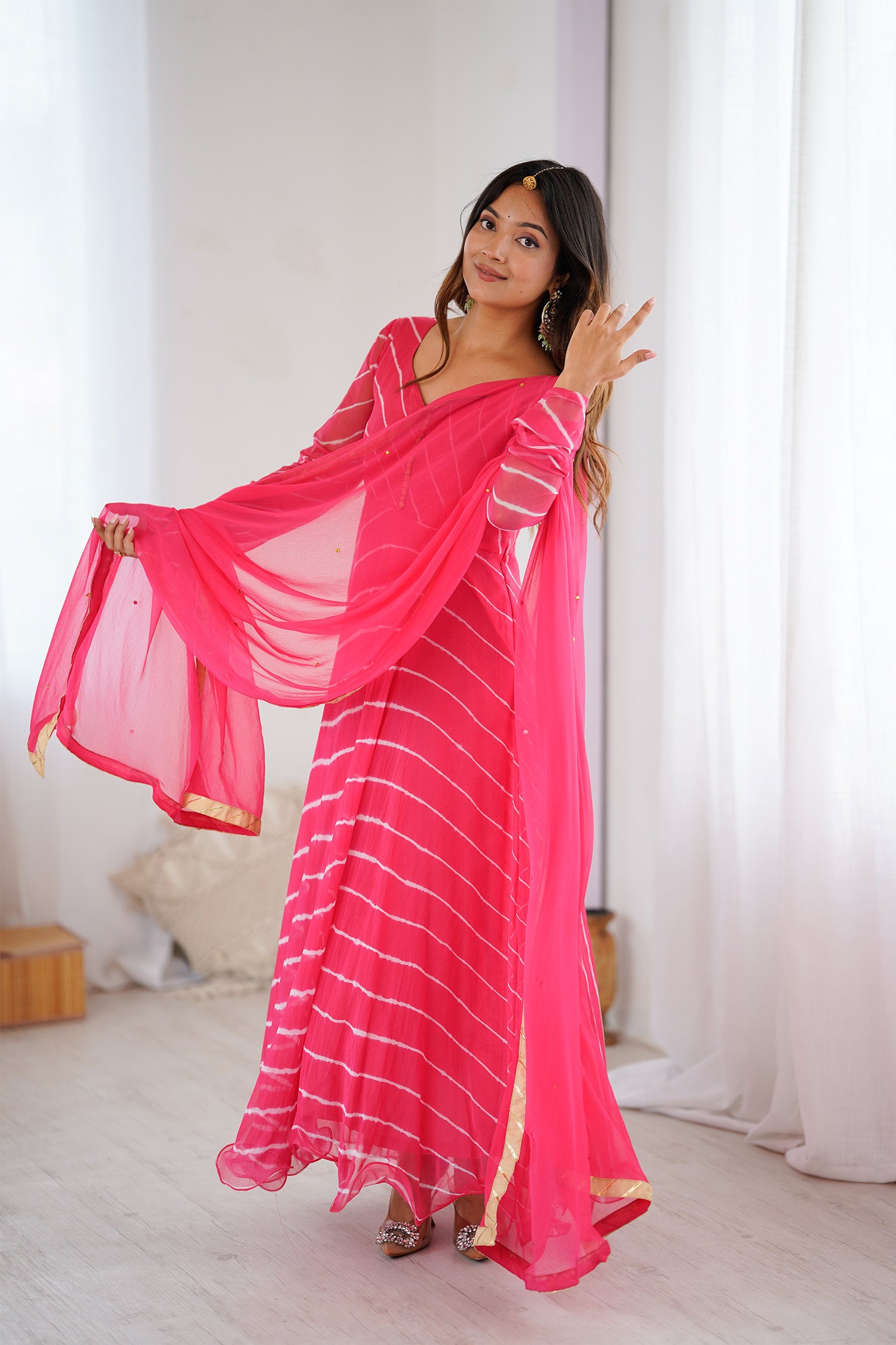 The rose pink anarkali set with a chiffon pink flared kurta and a matching dupatta for a trendy and stylish look with elegance in every twirl.