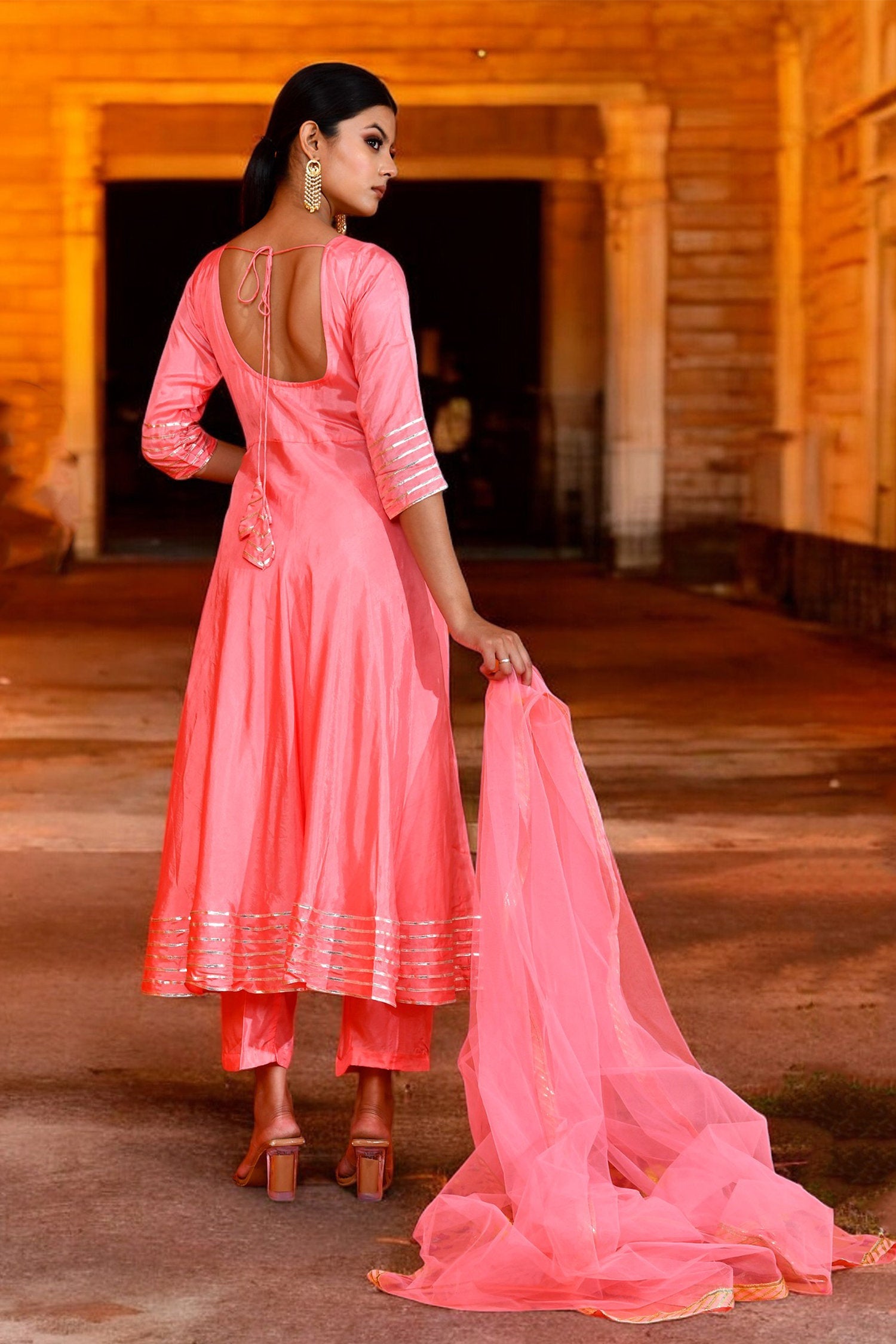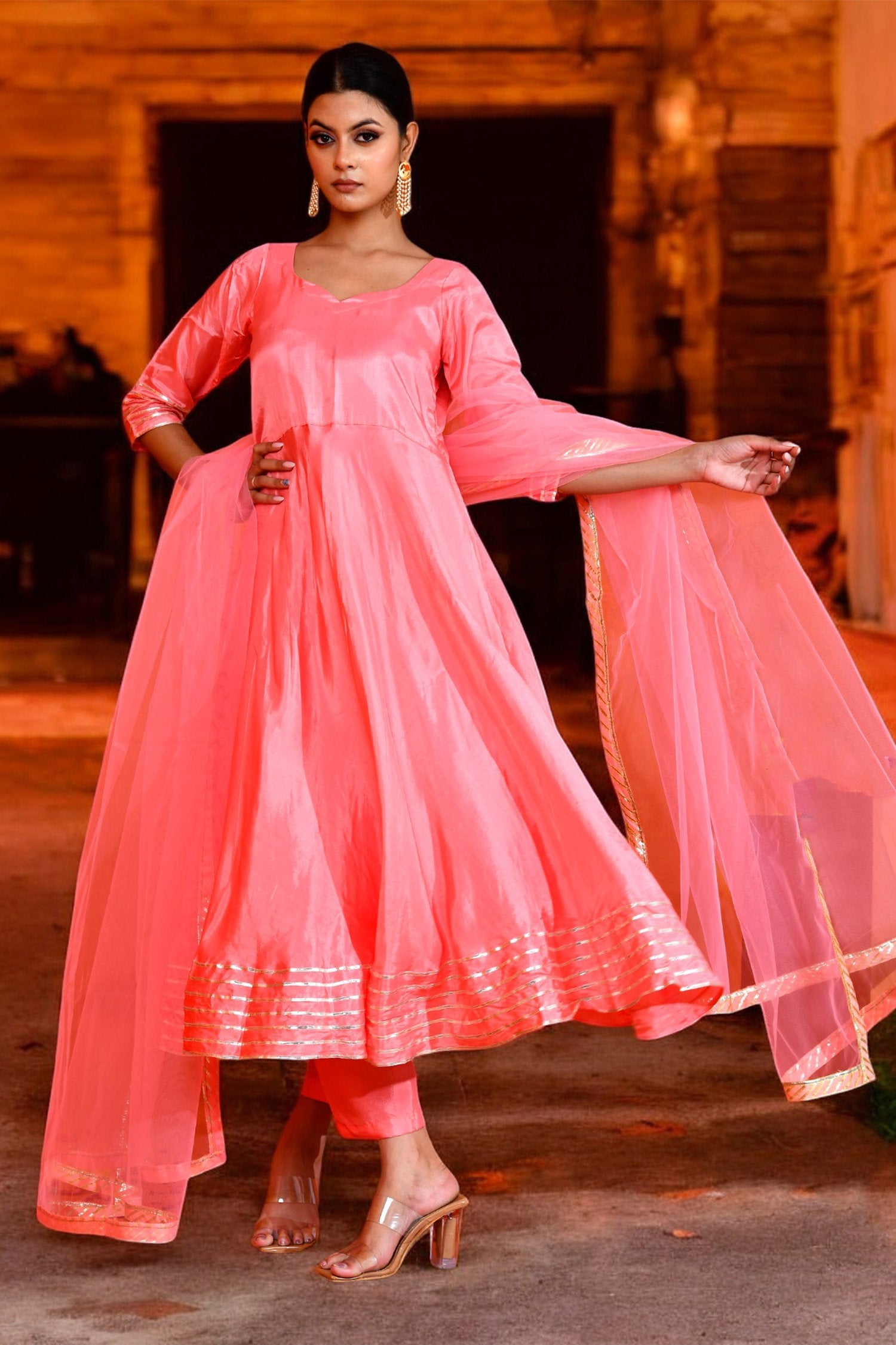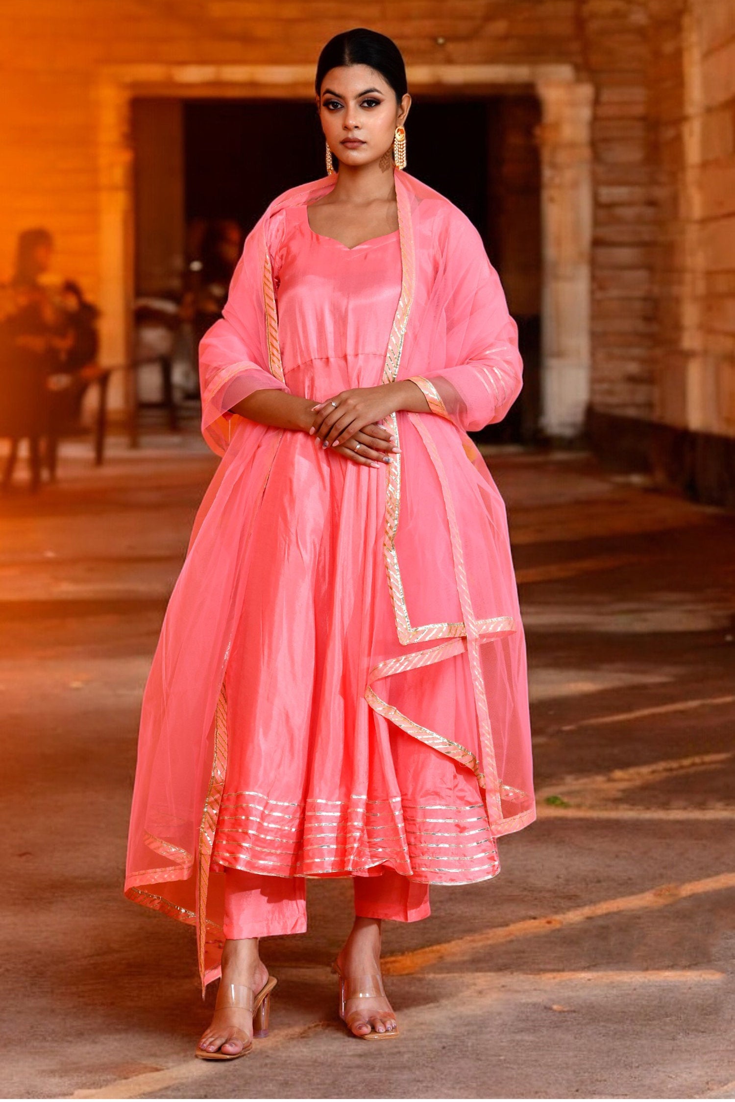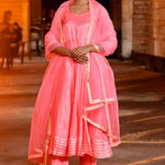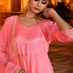 Soft pink uppada silk anarkali set features V neckline and sleeves paired with matching pants.The matching dupatta adorned with gota lace making it look classy for any occasions