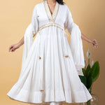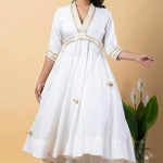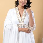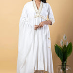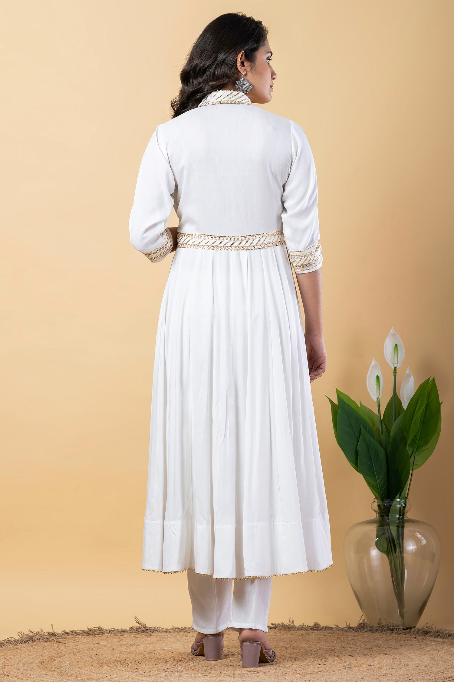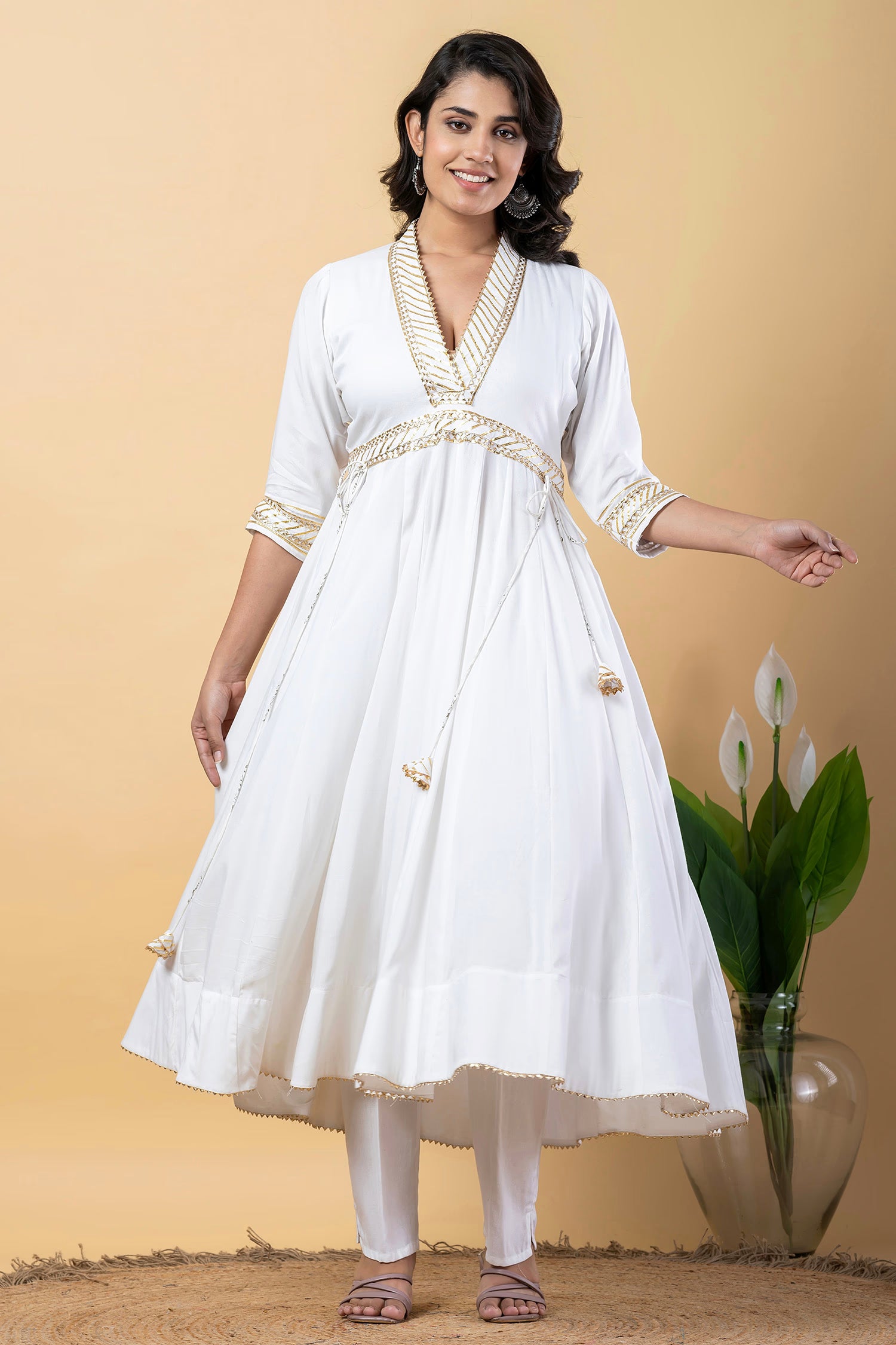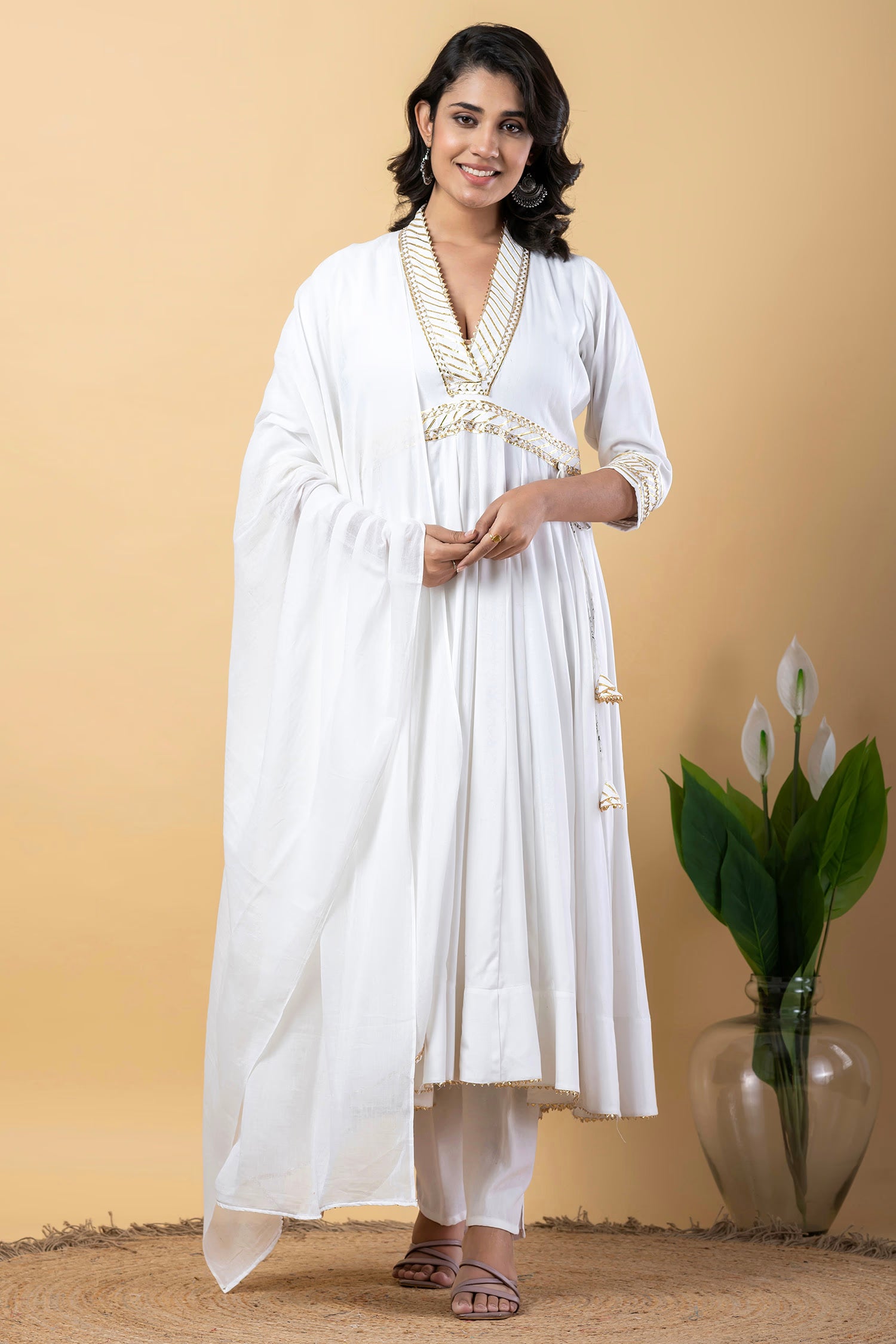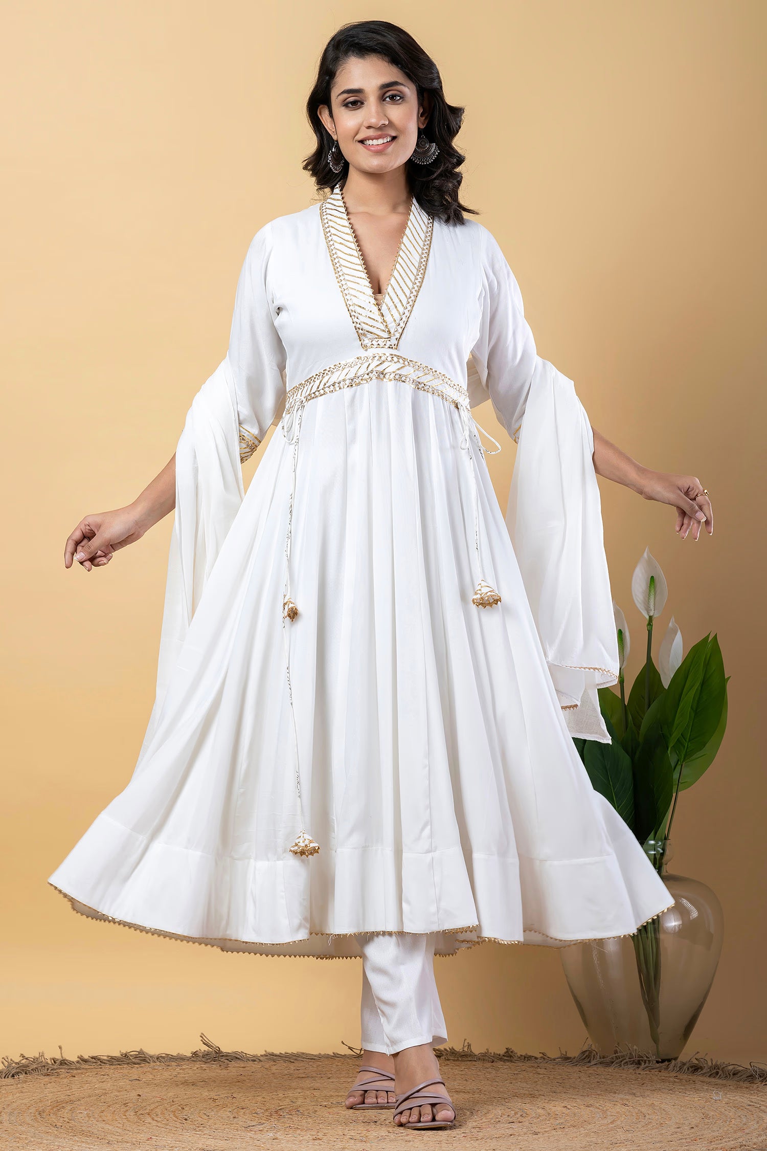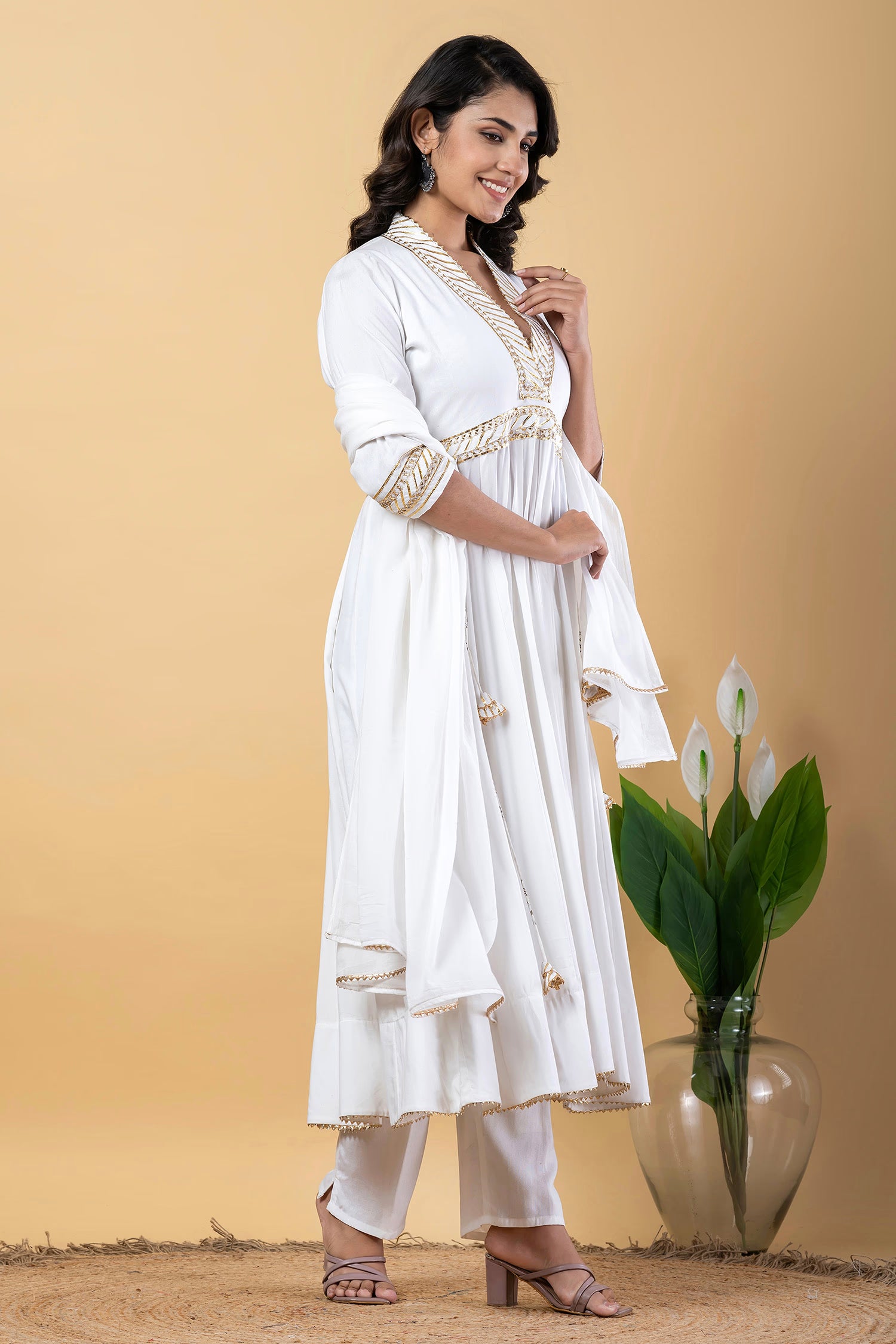 The V neckline and mid-forearm sleeves of white rayon anarkali adorned with gotta patti complemented with pants and dupatta