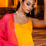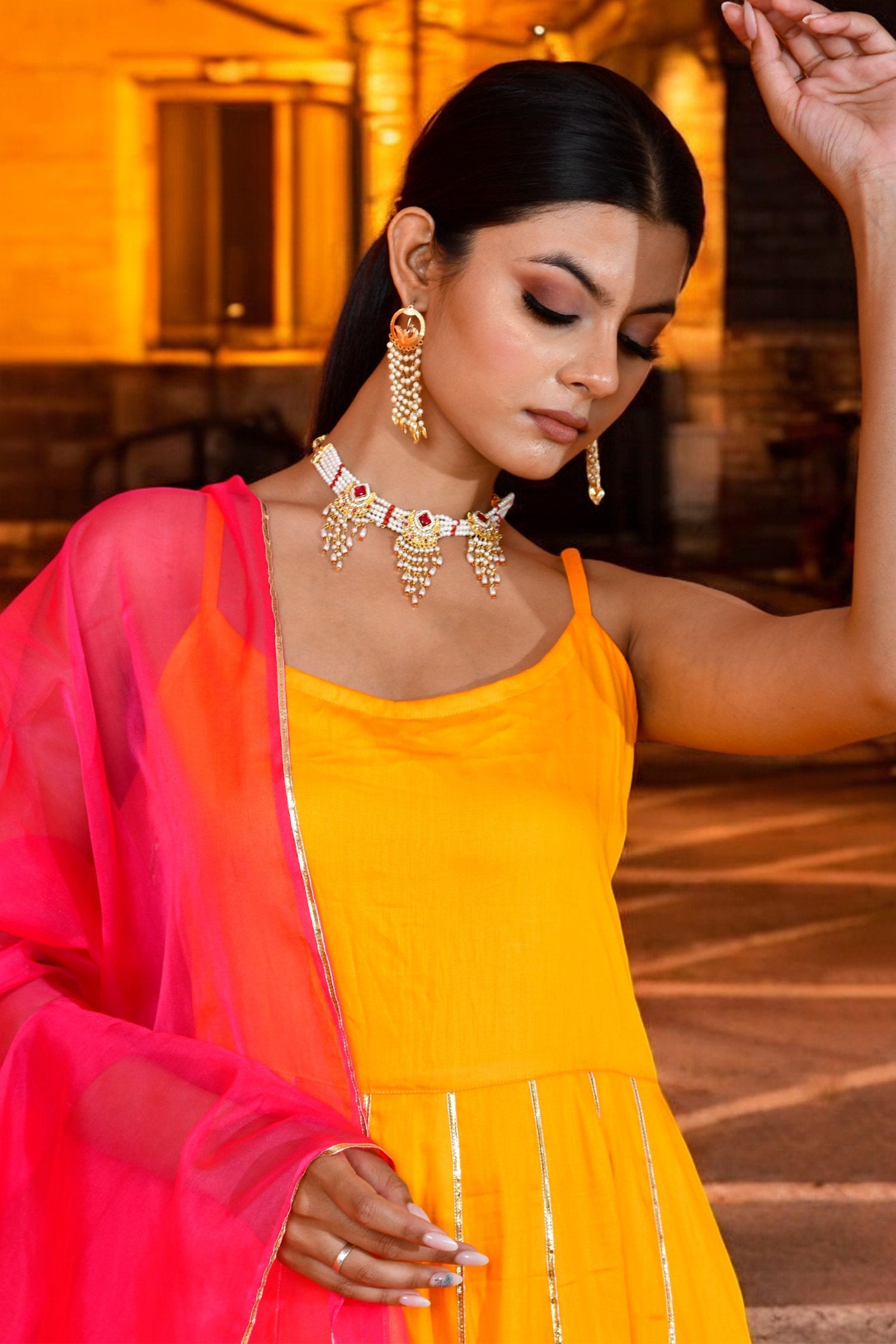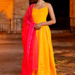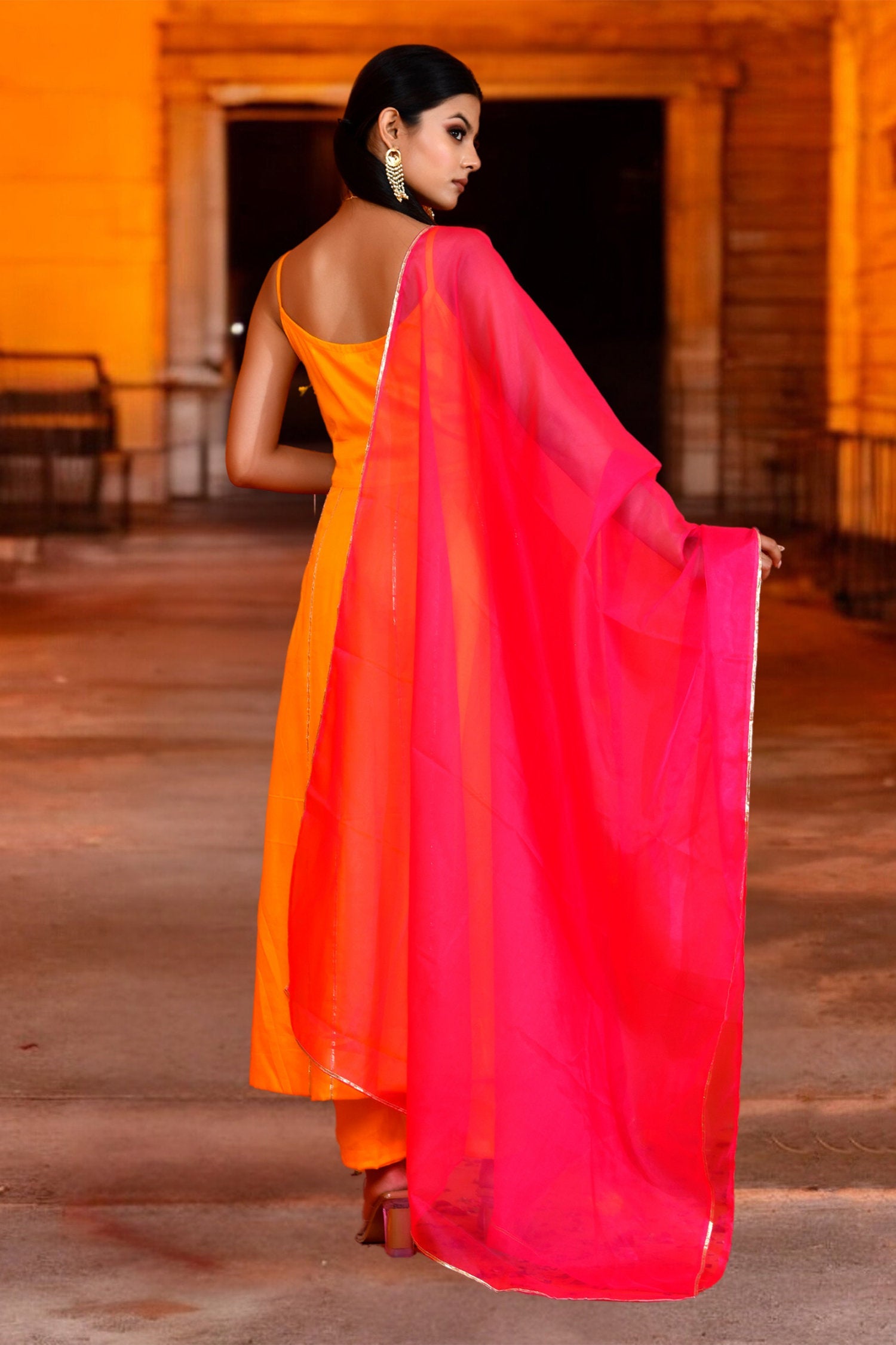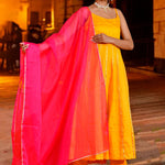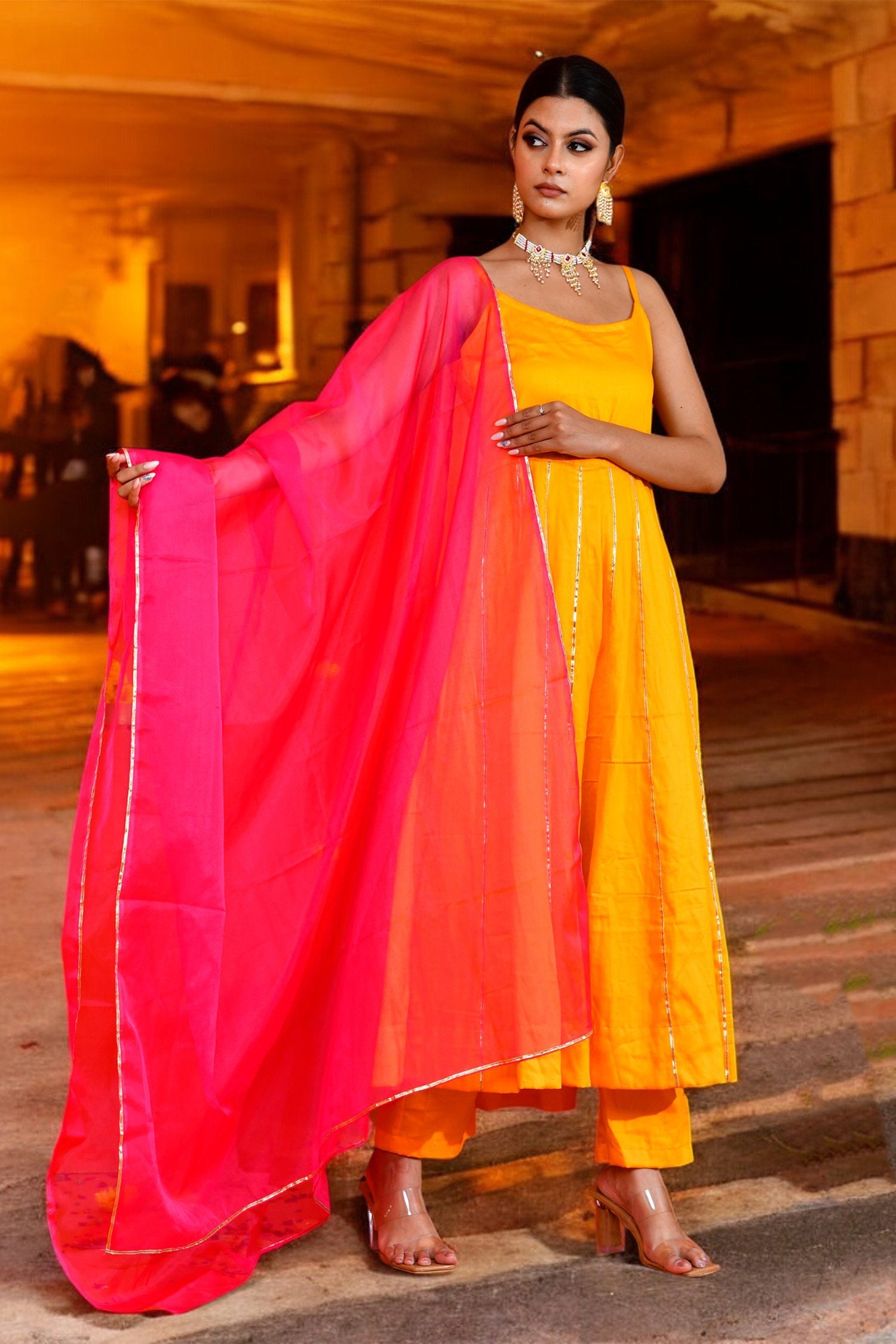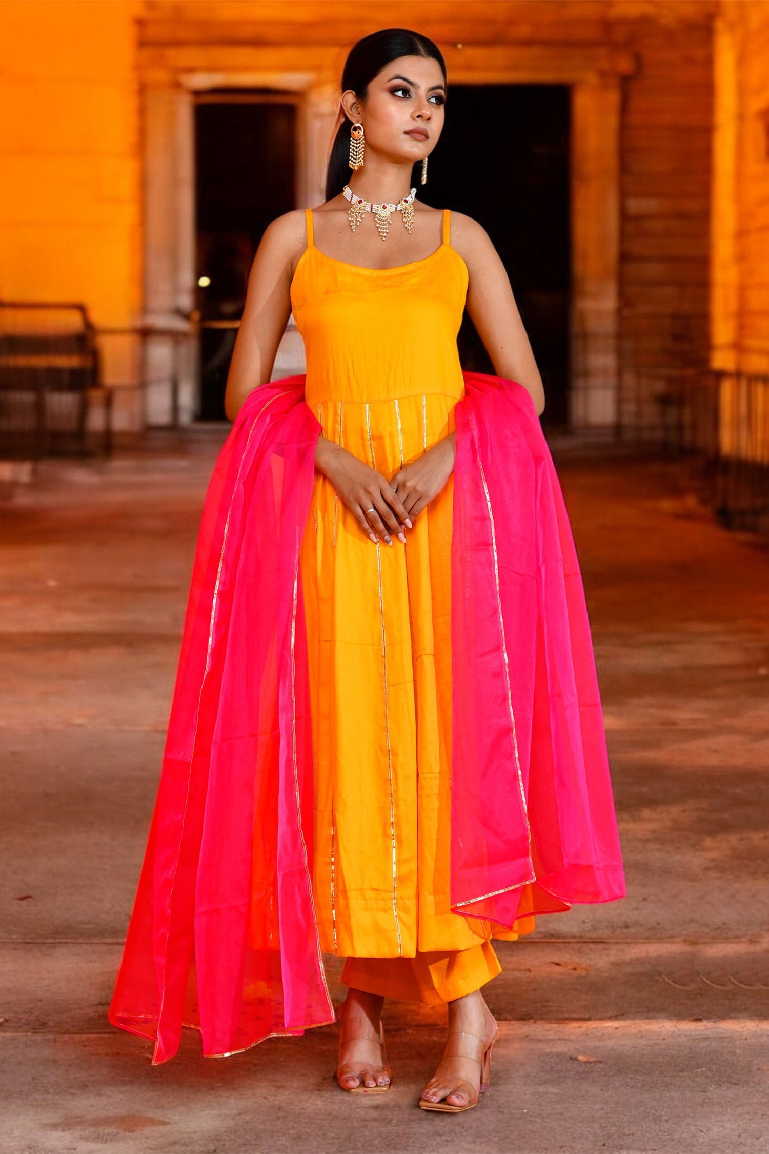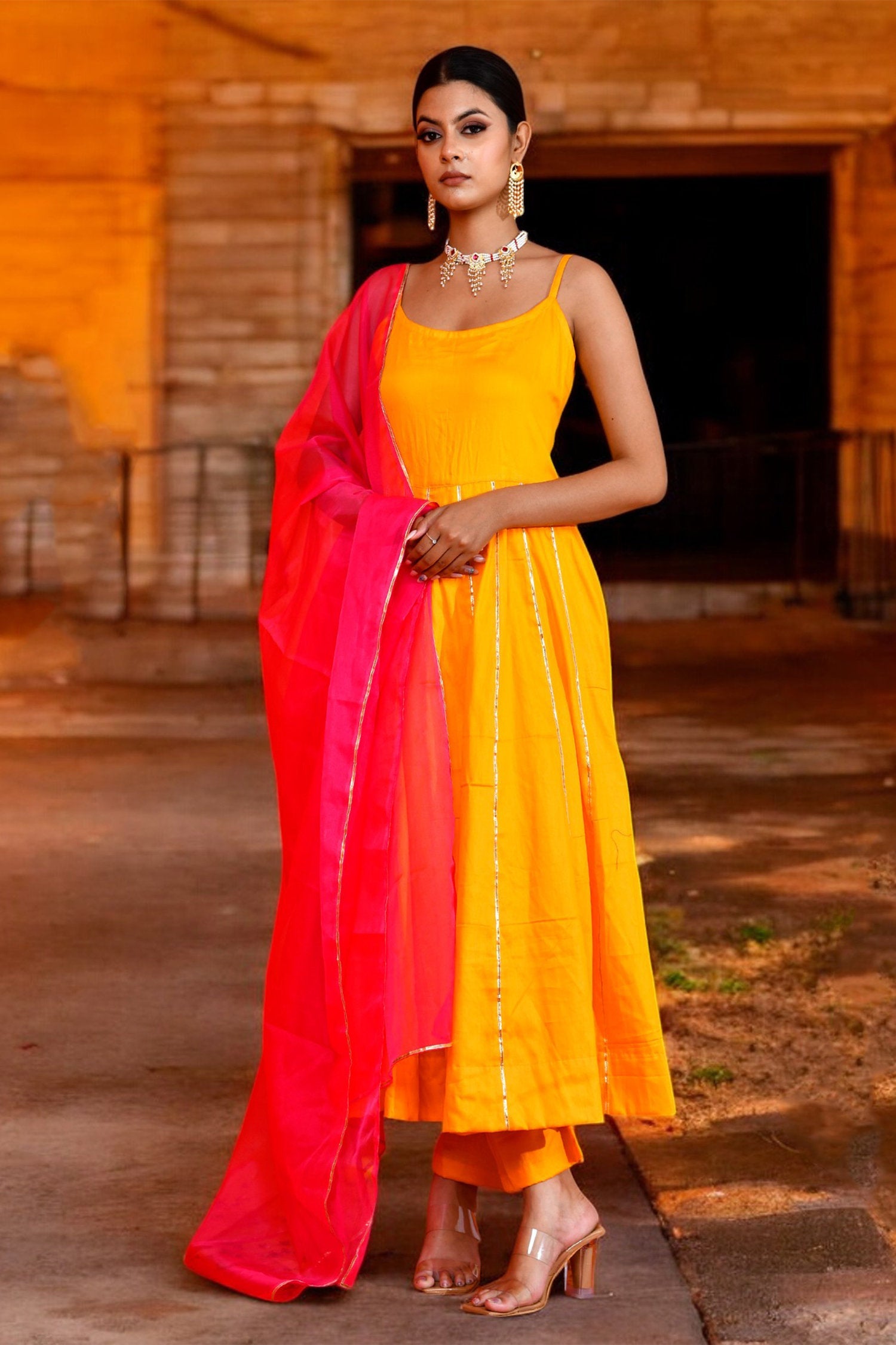Yellow cotton silk anarkali set features round neckline and sleeveless top and matching pants. The organza dupatta of contrast color adorned with embroidery around the border making it a ideal choice for any event.