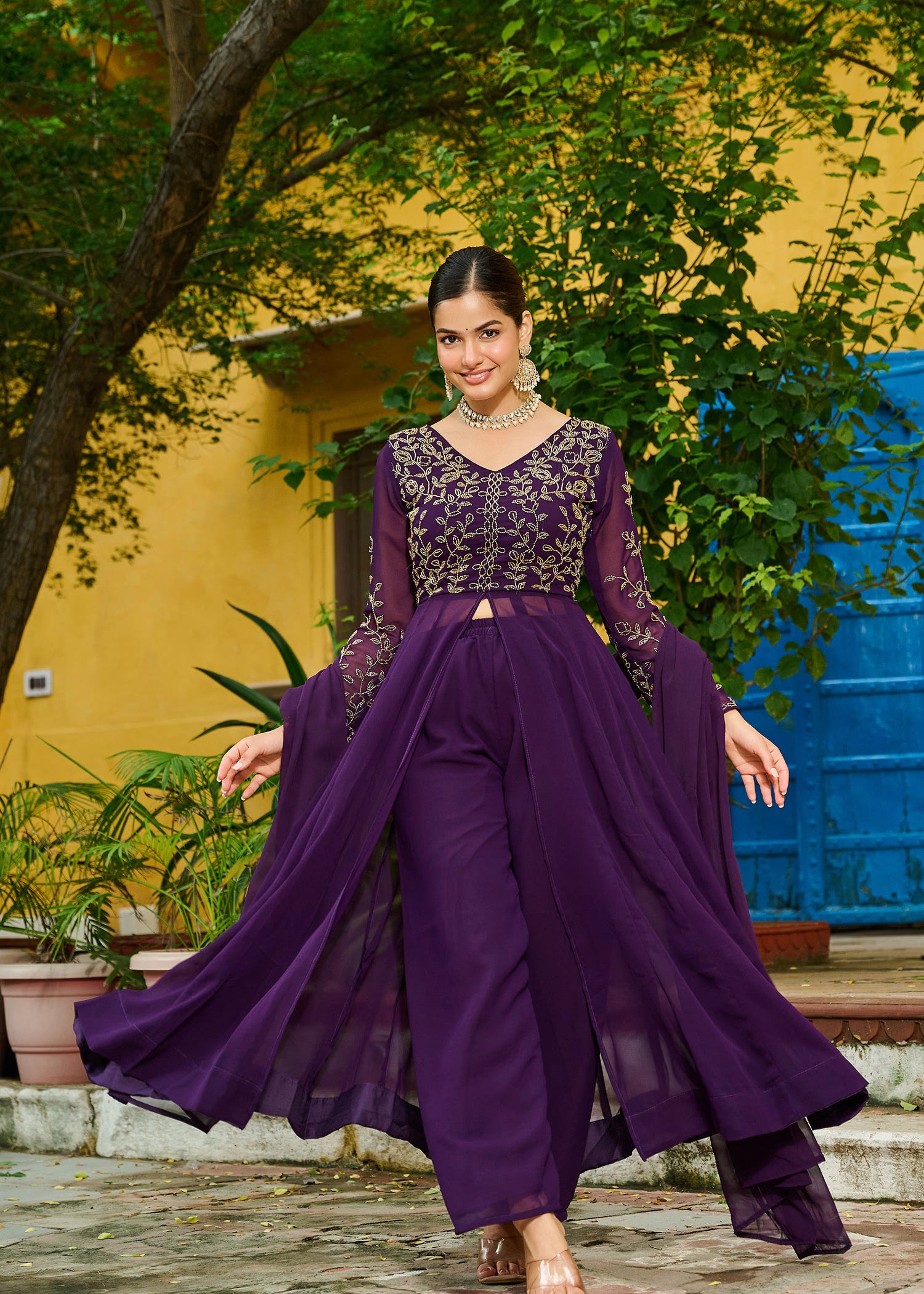 Purple Faux Blooming Embroidered Anarkali Set With Slit