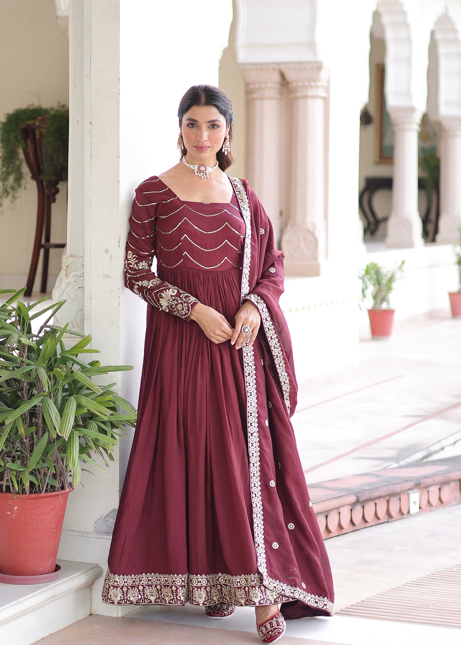 Dark Maroon Vichitra Silk Anarkali Set With Sequins Work