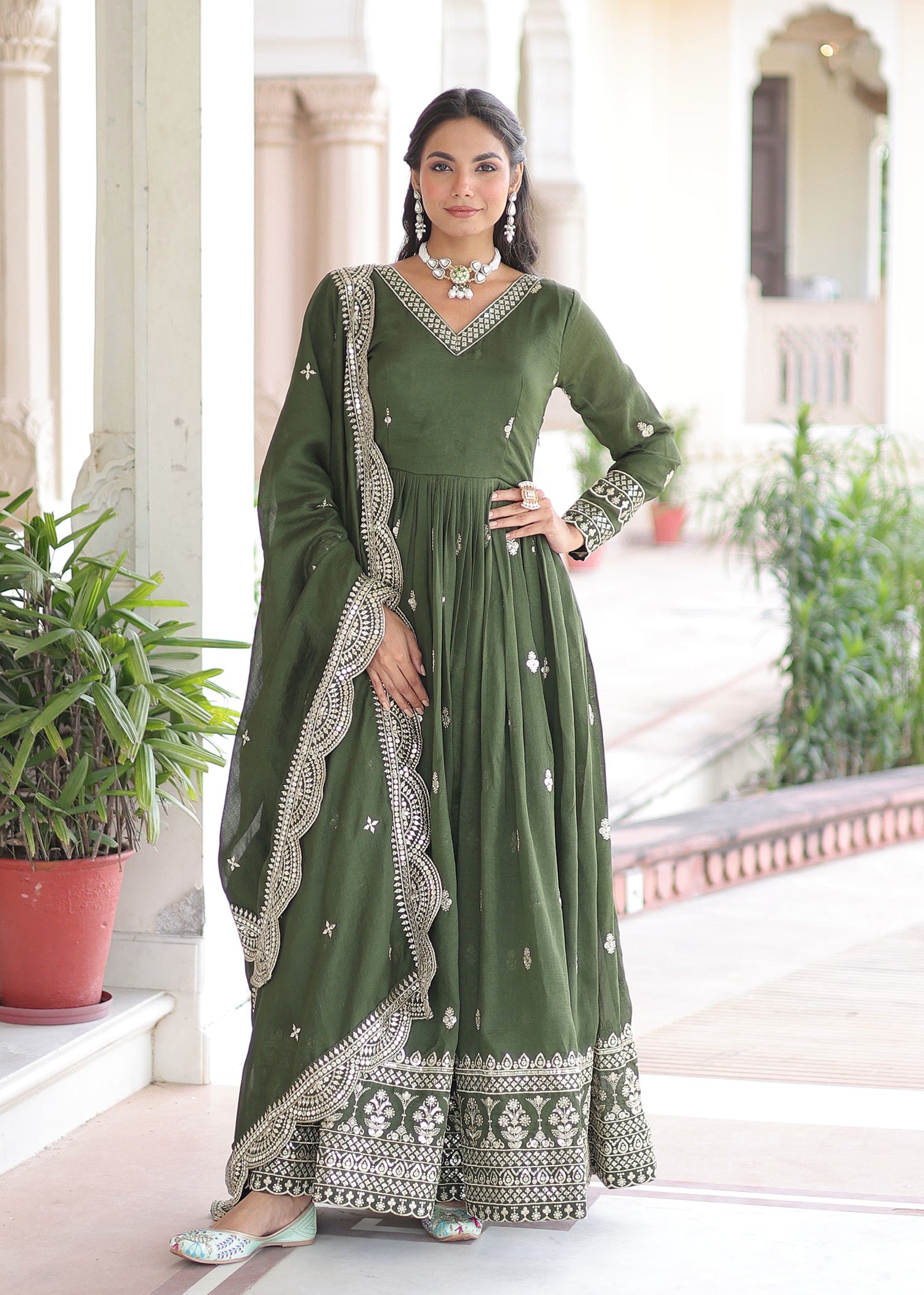 Green Vichitra Silk Embroidered Anarkali Set