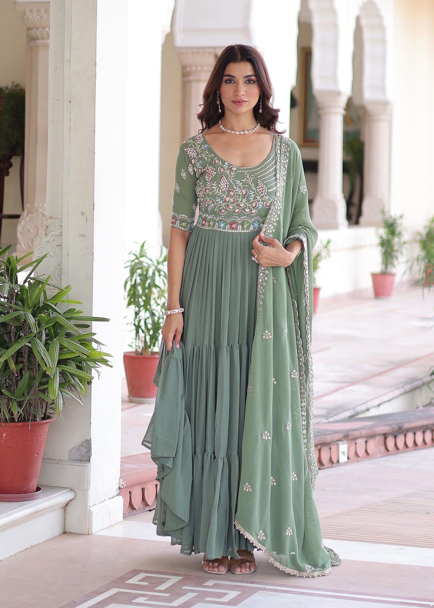 Pista Green Faux Blooming Anarkali Set