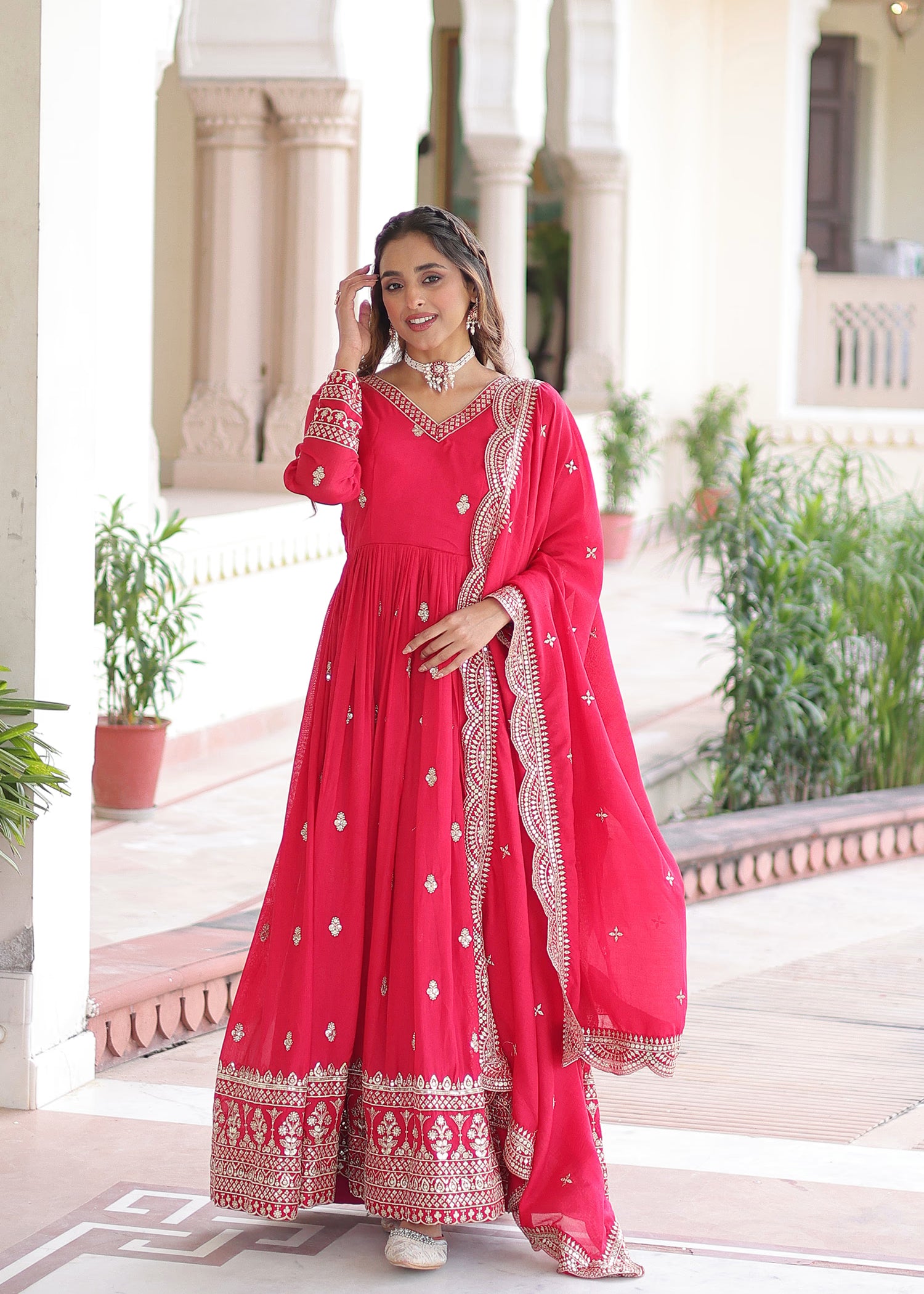 Hot Pink Vichitra Silk Embroidered Anarkali Set
